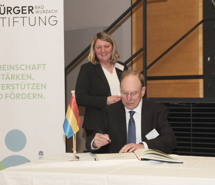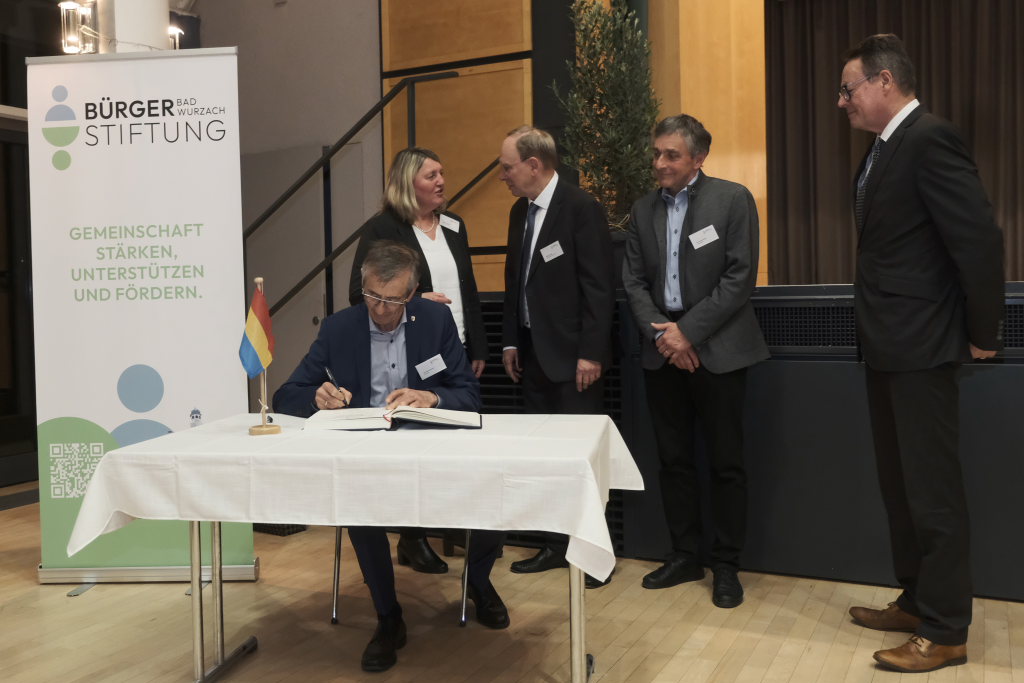 Regierungspräsident Klaus Tappeser schrieb ins Goldene Buch: „Bürgerstiftung Bad Wurzach – ein Musterbeispiel für bürgerschaftliches Engagement! Herzlichen Glückwunsch und viele Spenden!“ Dazu durften sich die fünf Initiatoren der Stiftung mit ihren Unterschriften „verewigen“.