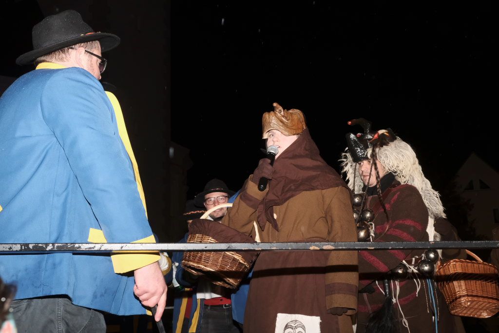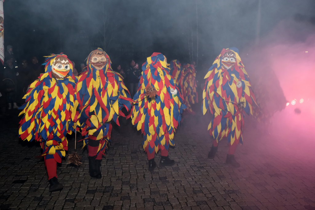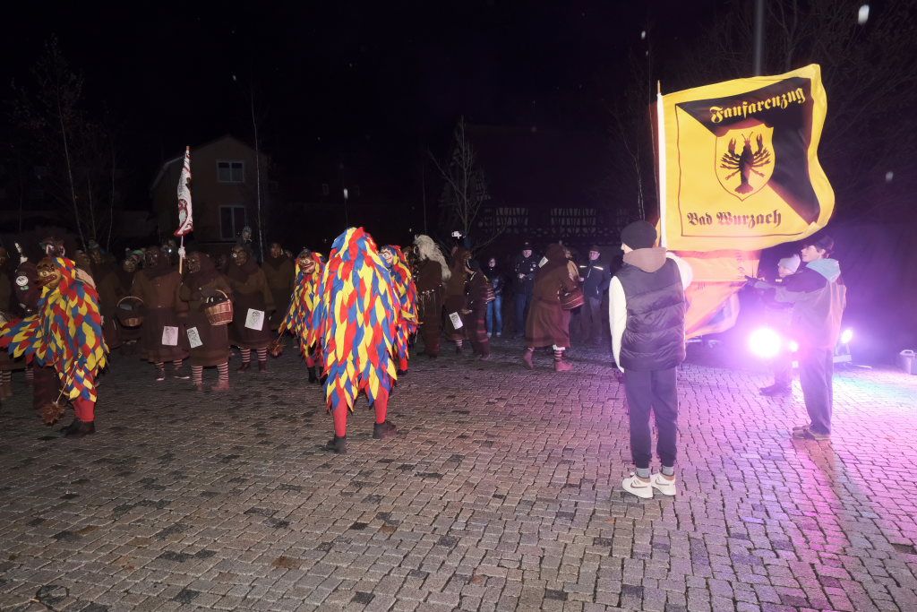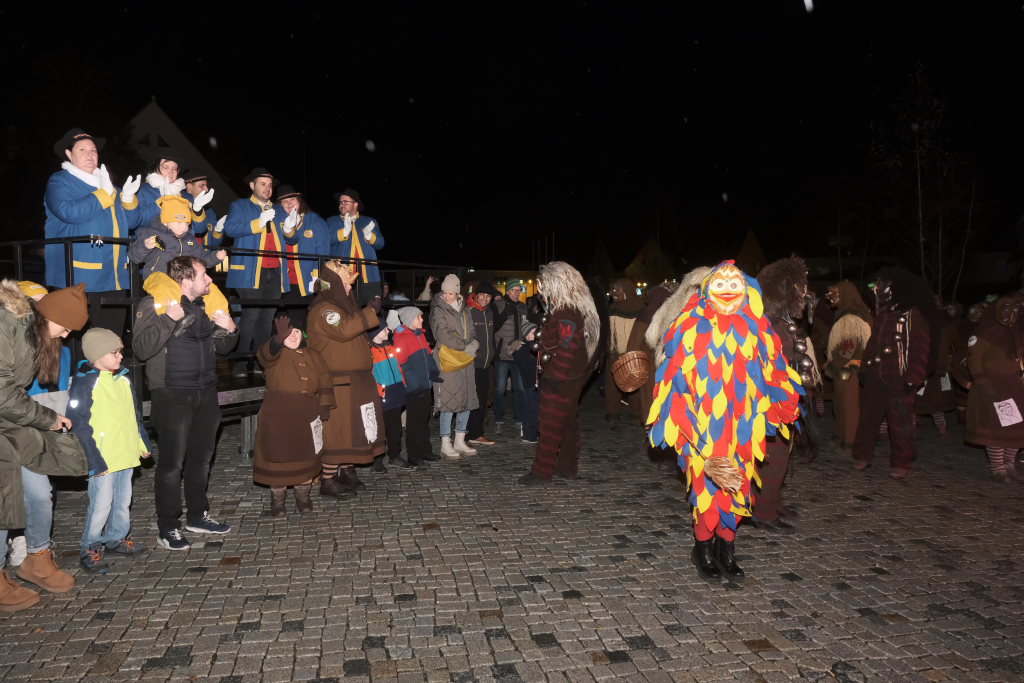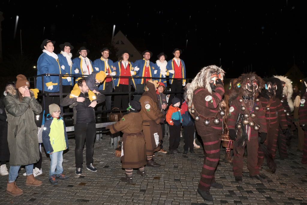 Bei einigen fetzigen Musikstücken des Fanfarenzuges wurde das G´schell von Riedmeckeler und Muetes aber doch rasch „entstaubt“ und alle Hästräger brachten sich und die Zuschauer damit für die neue Fasnetssaison in Stimmung. Auffallend viele der in den Stadtfarben blau, rot und gelb gewandete Schnepfle nahmen im Jubiläumsjahr der urkundlichen Ersterwähnung Wurzachs an dieser Fasnetseröffnung teil.