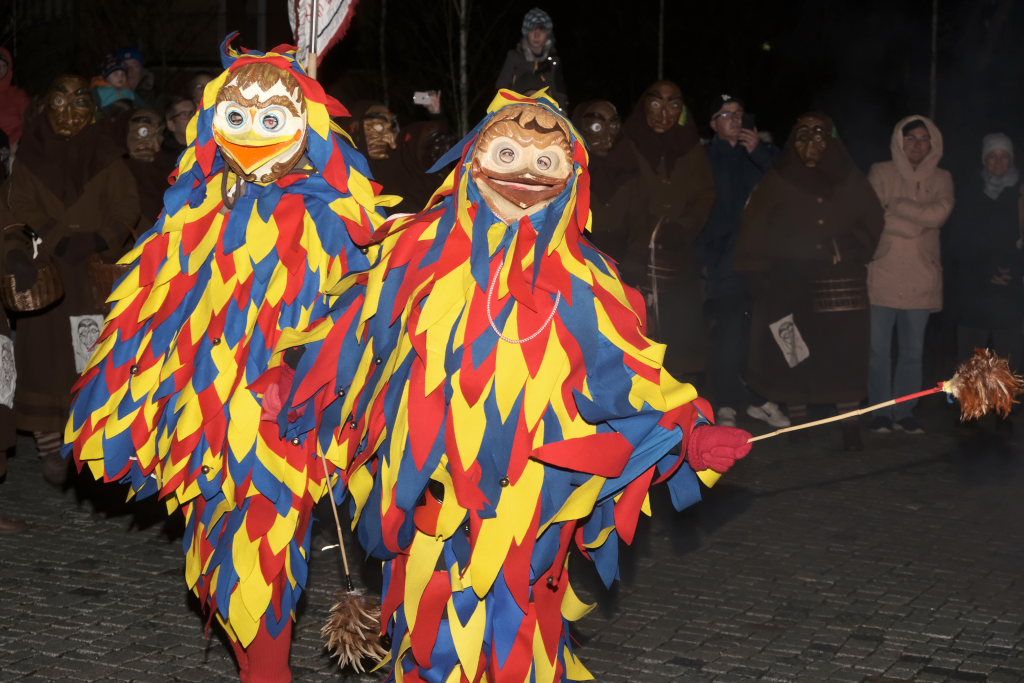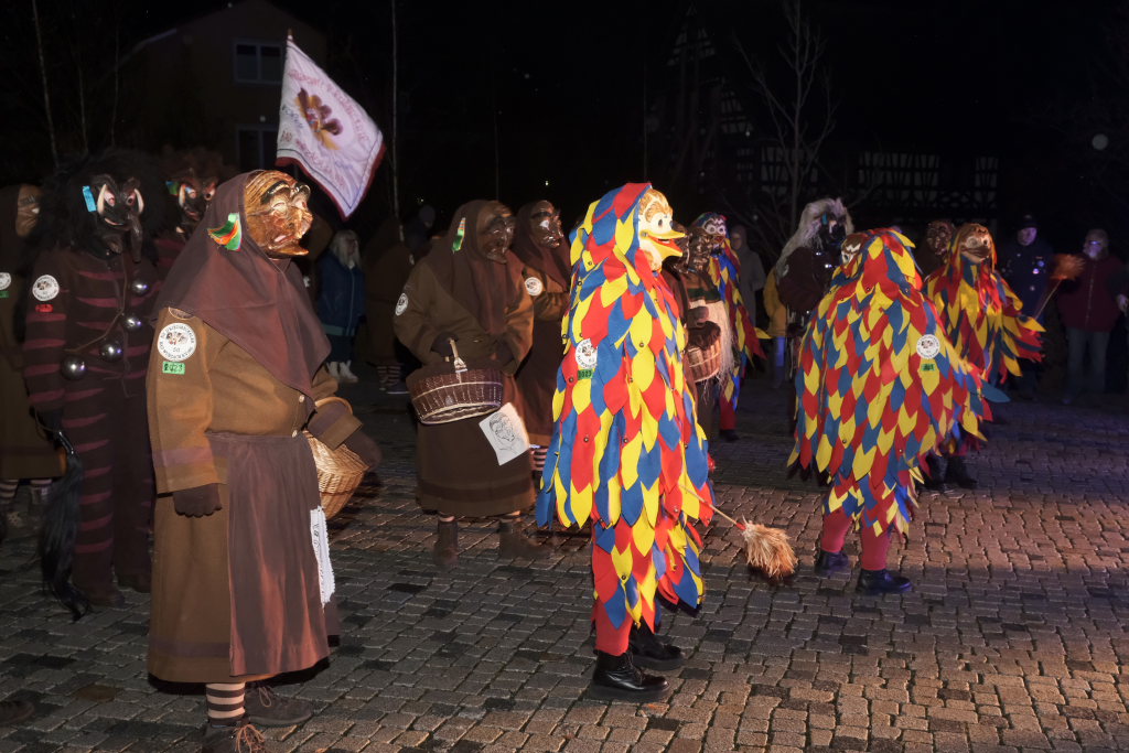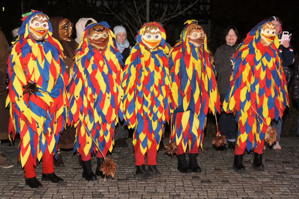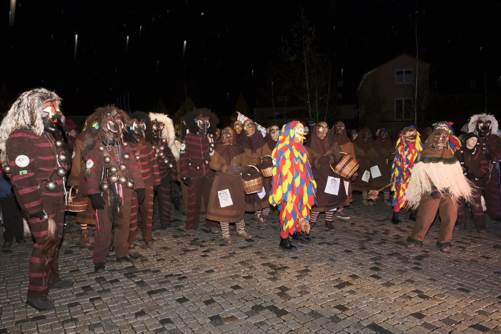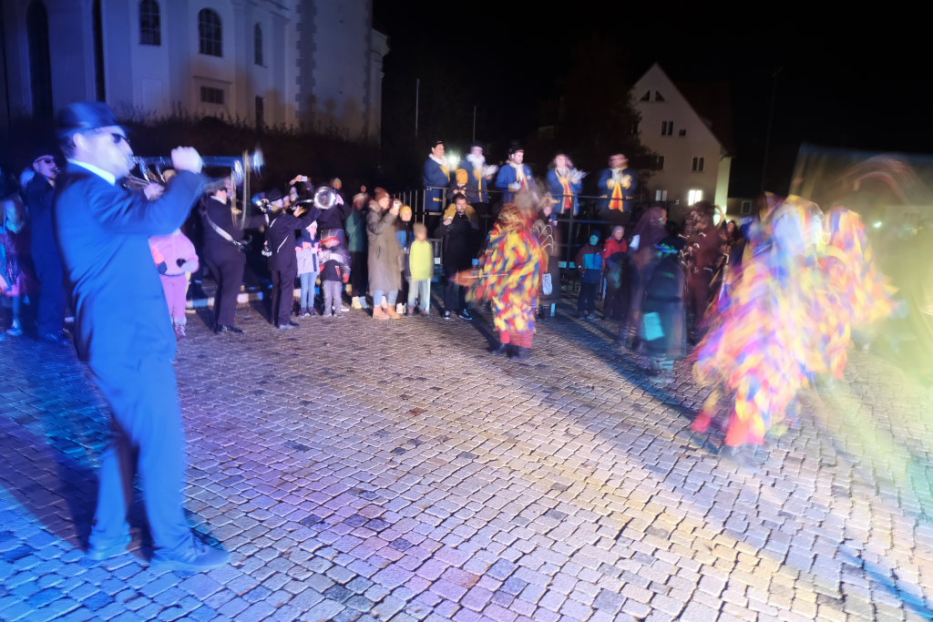 Bei einigen fetzigen Musikstücken des Fanfarenzuges wurde das G´schell von Riedmeckeler und Muetes aber doch rasch „entstaubt“ und alle Hästräger brachten sich und die Zuschauer damit für die neue Fasnetssaison in Stimmung. Auffallend viele der in den Stadtfarben blau, rot und gelb gewandete Schnepfle nahmen im Jubiläumsjahr der urkundlichen Ersterwähnung Wurzachs an dieser Fasnetseröffnung teil.