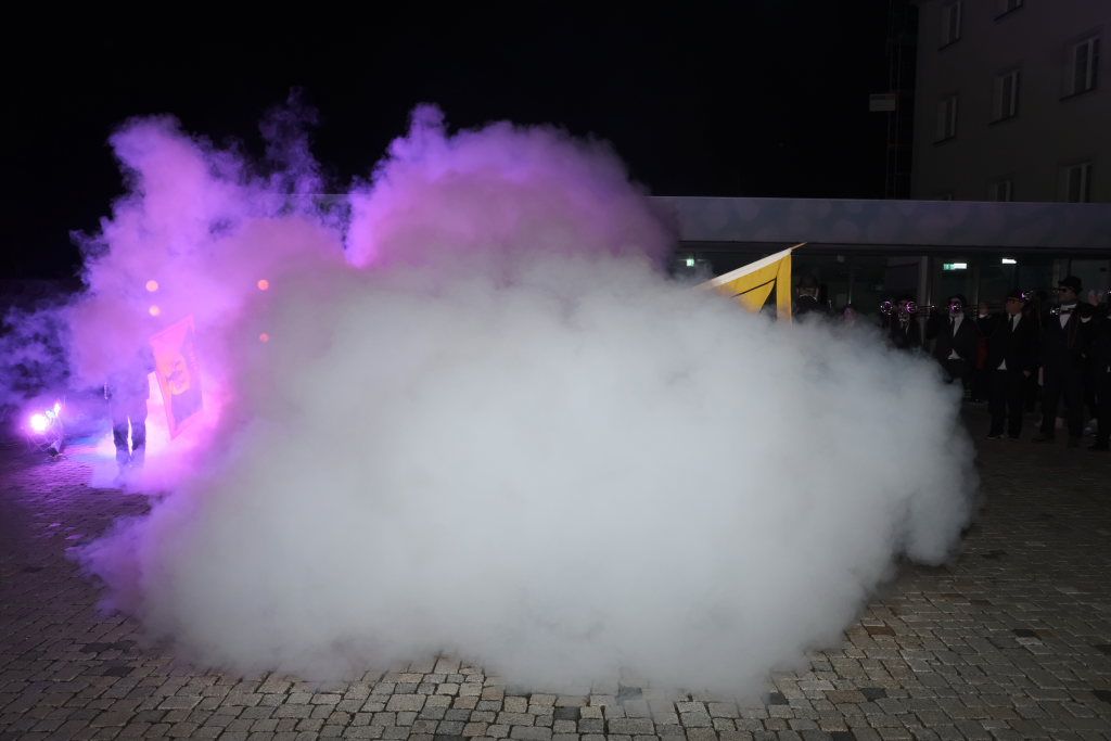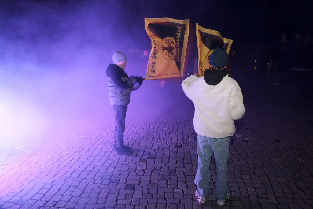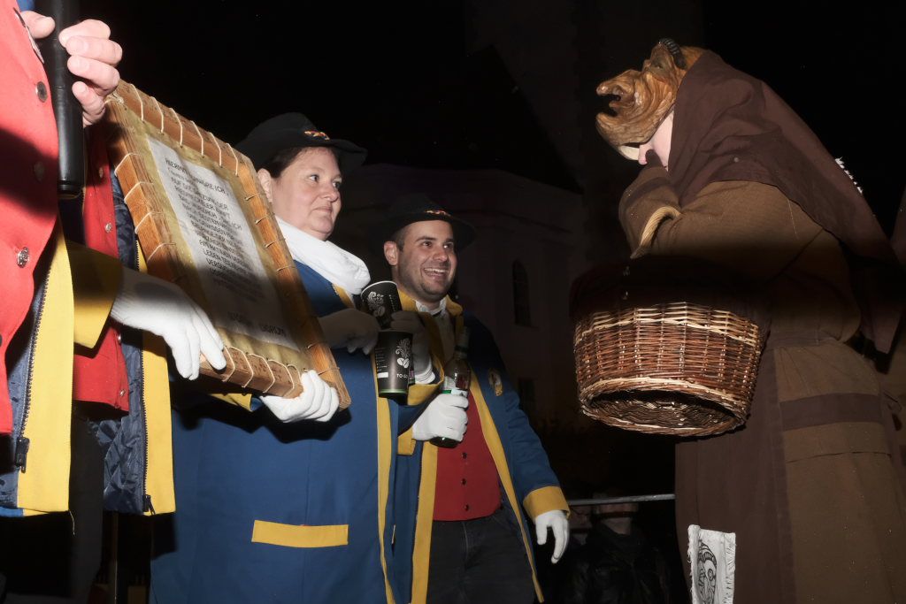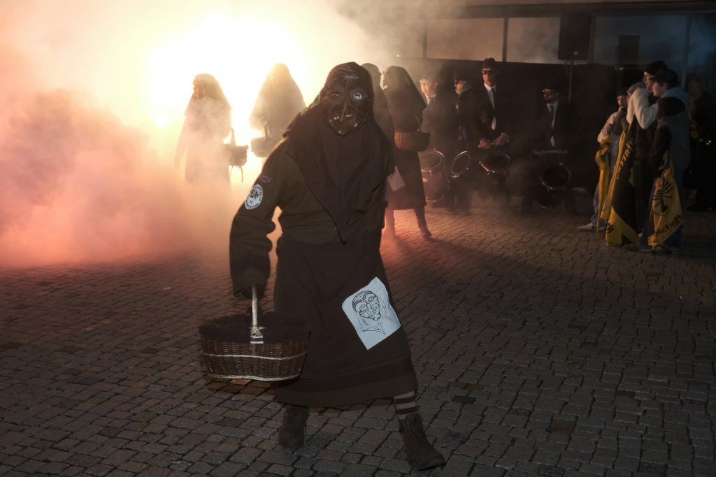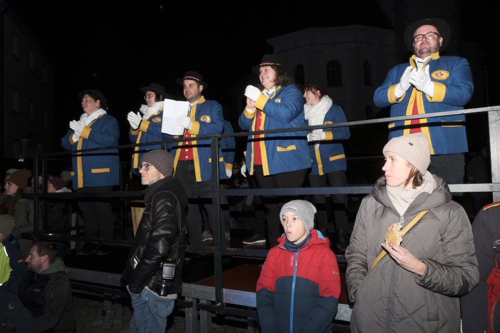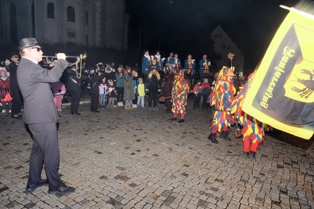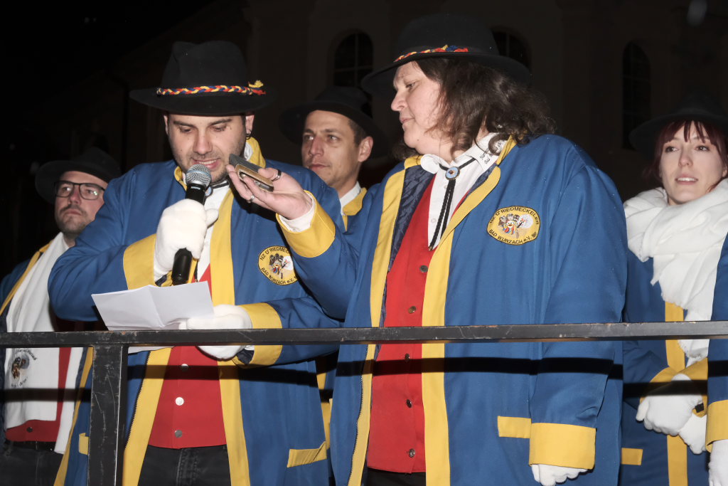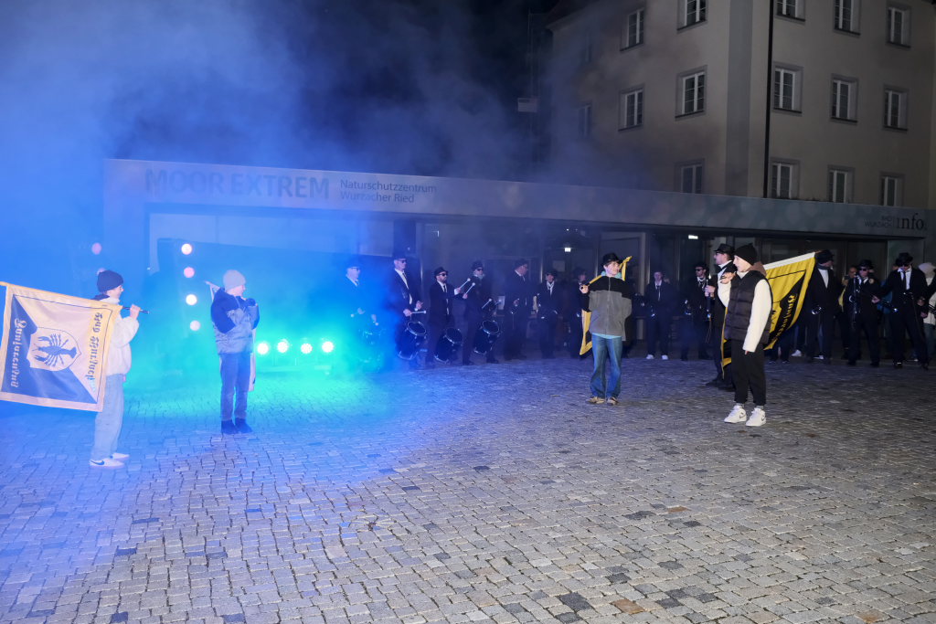 Bad Wurzach – Mit den Glockenschläge von Hells Bells, die sich an das Geläut der St. Verena- Kirchenglocken anschlossen, erfolgte am Samstagabend der Startschuss für die traditionelle Fasnetseröffnung der Bad Wurzacher Narrenzunft D´Riedmeckeler auf dem Klosterplatz.