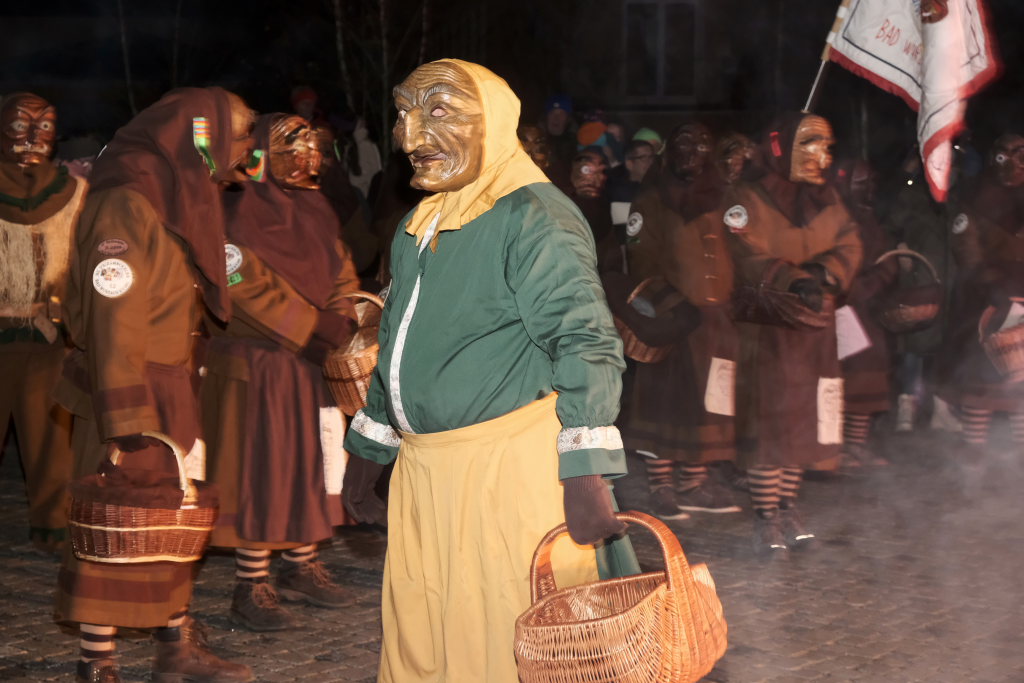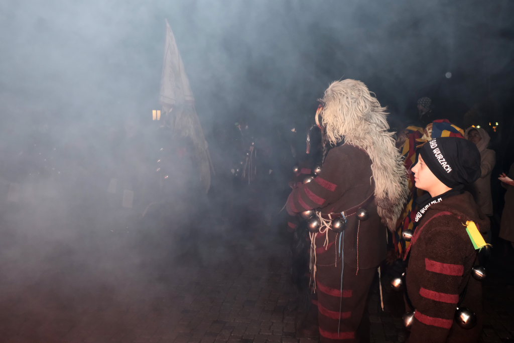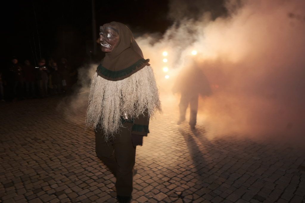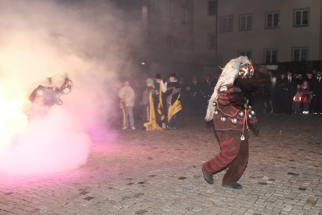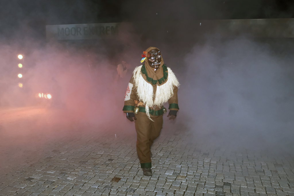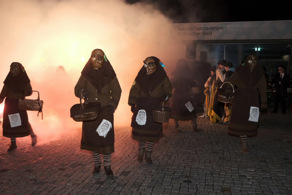 Elferrat und Zunftmeister waren die nächsten, die vor die Zuschauer traten und die kleine Bühne enterten. Von dort aus trug Zunftmeister Dominik Neher – beginnend mit dem Namensgeber der Wurzacher Zunft, dem Riedmeckeler – die traditionellen Geschichten und Sagen der einzelnen Narrenfiguren vor, während diese aus dem künstlichem Nebel ins Rampenlicht vor die kleine Bühne zu Füßen von St. Verena und Maria Rosengarten traten. Riedmeckeler, Moorweibla, Burgfrau, Schnepfle – sie alle wirkten noch etwas ungelenk und verhalten, dennoch aber hochmotiviert und auch das wilde Muetesheer musste sich erst noch an die wiedergewonnene Freiheit gewöhnen.