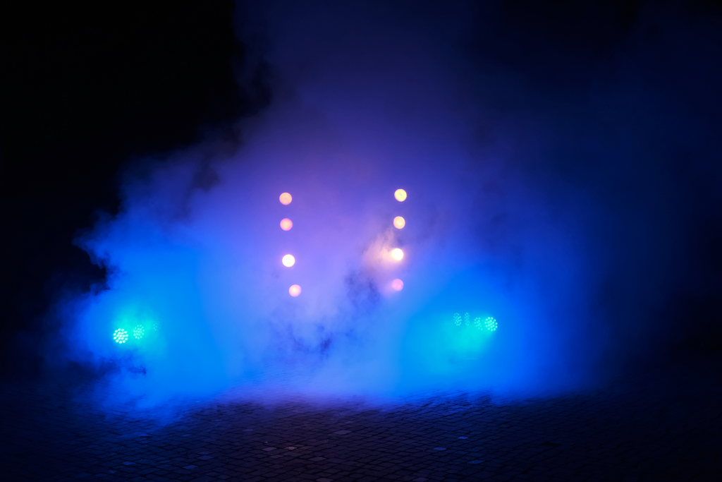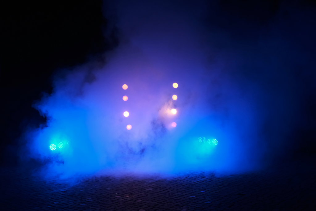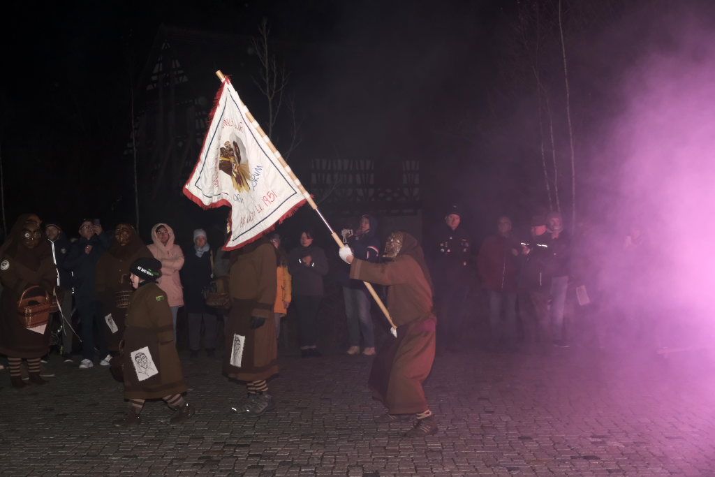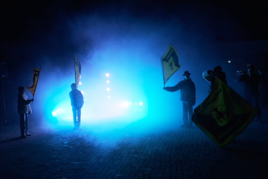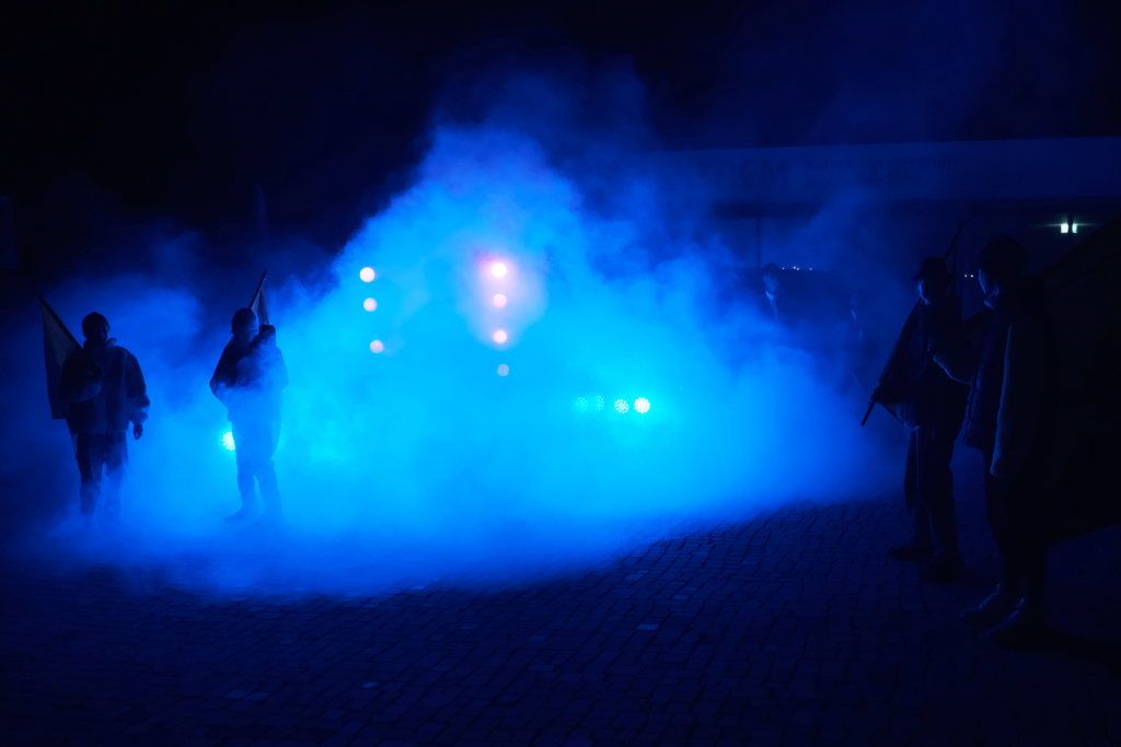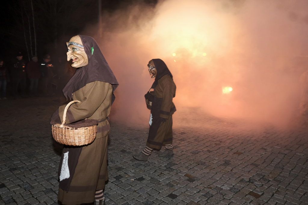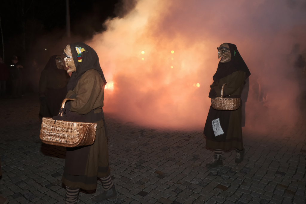 Elferrat und Zunftmeister waren die nächsten, die vor die Zuschauer traten und die kleine Bühne enterten. Von dort aus trug Zunftmeister Dominik Neher – beginnend mit dem Namensgeber der Wurzacher Zunft, dem Riedmeckeler – die traditionellen Geschichten und Sagen der einzelnen Narrenfiguren vor, während diese aus dem künstlichem Nebel ins Rampenlicht vor die kleine Bühne zu Füßen von St. Verena und Maria Rosengarten traten. Riedmeckeler, Moorweibla, Burgfrau, Schnepfle – sie alle wirkten noch etwas ungelenk und verhalten, dennoch aber hochmotiviert und auch das wilde Muetesheer musste sich erst noch an die wiedergewonnene Freiheit gewöhnen.