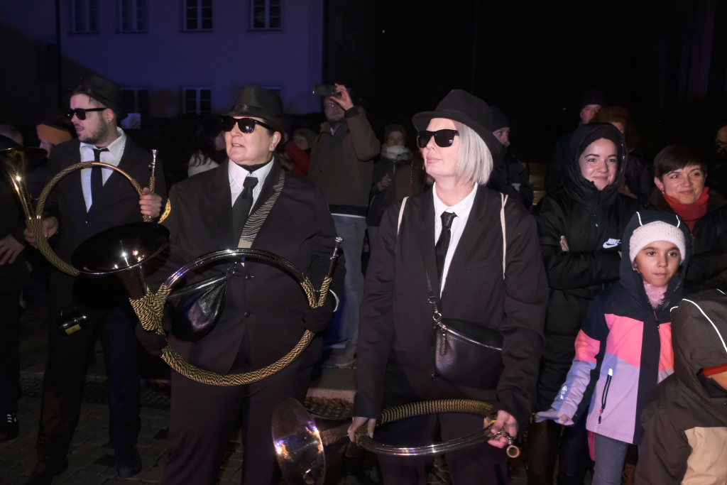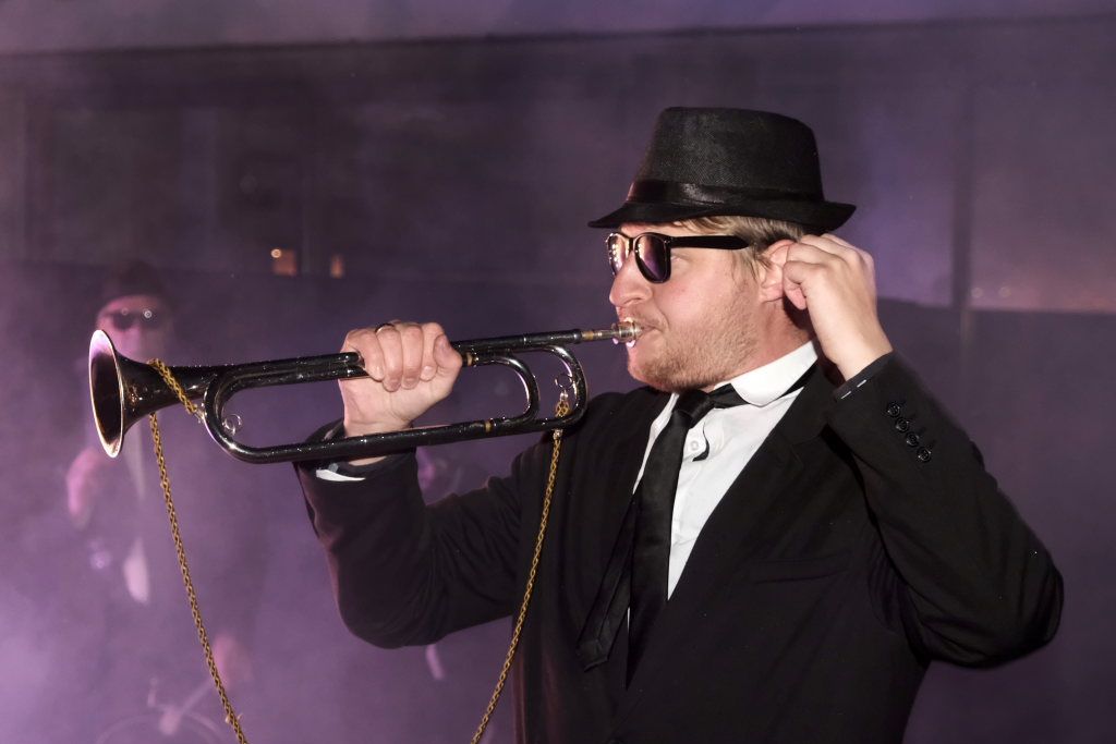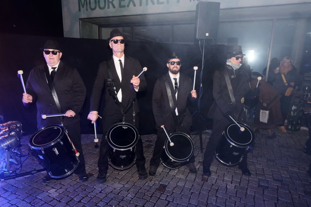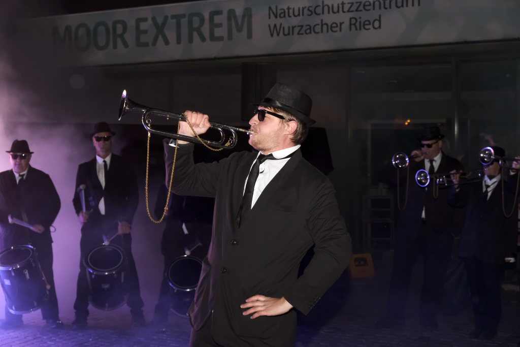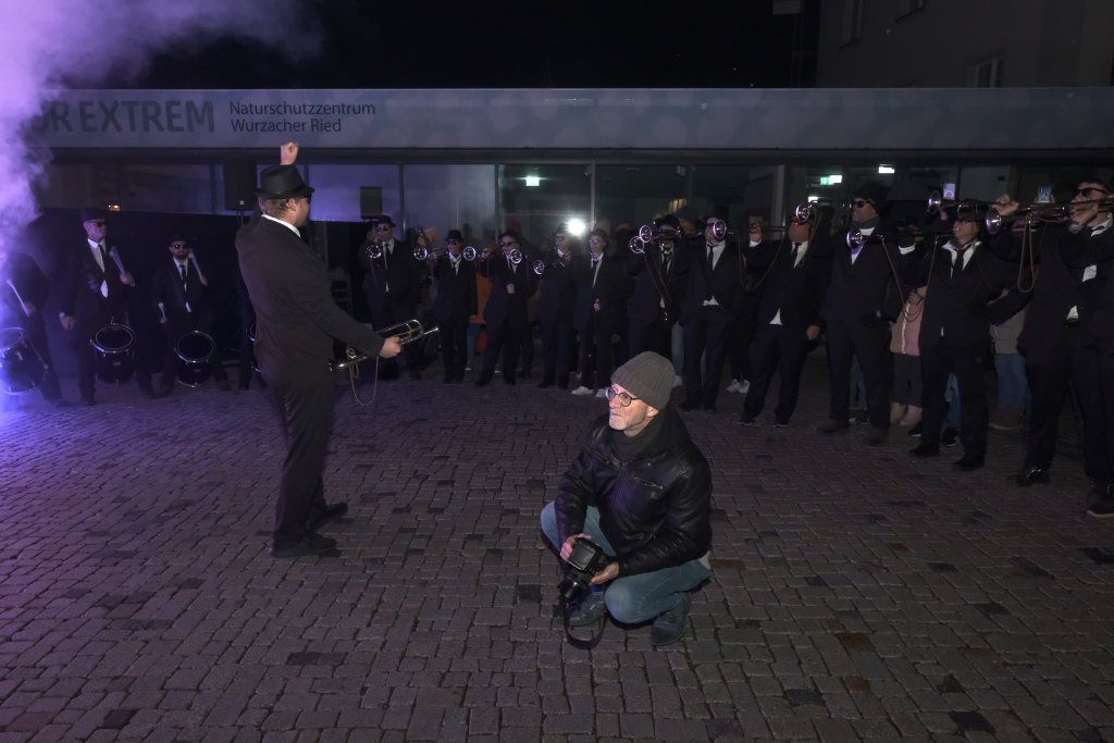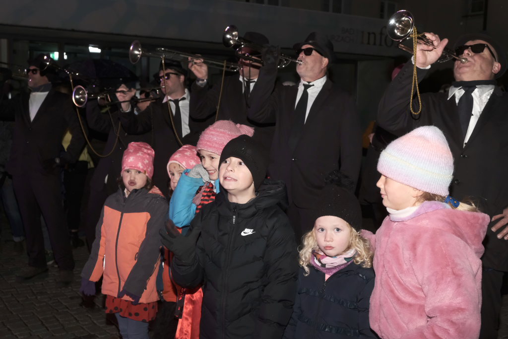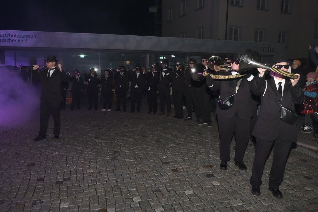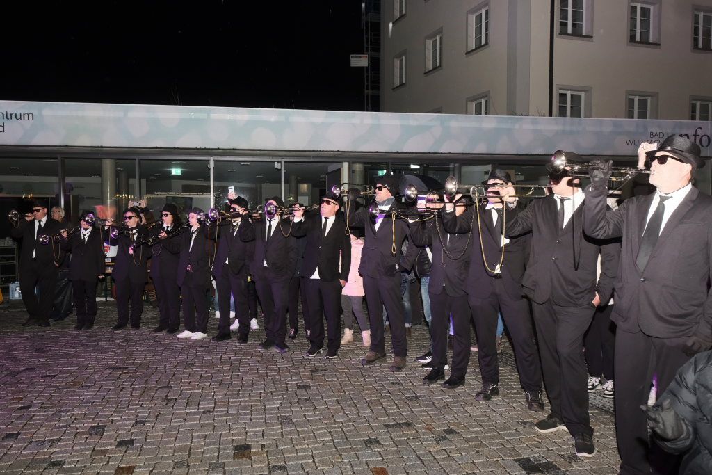 Der Fanfarenzug blies die Fünfte Jahreszeit mit einigen Musikstücken an – in diesem Jahr in Blues-Brothers–Montur. Zahlreichen Zuschauer – darunter auch sehr vielen Kinder – hatten sich auf dem Areal vor der Bad Wurzach-Info versammelt.
