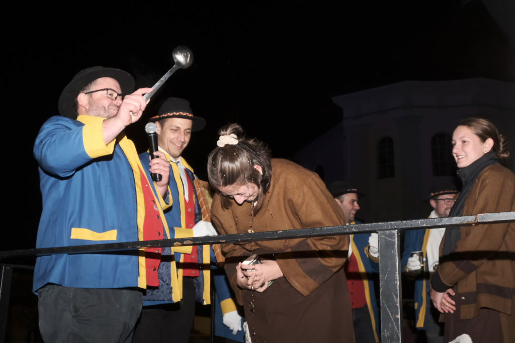 Die Einstimmung auf die neue Fasnet war jedenfalls – trotz des einsetzenden Regens – schon einmal sehr vielversprechend. Nass (gemacht) wurden dann auch die Neu-Narren, die nach dem Schwur auf die Vereinssatzung – zunächst mit einem Spezialgetränk von innen angefeuchtet – noch mit einer Schöpfkelle über das Narrenhaupt geschütteten Wassers ihre Aufnahme in den Kreis der Wurzacher Narren feiern durften.
