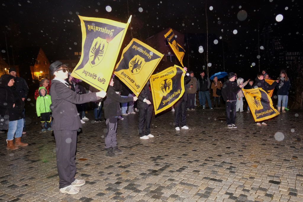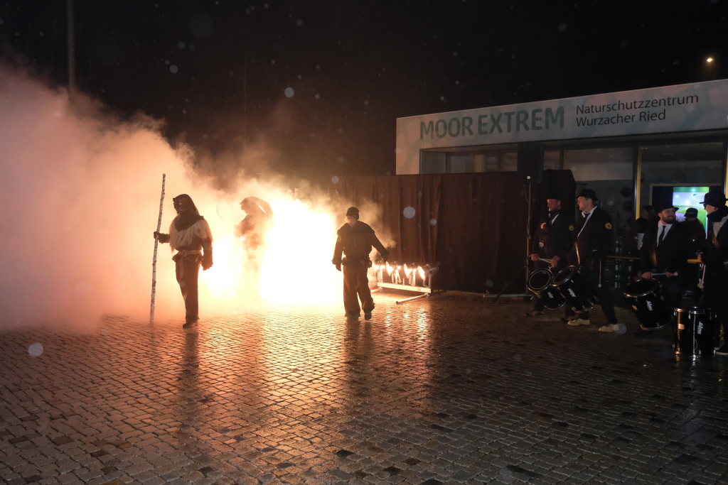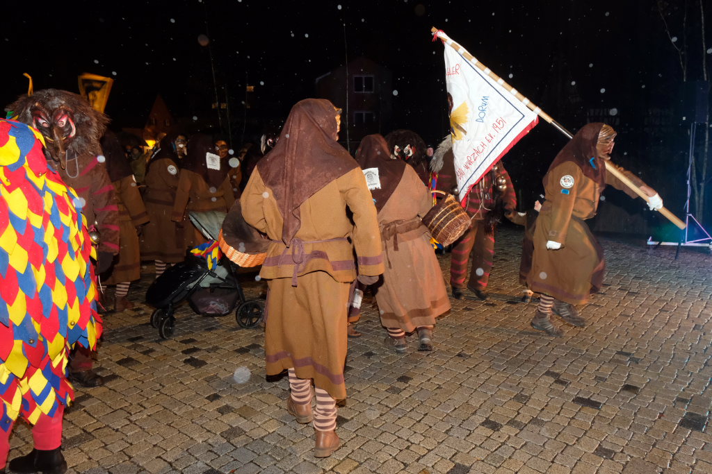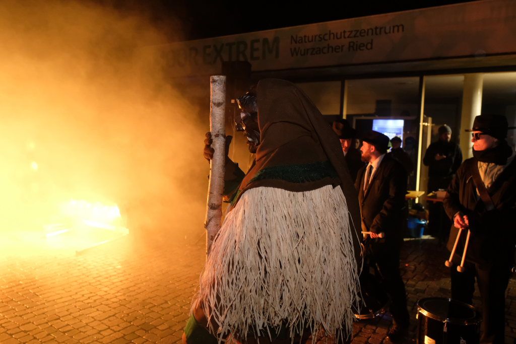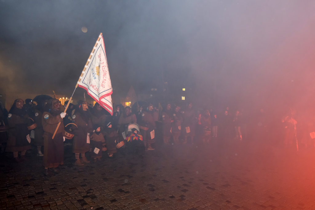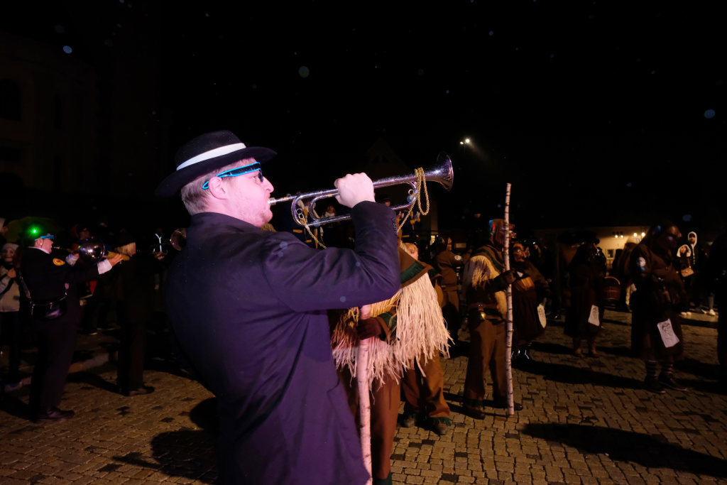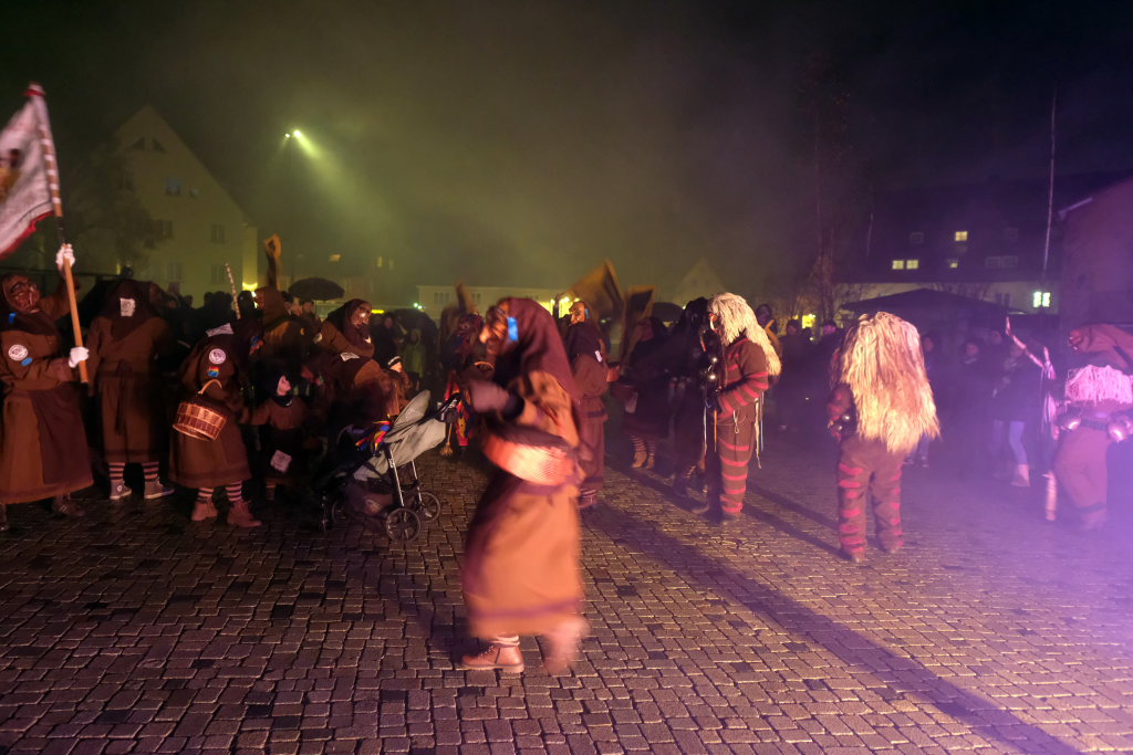 Den Abschluss machten dann die wilden Muetes, die an diesem Abend wohl dem Regen am besten trotzten, da sie die zahlenmäßig größte Gruppe bildeten. Bei einigen fetzigen Musikstücken des Fanfarenzuges wurde das Gschell von Riedmeckeler und Muetes aber doch noch „entstaubt“ und die Hästräger brachten sich damit für die neue Fasnetssaison in Stimmung, die dieses Mal am 5. März mit der Aschermittwoch-Geldbeutelwäsche und dem letzten Arbeitseinsatz enden wird.