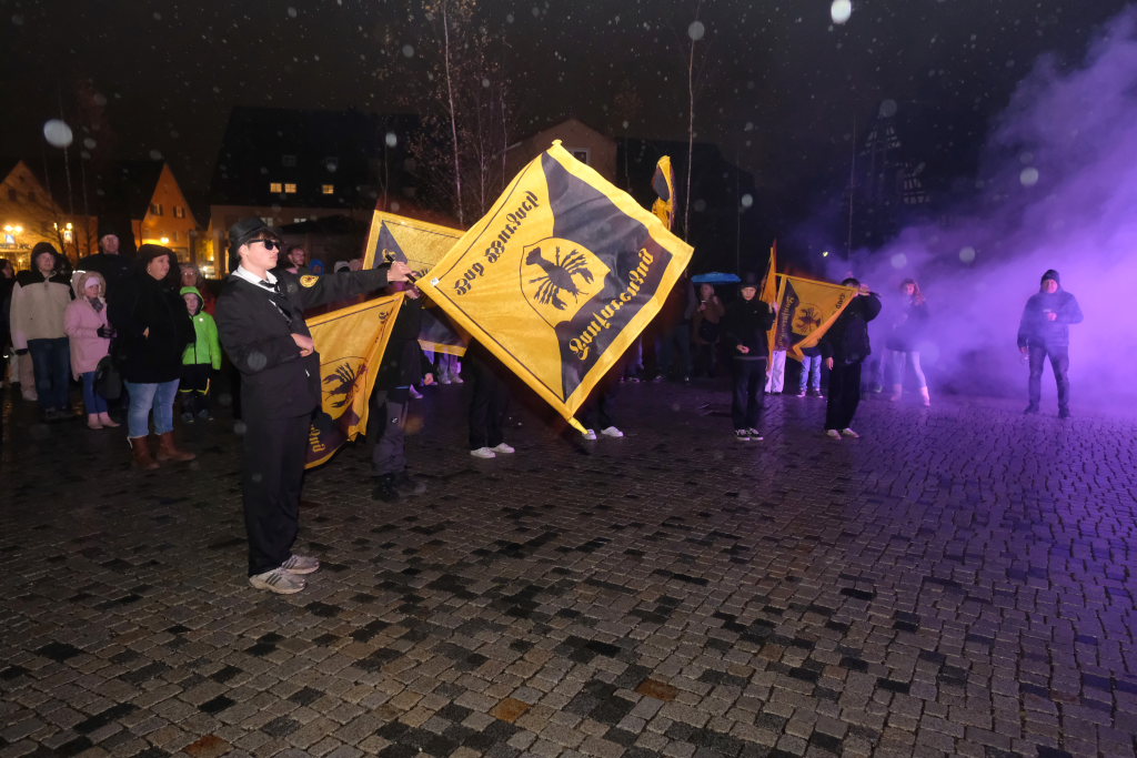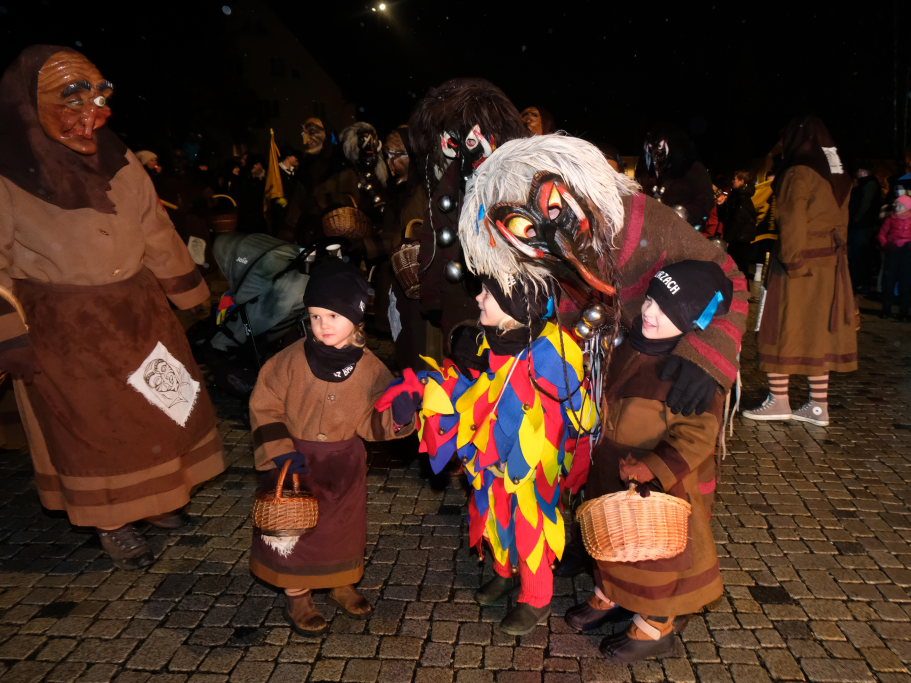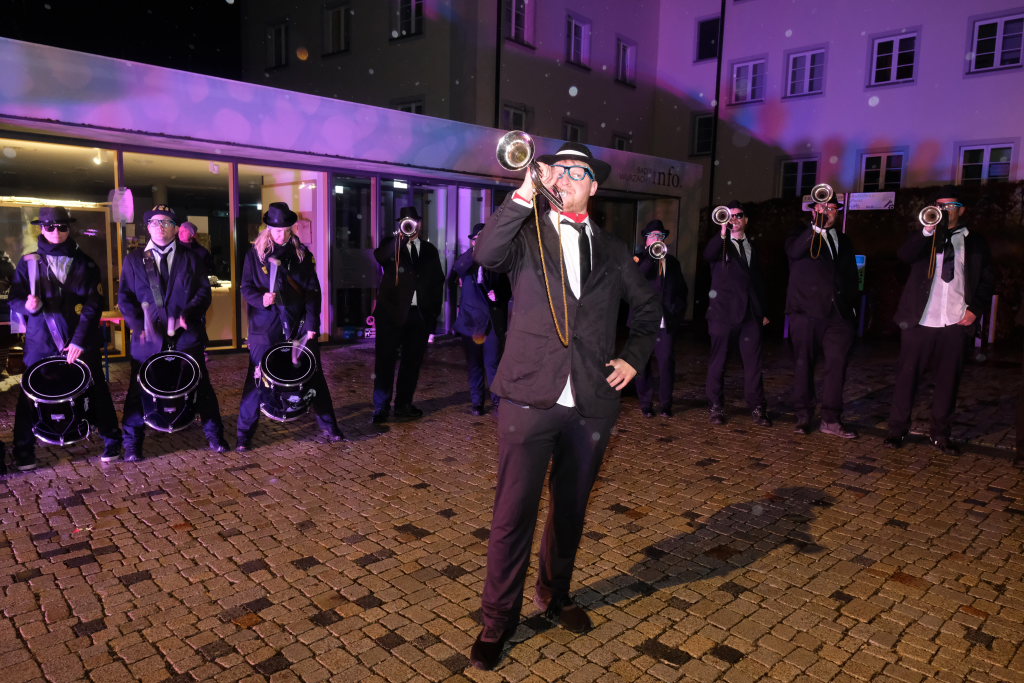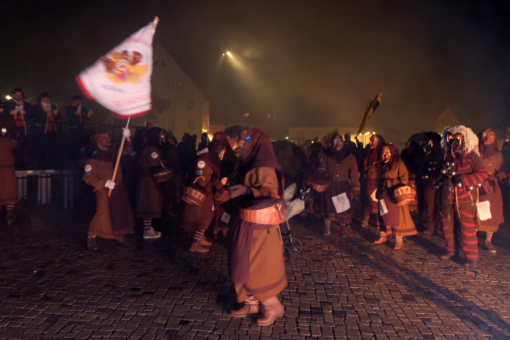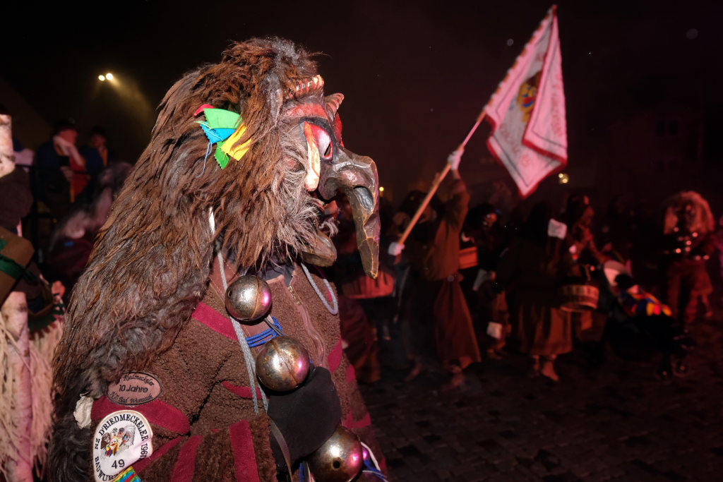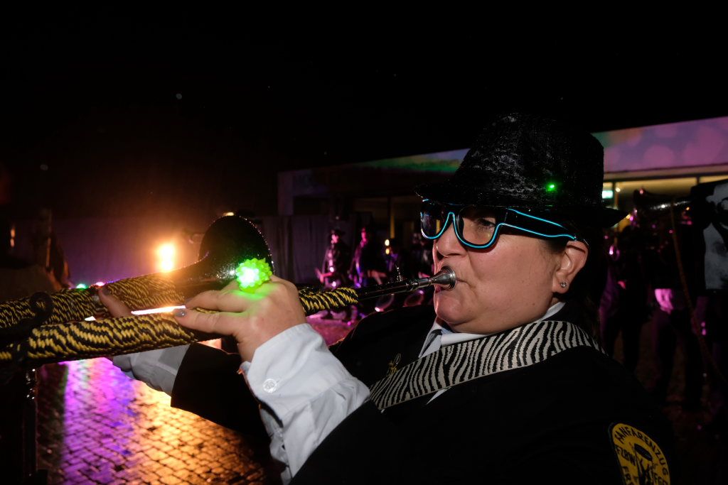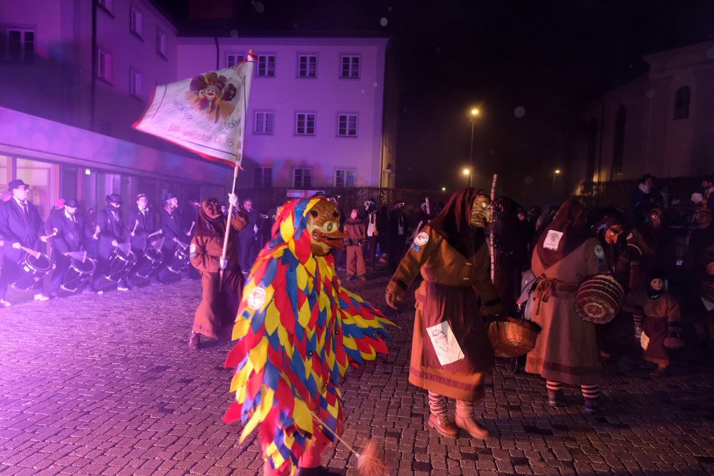 Den Abschluss machten dann die wilden Muetes, die an diesem Abend wohl dem Regen am besten trotzten, da sie die zahlenmäßig größte Gruppe bildeten. Bei einigen fetzigen Musikstücken des Fanfarenzuges wurde das Gschell von Riedmeckeler und Muetes aber doch noch „entstaubt“ und die Hästräger brachten sich damit für die neue Fasnetssaison in Stimmung, die dieses Mal am 5. März mit der Aschermittwoch-Geldbeutelwäsche und dem letzten Arbeitseinsatz enden wird.