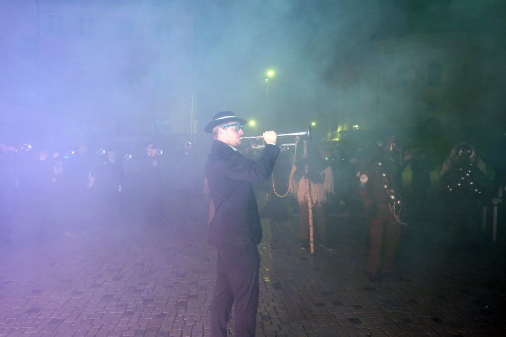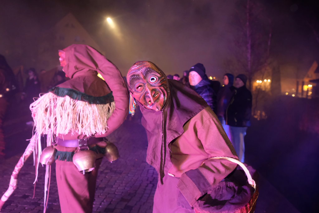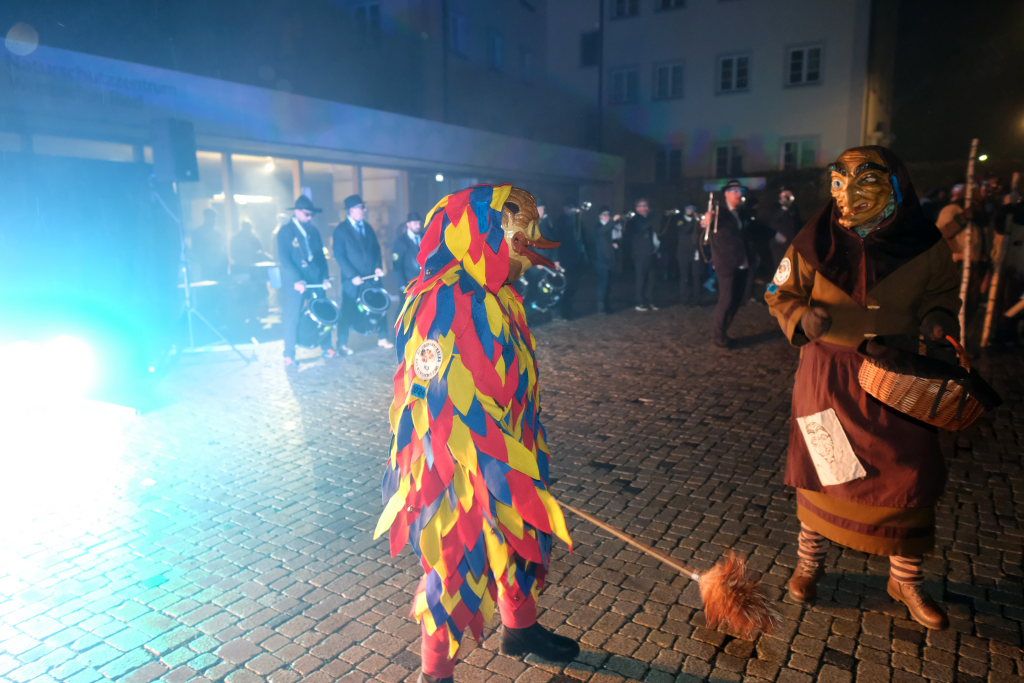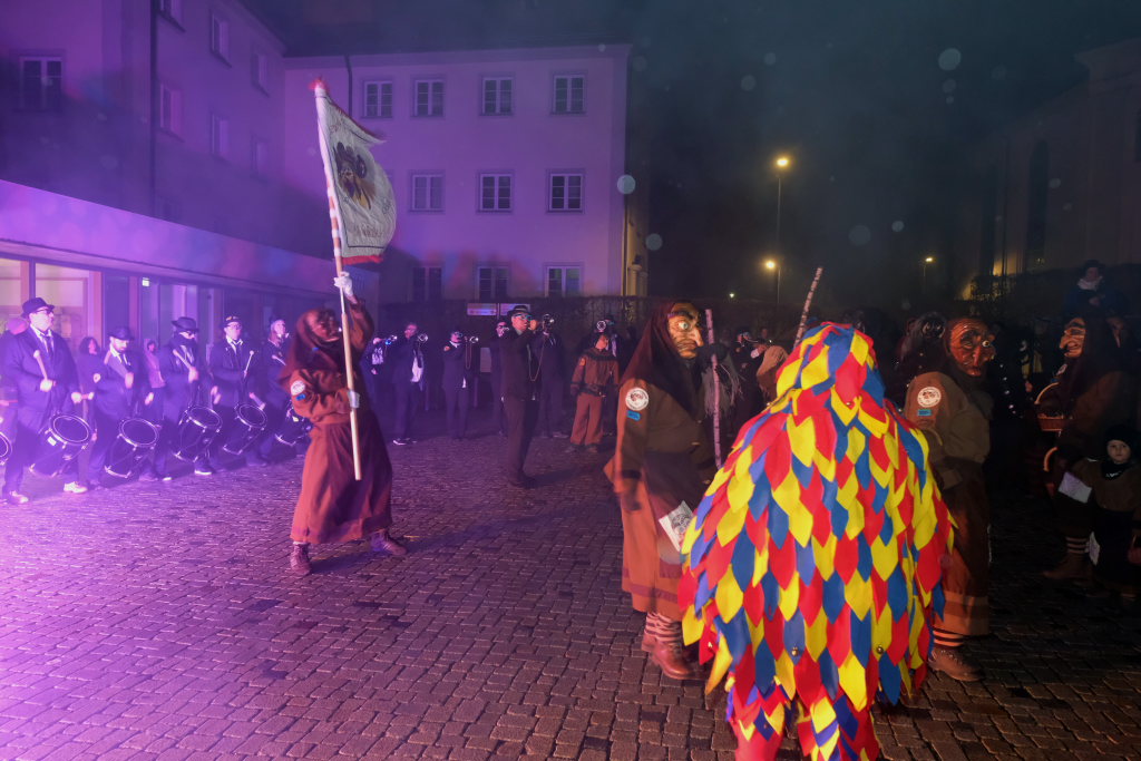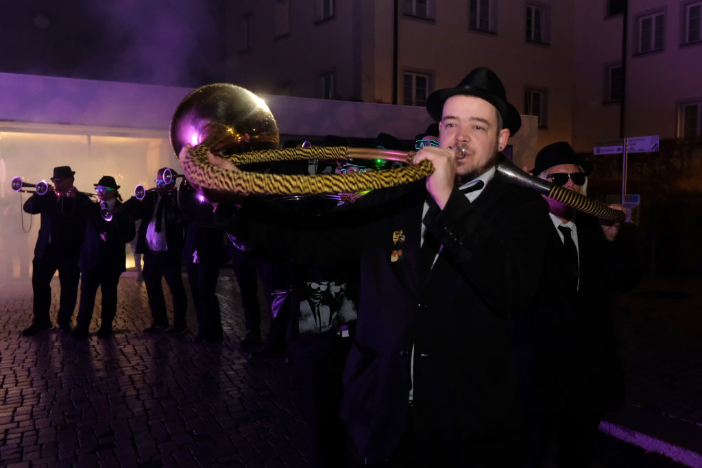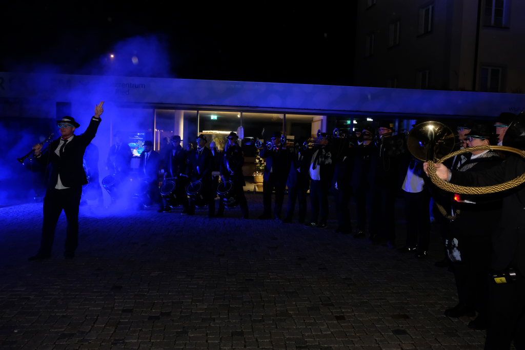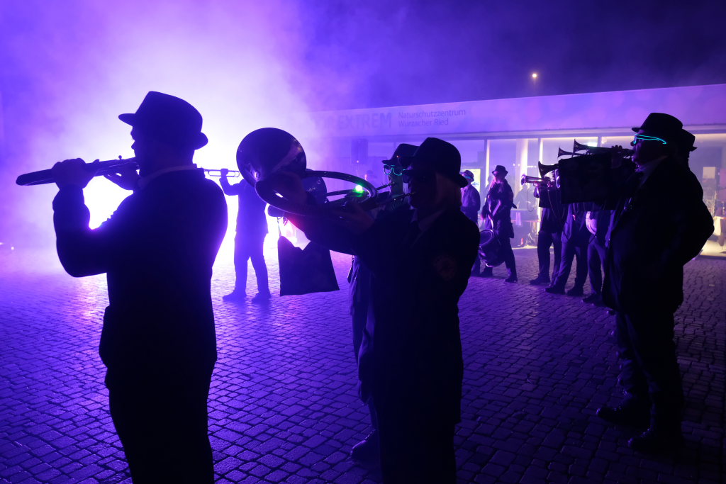 Den Abschluss machten dann die wilden Muetes, die an diesem Abend wohl dem Regen am besten trotzten, da sie die zahlenmäßig größte Gruppe bildeten. Bei einigen fetzigen Musikstücken des Fanfarenzuges wurde das Gschell von Riedmeckeler und Muetes aber doch noch „entstaubt“ und die Hästräger brachten sich damit für die neue Fasnetssaison in Stimmung, die dieses Mal am 5. März mit der Aschermittwoch-Geldbeutelwäsche und dem letzten Arbeitseinsatz enden wird.