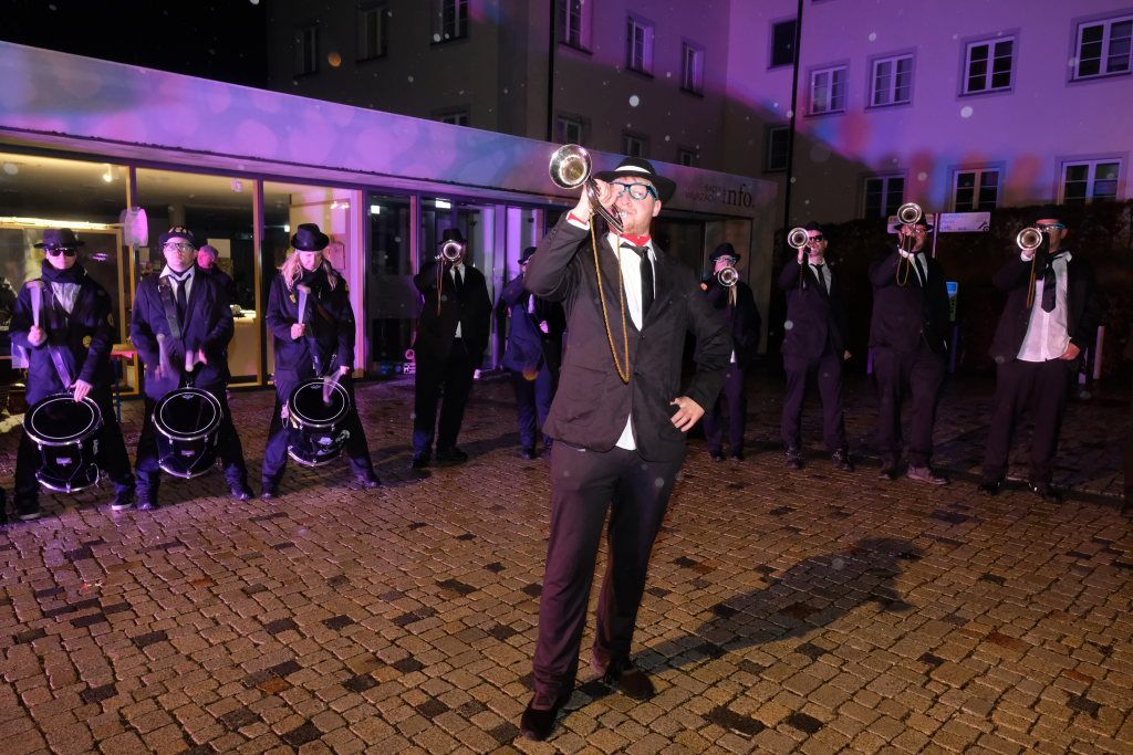 Bad Wurzach – Lange ließ der Regen im November auf sich warten, doch ausgerechnet exakt als die Kirchenglocken von St. Verena an diesem 11.11. zum Gebets-Läuten ansetzten und der Fanfarenzug durch die „Nebelpforte“ bei der Bad-Wurzach-Info schritt, um die Fünfte Jahreszeit einzuläuten, öffnete auch der Himmel seine Schleusen.