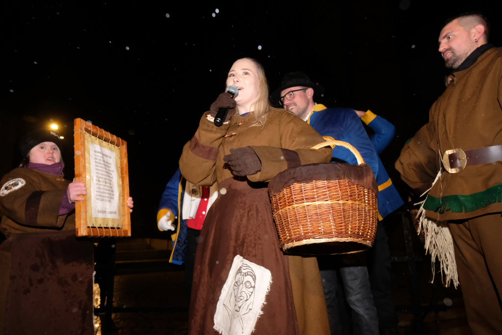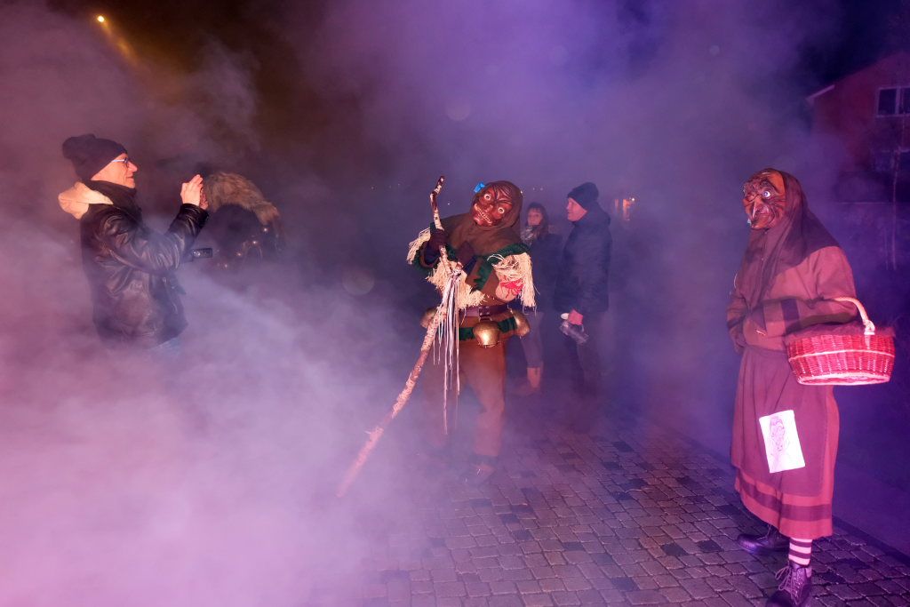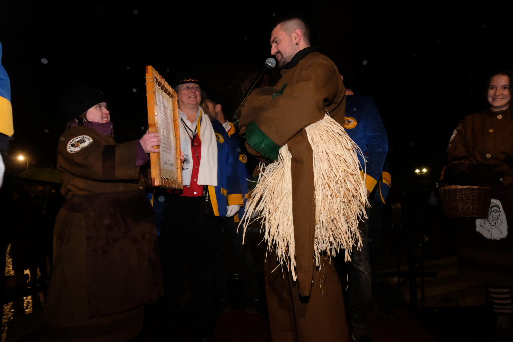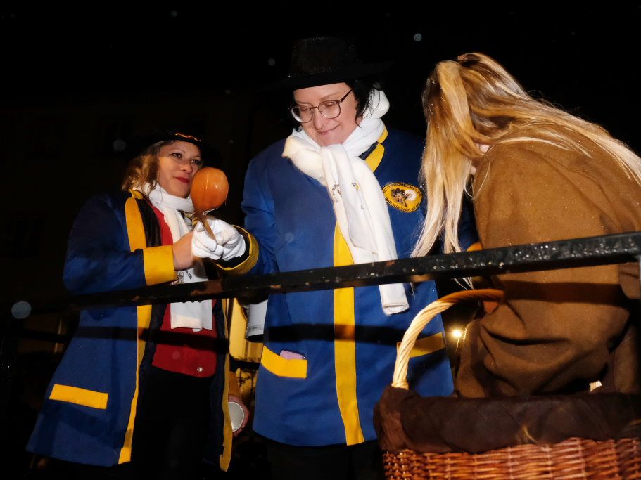 Zunftmeister Dominik Neher trug die traditionellen Geschichten und Sagen zu den einzelnen Narrenfiguren vor, während diese dann durch einen Vorhang aus Stoff und künstlichem Nebel ins Rampenlicht vor die kleine Bühne zu Füßen von St. Verena und Maria Rosengarten traten. Beginnend mit dem Namensgeber der Zunft, dem Riedmeckeler, dem das Moorweibla, die Burgfrau und das Schnepfle in seinem in den Stadtfarben gehaltenen „Federkleid“ folgten. Mit bei den Moorweibla dabei: Die Zunftfahne, auf die später die Täuflinge der Zunft die Treue schwören durften.