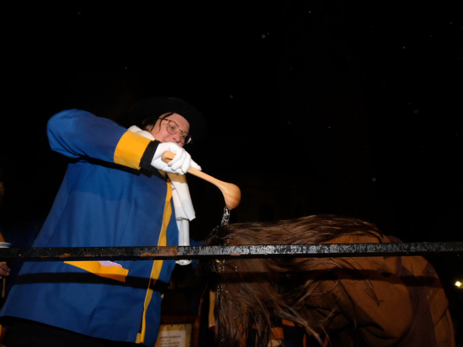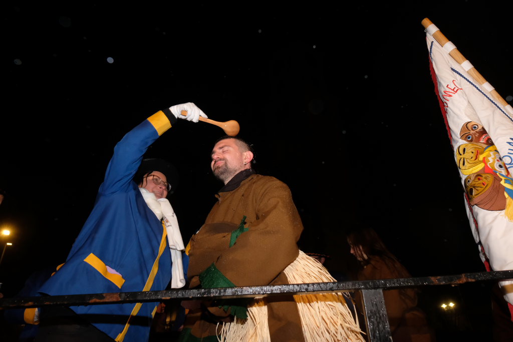 Mona Schwarz, Michael Fuchs und Lucie Schütt waren die diesjährigen Neuaufnahmen. Die Täuflinge bekamen dazu eine Kopfdusche, die in diesem Jahr eigentlich beinahe überflüssig war, mit einem Schöpflöffel aus Holz, aus einem Eimer gefüllt mit feinstem Achwasser. Bevor sie einen kräftigen Schluck eines Spezialgebräus und einen ordentlichen Schluck von einem Hochprozentigen zu sich nehmen durften, mussten sie die Eidesformel auf den Narrenverein schwören. Darin heißt es unter anderem: „Hiermit schwöre ich, dass ich nach bestem Wissen und Gewissen für die Belange der NZ Bad Wurzach einstehe, aktiv am Vereinsleben teilnehme und versuchen werde, ein vorbildliches Mitglied zu sein“. Mit einem Kuss auf die Vereinsfahne wurde ihre Mitgliedschaft endgültig besiegelt.