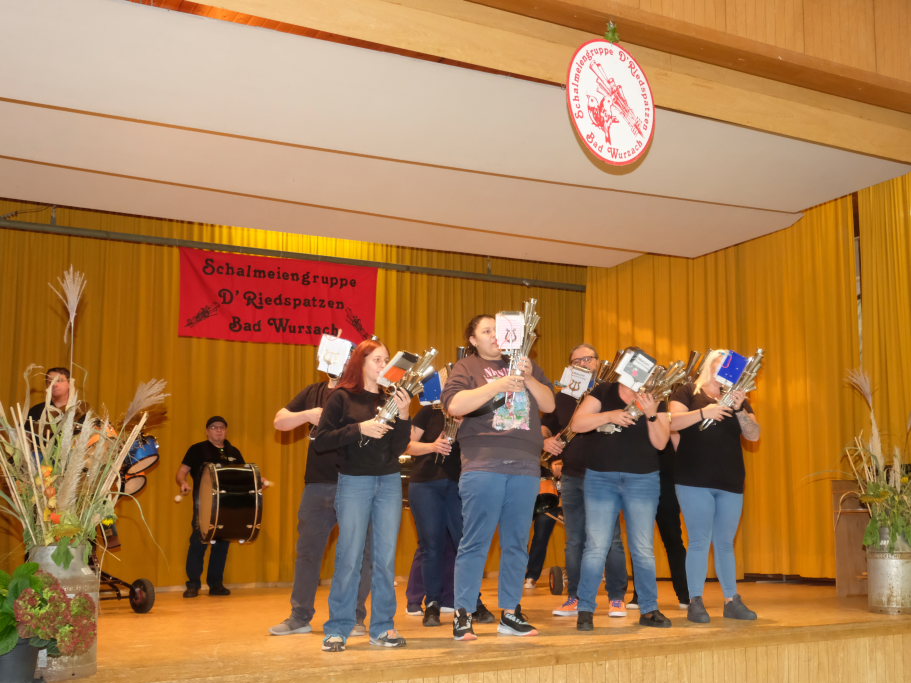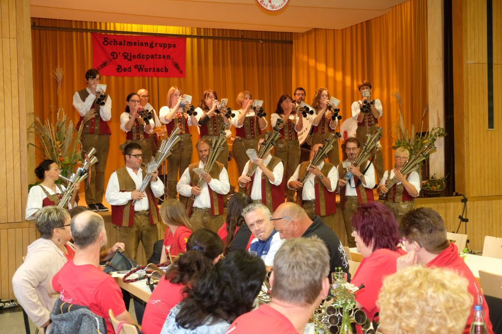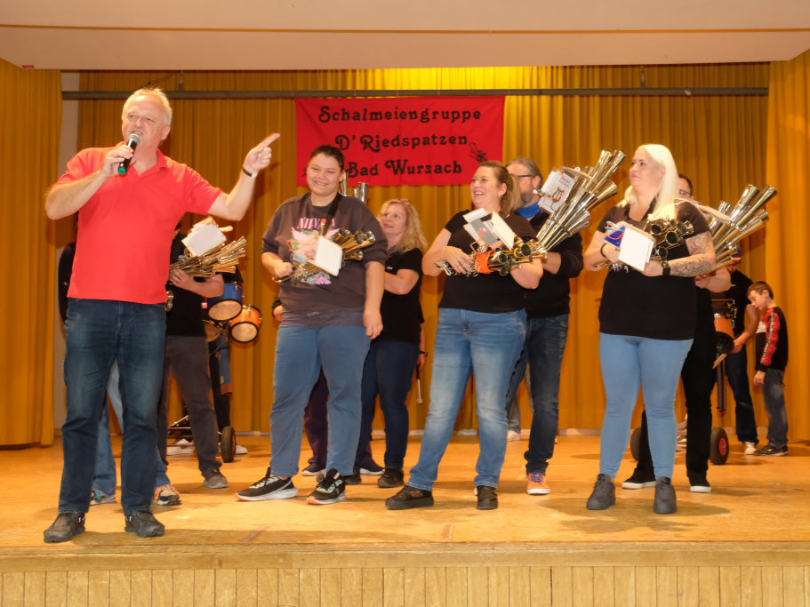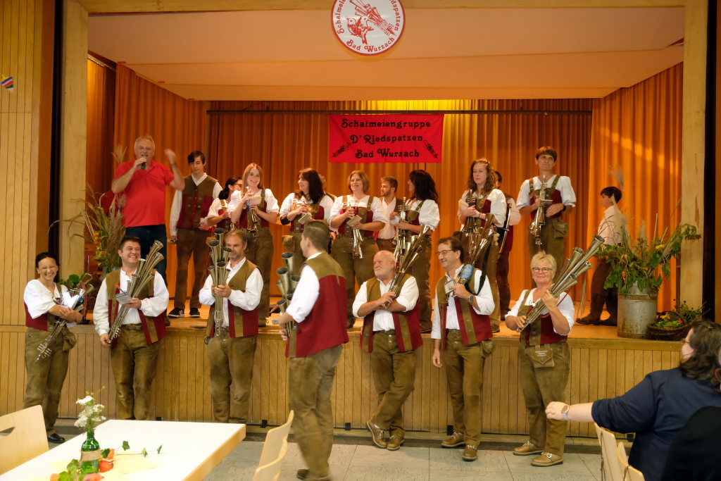Wie groß auch die Wertschätzung der Riedspatzen innerhalb der „Schalmeien-Gemeinde“ ist, zeigt die Tatsache, dass nicht weniger als elf Schalmeiengruppen aus ganz Oberschwaben und dem Allgäu etwa aus Aulendorf, Bad Buchau, Kisslegg oder Isny sich nicht lange bitten ließen, beim Jubiläum aufzutreten, plus dem schon erwähnten Fanfarenzug aus Bad Wurzach. Was natürlich für Lahl & Co. schon zu einer Herkules-Aufgabe wurde, allen zu ihrem musikalischen Recht zu verhelfen, zumal bei der großen Fete am Abend auch noch eine Band für Partystimmung sorgte.