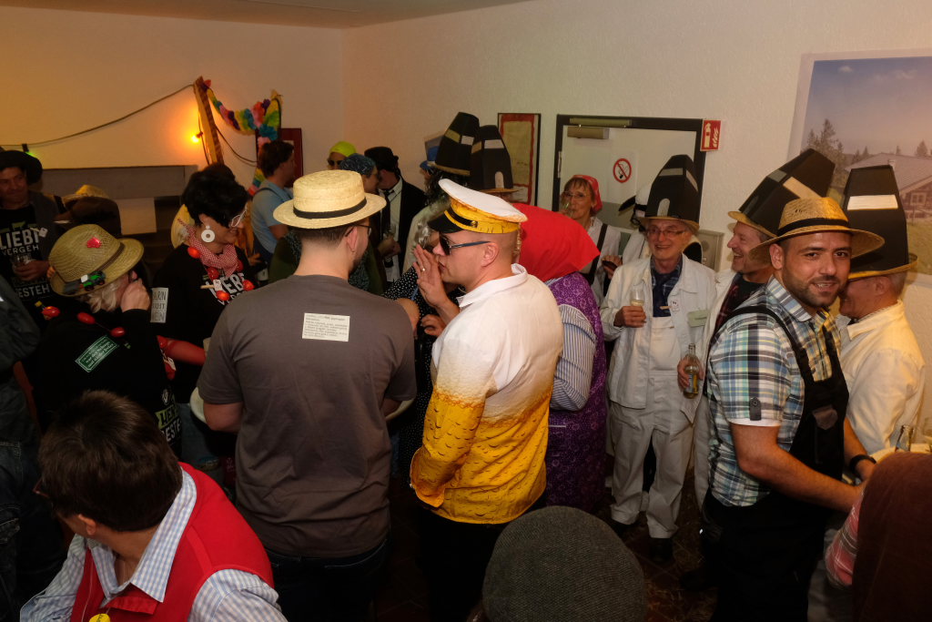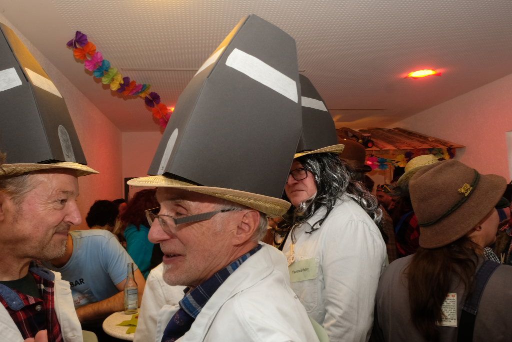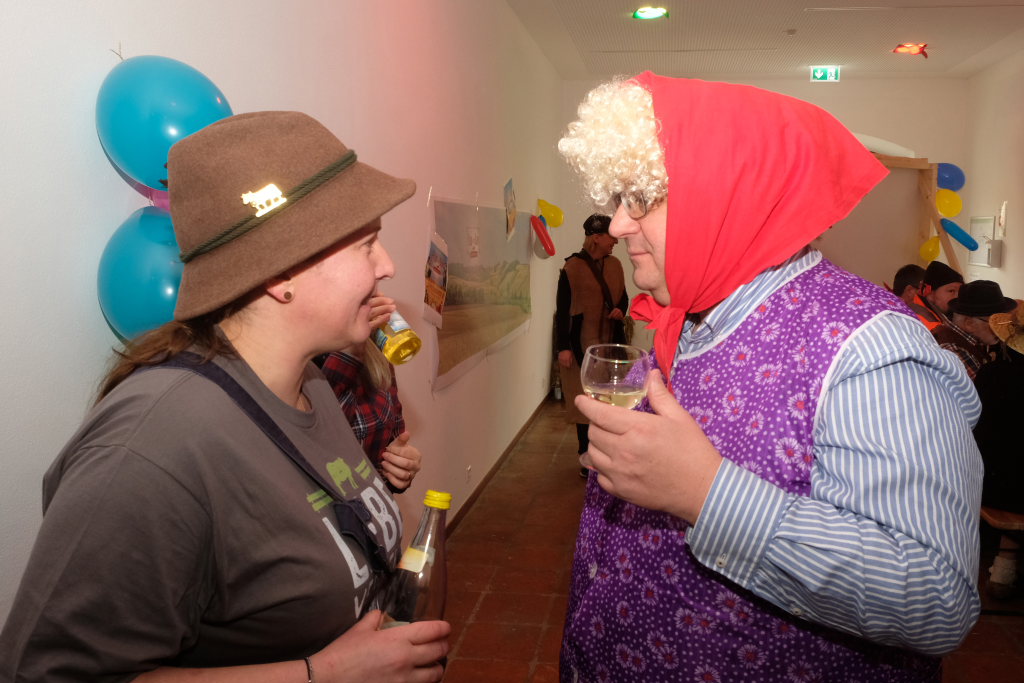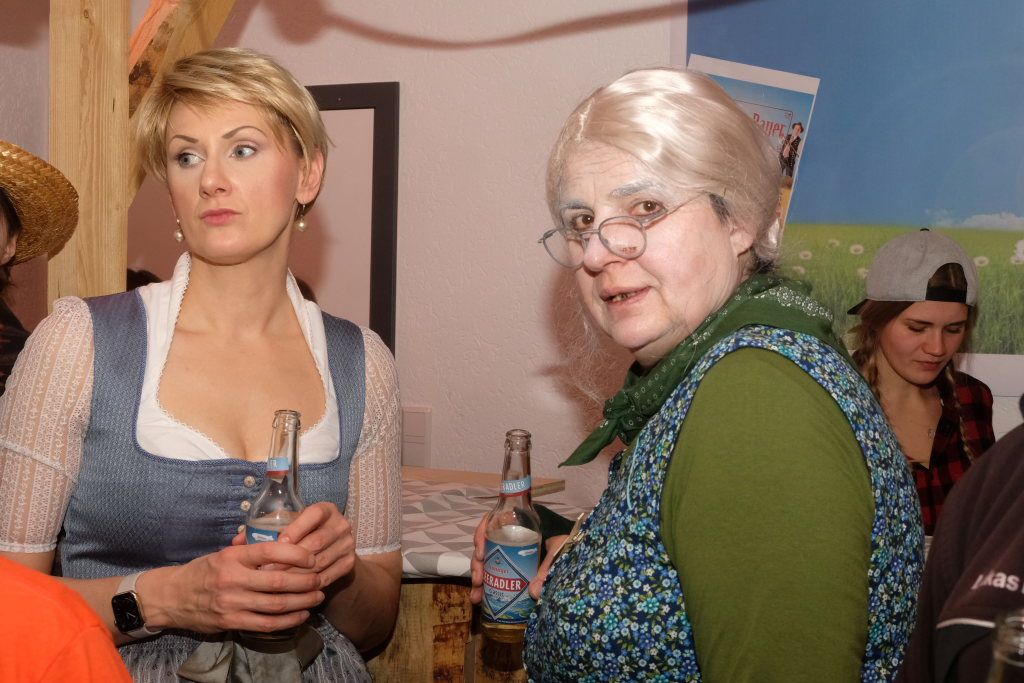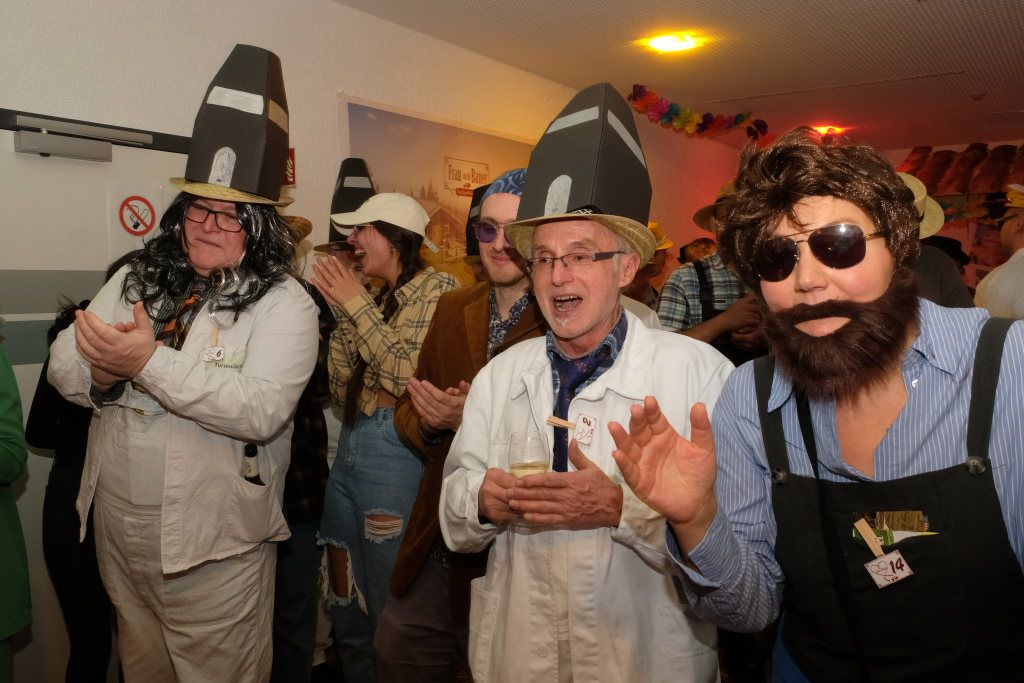 Ihrer Zeit voraus waren die Turmwächter des geplanten Turmes im Ried, dem derzeit wohl umstrittensten Projekt in der Stadt, das in seiner Beliebtheit bei Diskussionen noch weit vor den riesigen Windrädern, die von allen Seiten den schönen Blick auf das Ried zu verstellen drohen, liegt. Da traf dann so mancher Alm-Jögi auf eine schicke Dame, über deren Eignung zur Landwirtin dann durchaus diskutiert werden konnte. Aber, so war ganz pragmatisch auf dem T-Shirt einiger Verwaltungsangestellten zu lesen: „Liebe vergeht, Hektar besteht!“ Wenn dann der Herrn der Liegenschaften mit der Chefin des Ordnungsamtes flirtet (er als Rotkäppchen, sie als Milchbauer), wenn die Prinzessin der NZ Nibelgau sich mit dem „niederen Volk“ einlässst, ja dann geht es im Hüttenzauber richtig rund. Während die eine Gemeinderätin als Oma eine tolle Show abzog, machte sich die andere – im aktuellen „Häs“ des Ungeziefers als Schnake – beliebt, indem sie ihren Saugrüssel fleissig in diverse Sachen steckte. Da mussten die Bauhofmitarbeiter schon mächtig auf ihre offenen Bierflaschen aufpassen.