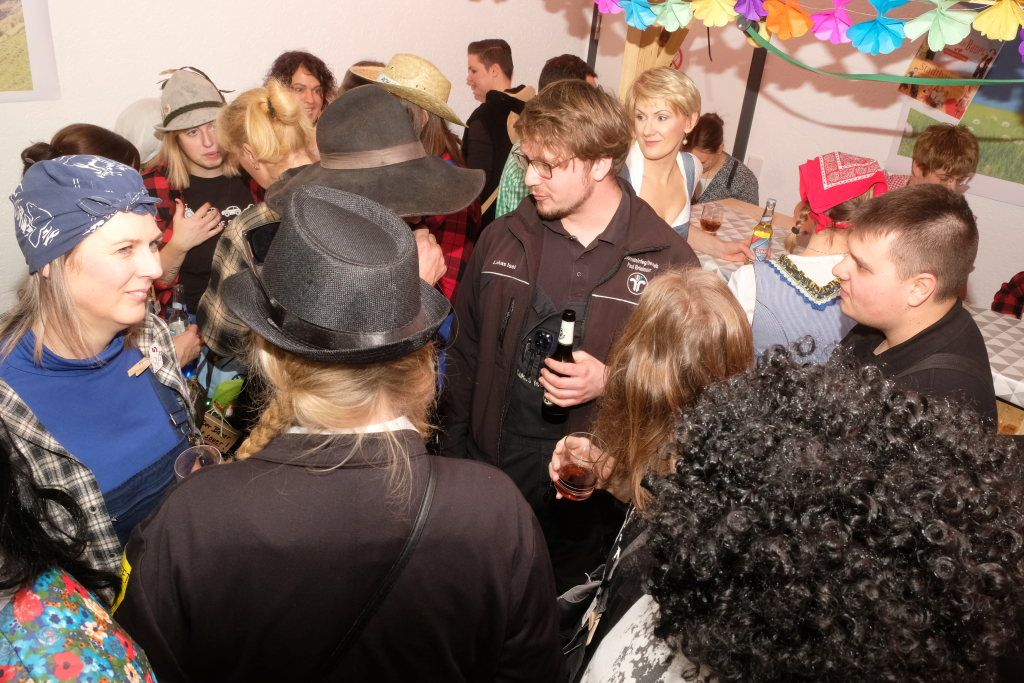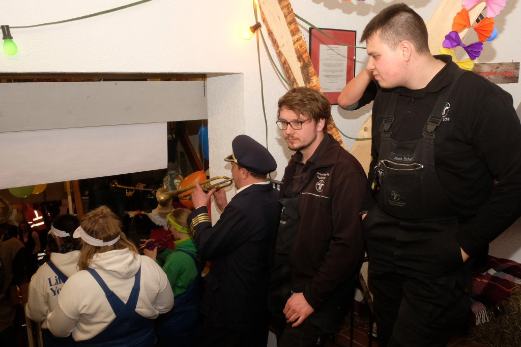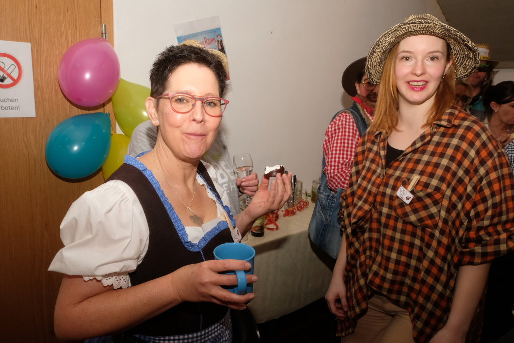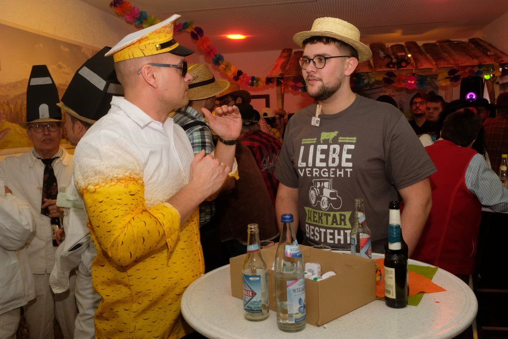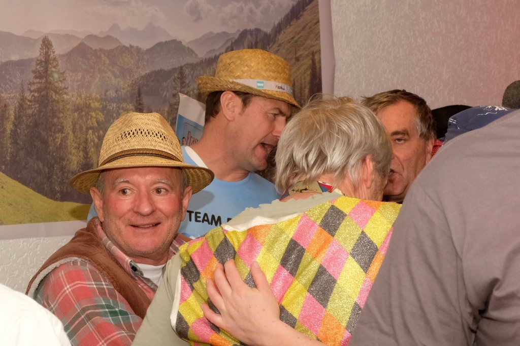 Ihrer Zeit voraus waren die Turmwächter des geplanten Turmes im Ried, dem derzeit wohl umstrittensten Projekt in der Stadt, das in seiner Beliebtheit bei Diskussionen noch weit vor den riesigen Windrädern, die von allen Seiten den schönen Blick auf das Ried zu verstellen drohen, liegt. Da traf dann so mancher Alm-Jögi auf eine schicke Dame, über deren Eignung zur Landwirtin dann durchaus diskutiert werden konnte. Aber, so war ganz pragmatisch auf dem T-Shirt einiger Verwaltungsangestellten zu lesen: „Liebe vergeht, Hektar besteht!“ Wenn dann der Herrn der Liegenschaften mit der Chefin des Ordnungsamtes flirtet (er als Rotkäppchen, sie als Milchbauer), wenn die Prinzessin der NZ Nibelgau sich mit dem „niederen Volk“ einlässst, ja dann geht es im Hüttenzauber richtig rund. Während die eine Gemeinderätin als Oma eine tolle Show abzog, machte sich die andere – im aktuellen „Häs“ des Ungeziefers als Schnake – beliebt, indem sie ihren Saugrüssel fleissig in diverse Sachen steckte. Da mussten die Bauhofmitarbeiter schon mächtig auf ihre offenen Bierflaschen aufpassen.