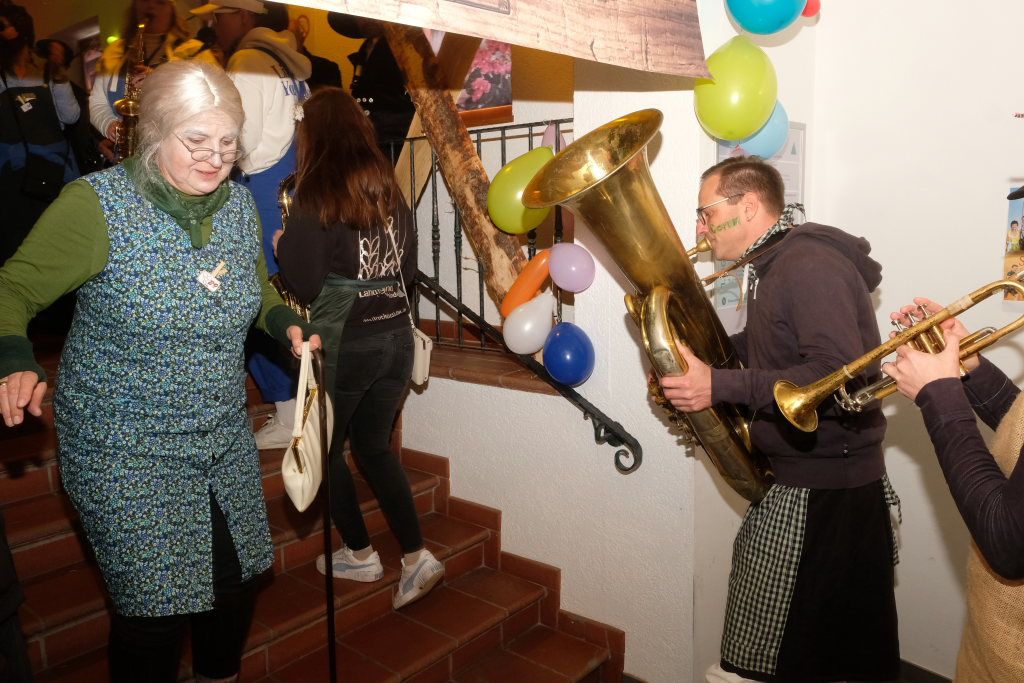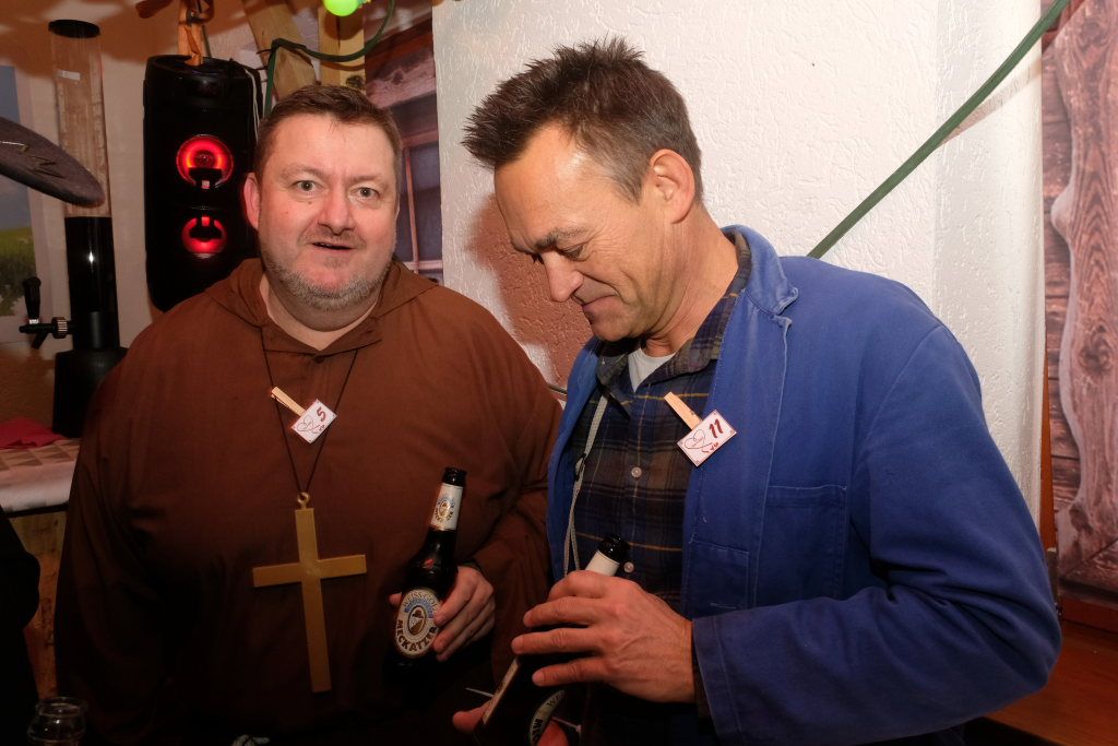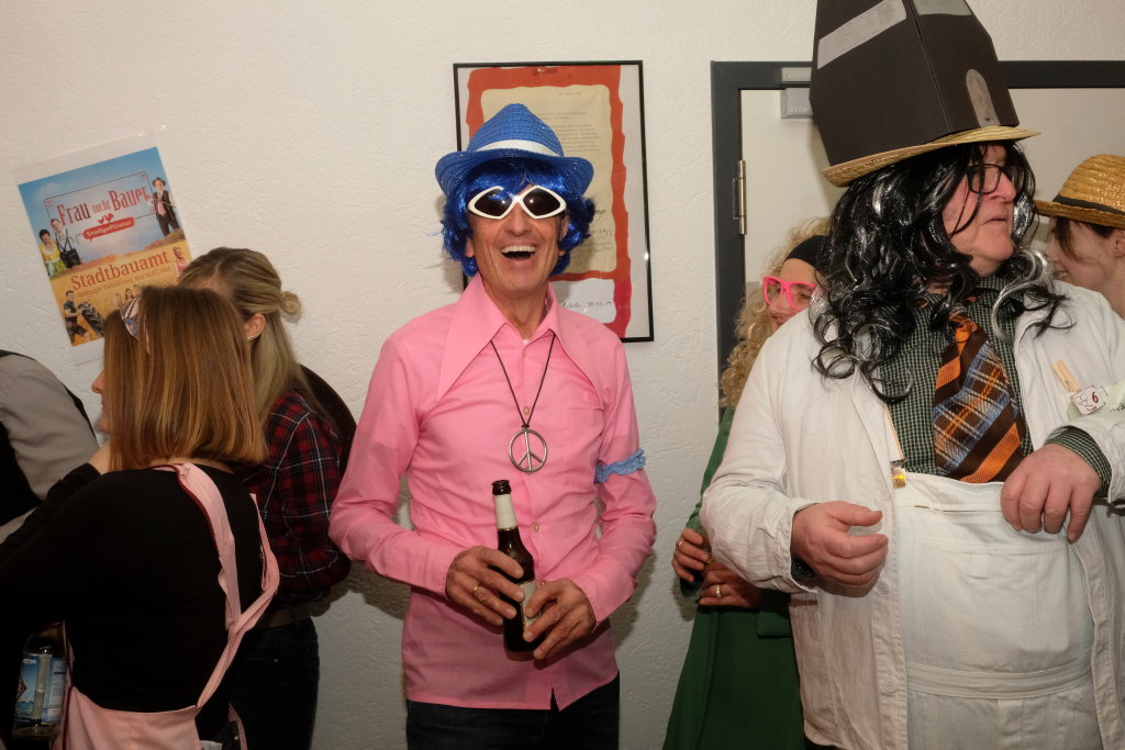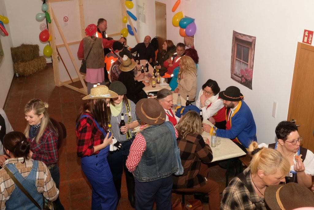 Es wurde gekuppelt, was das Zeug hielt: Maria, die städtische Politesse, erhielt Edgar, den Herrn des Breitbandes zugelost. Ein Herr der Bauparagrafen (Gerhard S.) schenkte Inkas Brause aus, für die man schon Einiges gewohnt sein musste. Hausherrin Kathleen die Erste, die per Dienstanweisung der Bürgermeisterin die närrische Tradition ihrer Vorgänger weiterführen darf, zeigte sich im eleganten hellblauen Dirndl den Dating-Willigen. Während in den Räumen der ehemaligen Galerie im Amtshaus Getränke mal mit, mal ohne Geist ausgeschenkt wurden, denen auch der in einer Mönchskutte steckende Stadtheilige fleißig zusprach. Die Gattin des obersten Personalers der Stadt habe ihn mal als (schein-)heilig bezeichnet, weswegen er nun in sich gehen wollte.