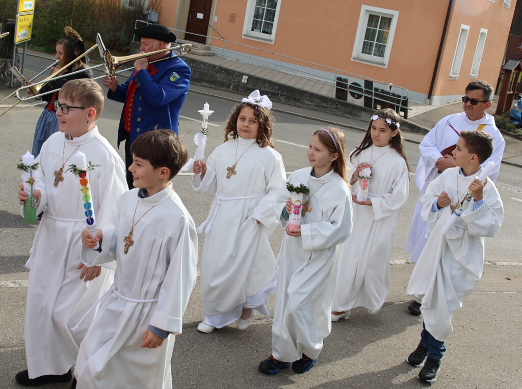 Hauerz (dbsz) – Heuer gab es in Hauerz sechs Erstkommunikanten. Pater Mariusz vom Gottesberg war Zelebrant bei der festlichen Erstkommunionfeier. Die Musik des Festgottesdienstes lag in den bewährten Händen von Gabriele Tobisch mit ihrem Projektchor und die strahlenden Trompetenklänge kamen von Gebhard Kuhn. Auch der Musikverein unter der Leitung von Simon Wältl war im Einsatz; traditionell geleitet der MV die Kinder zur Kirche und spielt nach dem Gottesdienst noch ein kleines Platzkonzert – was heuer bei fast sommerlicher Witterung ein besonderer Genuss war. Die sechs Hauerzer Erstkommunionkinder sind: Kilian Aumann, Magdalena Baumann, Nico Bullinger, Jasmin Ferenczik, Philipp Frey und Nele Kuhn. Nachstehend Bilder vom Weißen Sonntag in Hauerz; gemacht hat sie Hans Reichert.