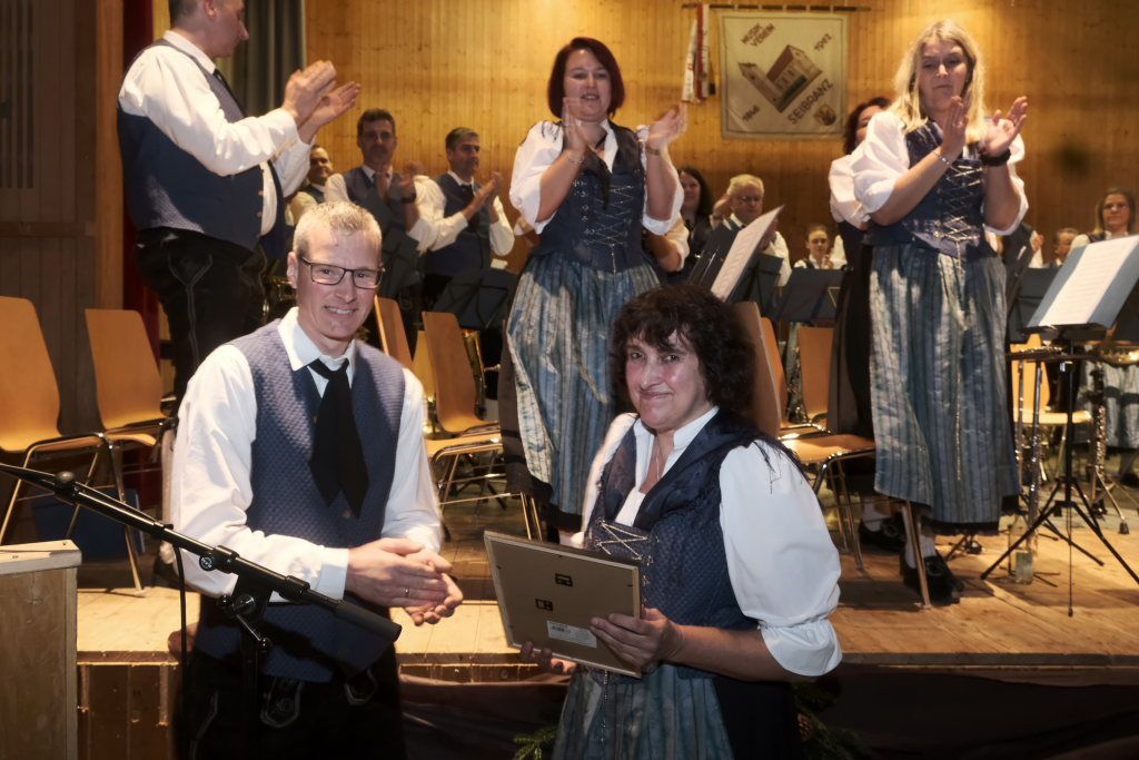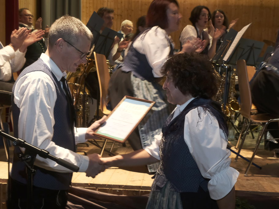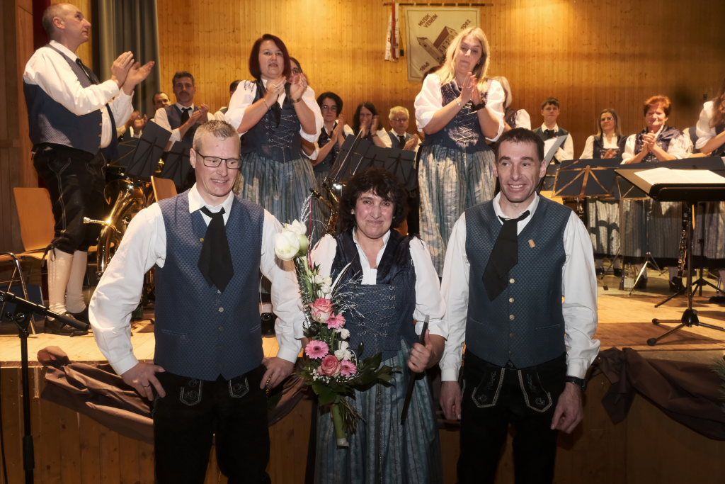 Doch damit war der Konzertabend noch lange nicht zu Ende. Vorstand Manfred Hierlemann hatte noch eine besondere Ehrung vorzunehmen: Helga Krattenmacher wurde für ihre über 30 Jahre währende Tätigkeit als Schriftführerin gedankt.