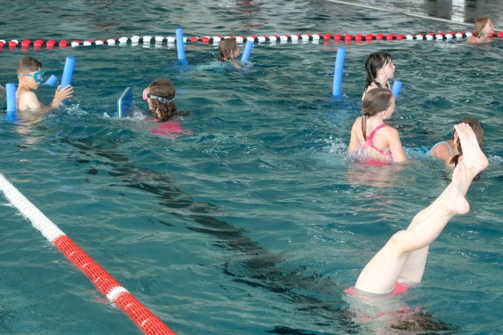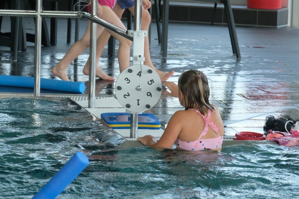 Die Betreuer von der DLRG hatten sich viele Spiele und Aktionen für die rund 50 teilnehmenden Kinder ausgedacht. Da konnten sie sich von einem kräftigen Helfer an einer Rettungsleine über rund 10 Meter wie ein Fisch an der Angel durchs Wasser ziehen lassen. Oder nach schweren Tauchringen tauchen. Am Kindereinstieg waren zwei Glücksräder angebracht, die angaben, zu welcher Station die Kids wechseln durften. Im Kinderbecken kamen die gelben Quietsche-Entchen zum Einsatz, deren Artgenossen in wenigen Wochen beim Stadtfest wieder ihr großes Wettrennen bestreiten werden.