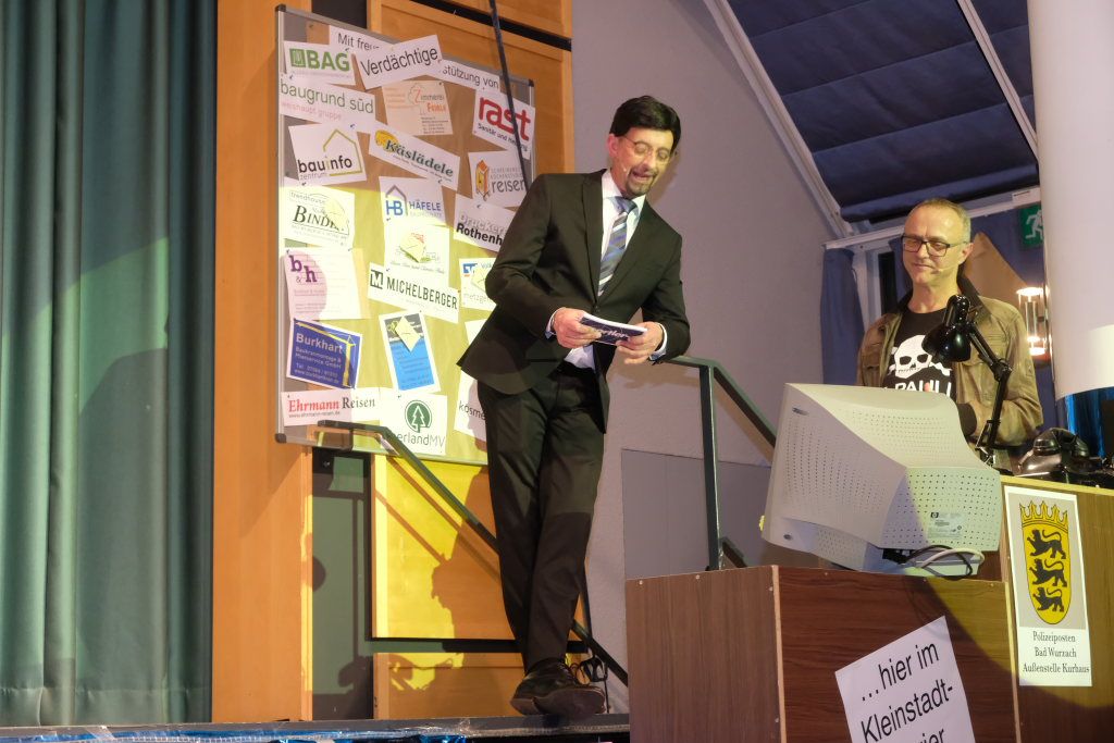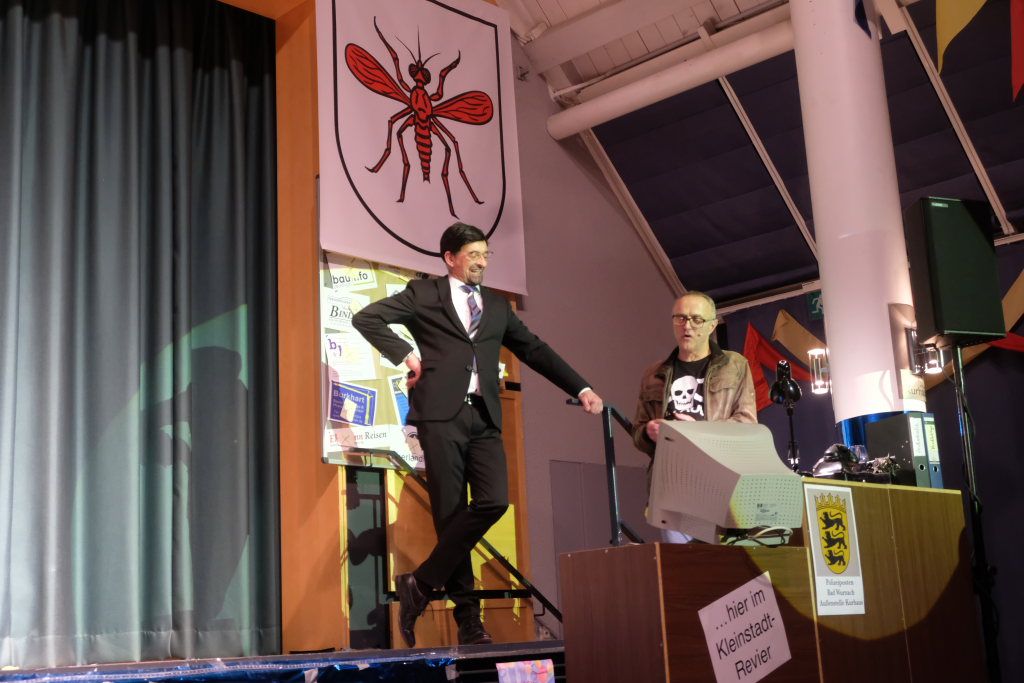 Markus „Finne“ Vincon stieg als Sherlock Holmes zu seiner traditionellen, mit vielen bissigen Bemerkungen gespickten Rede in die Bütt. Mit scharfem Blick nahm er Turmbau im Ried, Windkraft und Kurbetrieb aufs Korn. Den Kurgeschäftsführer entlarvte er als Trickser, aber auch die Medienlandschaft in und um Bad Wurzach bekam ihr Fett ab. Und er befürchtete, dass nach der Kommunalwahl die Stadt vom Stadtseniorenrat eingenommen wird.