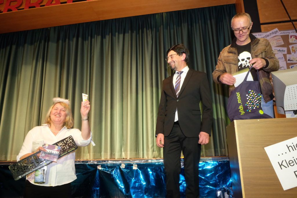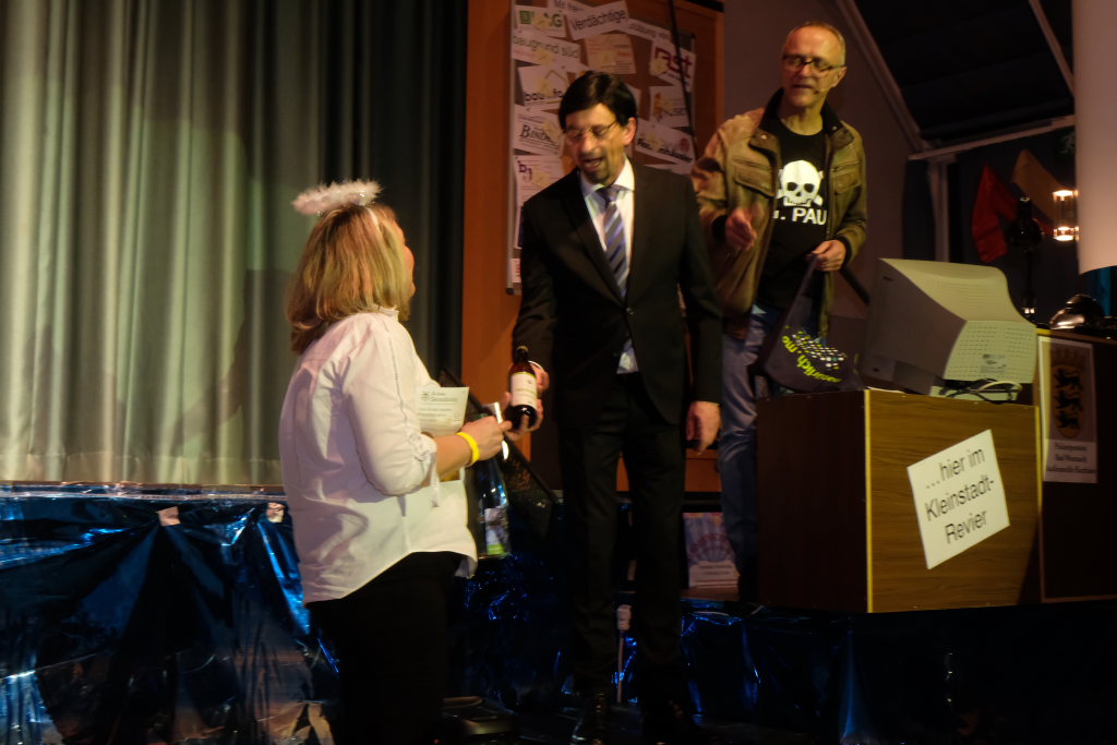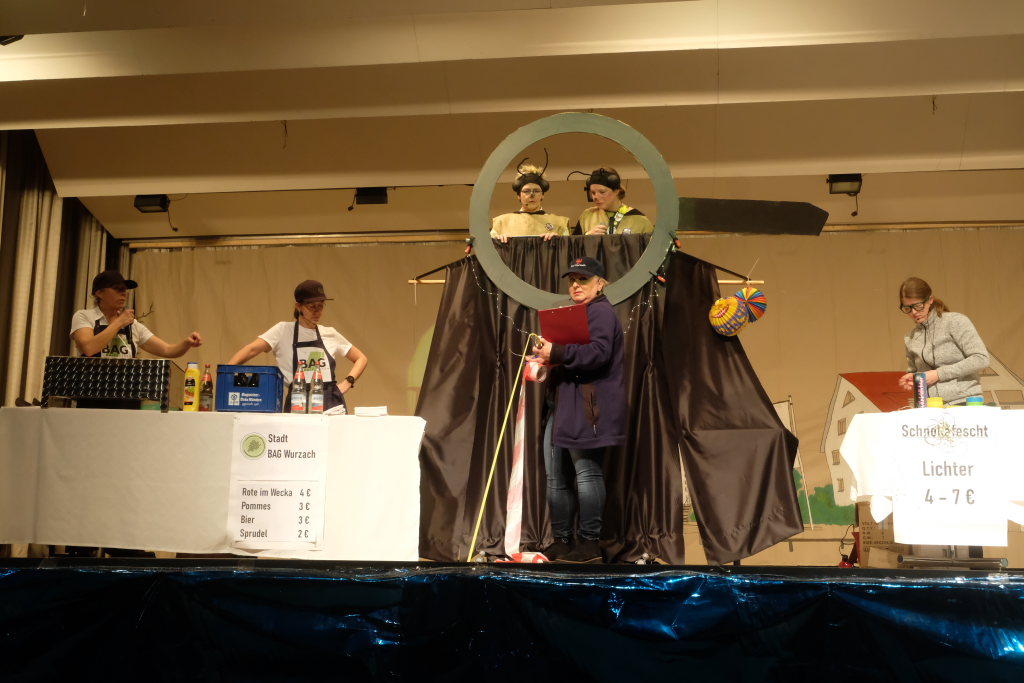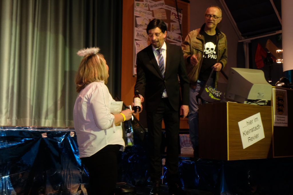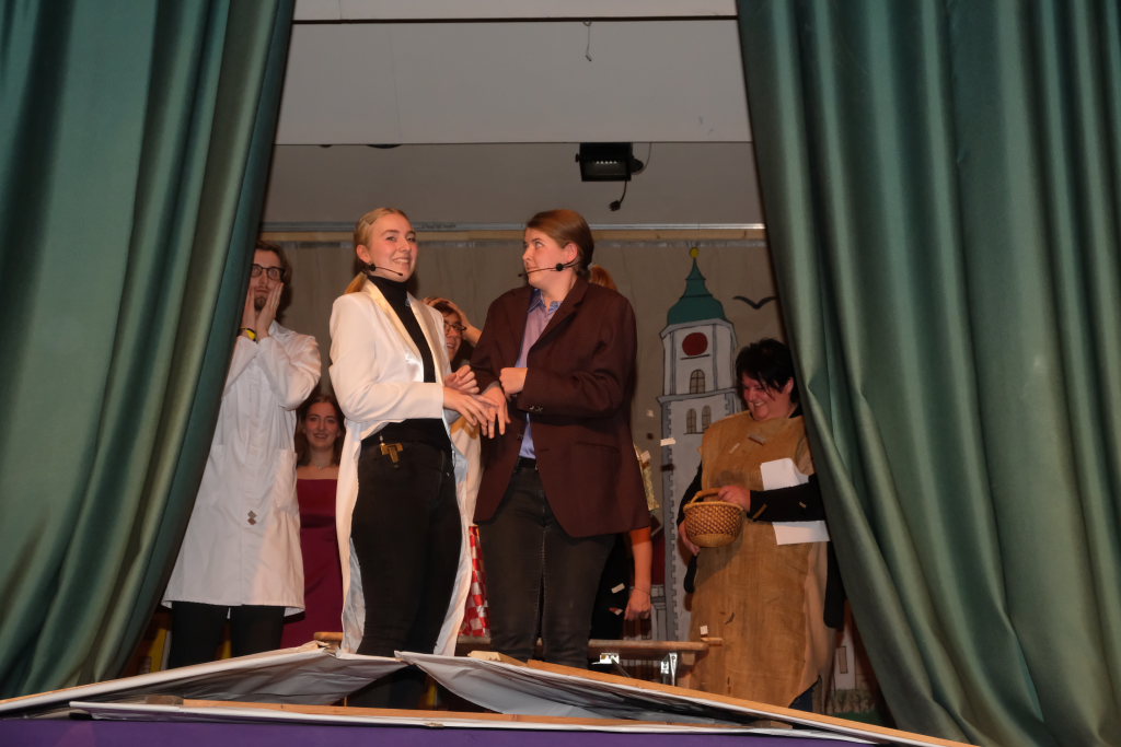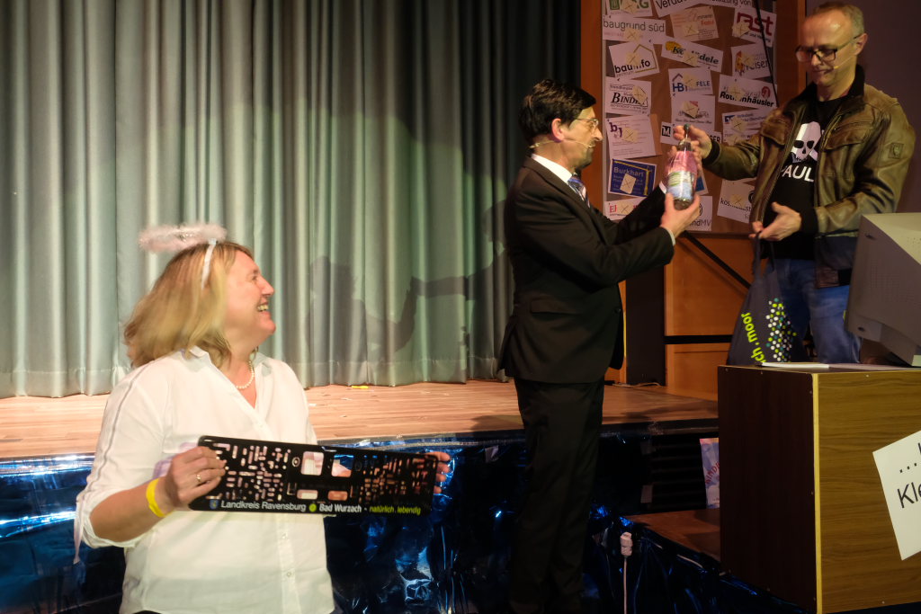Nach dem Streichen weiterer Verdächtiger wie Constantin Wegmann, der am Freitagmittag ausnahmsweise offen hatte, oder der Firma Rast, deren gesamte Flotte Börne beim neuen Hallenbad sich beratschlagen sah, „vermutlich Wassereinbruch im Schwimmbecken, alle haben ein wasserdichtes Alibi“, blieb nur noch eine Hauptverdächtige: Bürgermeisterin Alexandra Scherer, wie Hardy Thiel von Anfang an vermutet hatte. Doch auch sie wurde rasch für unschuldig erklärt, weil vieles – wie etwa die Erbsensuppe – noch auf das Konto ihres Vorgängers ging. Und weil das Stadtoberhaupt – als Unschuldsengel verkleidet – inzwischen seinen Hauptwohnsitz nach Bad Wurzach verlegt hat, bekam es von den beiden Ermittlern ein Bad Wurzach Willkommenspaket überreicht: Riedtropfen, Moorkugeln, eine Fango-Packung, BAG-Bier, eine Sangesmann-CD und natürlich eine Dose Erbsensuppe.