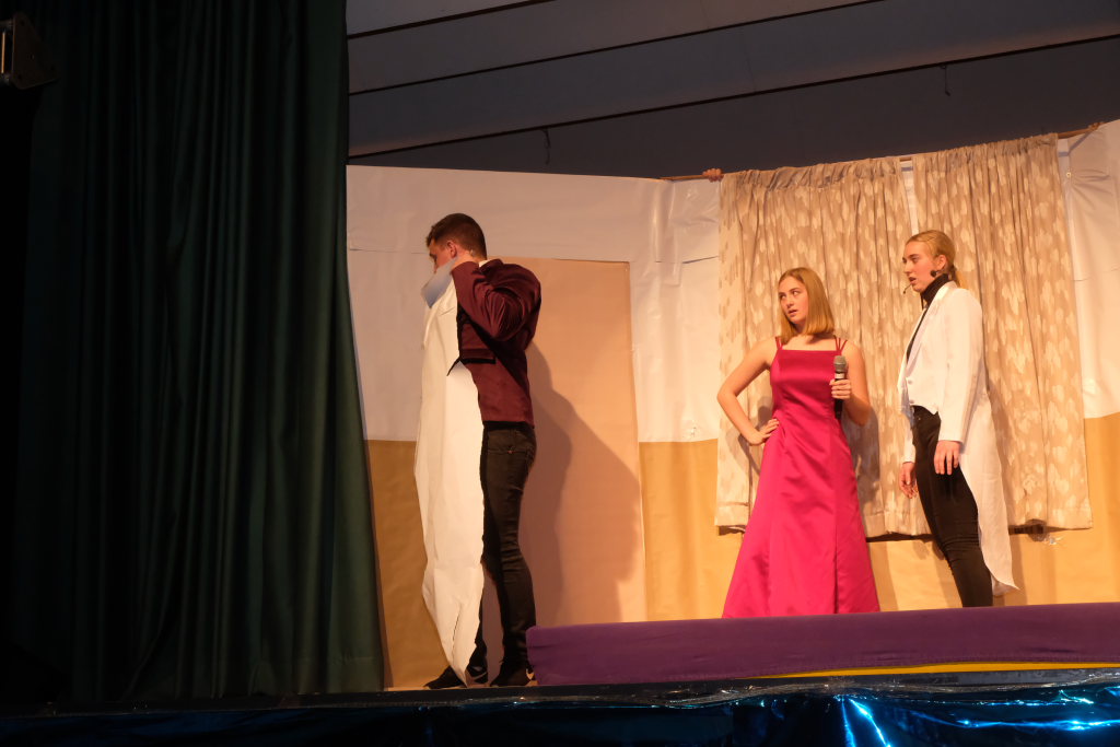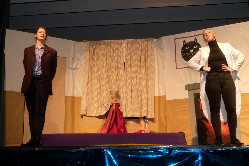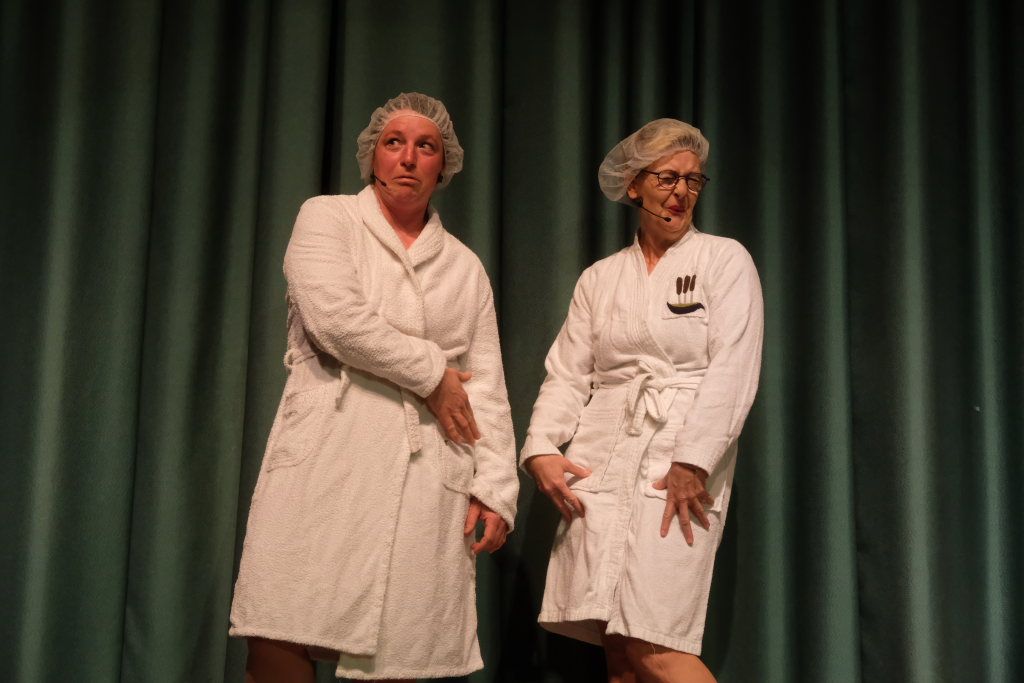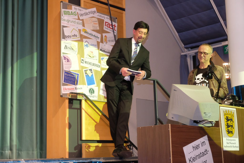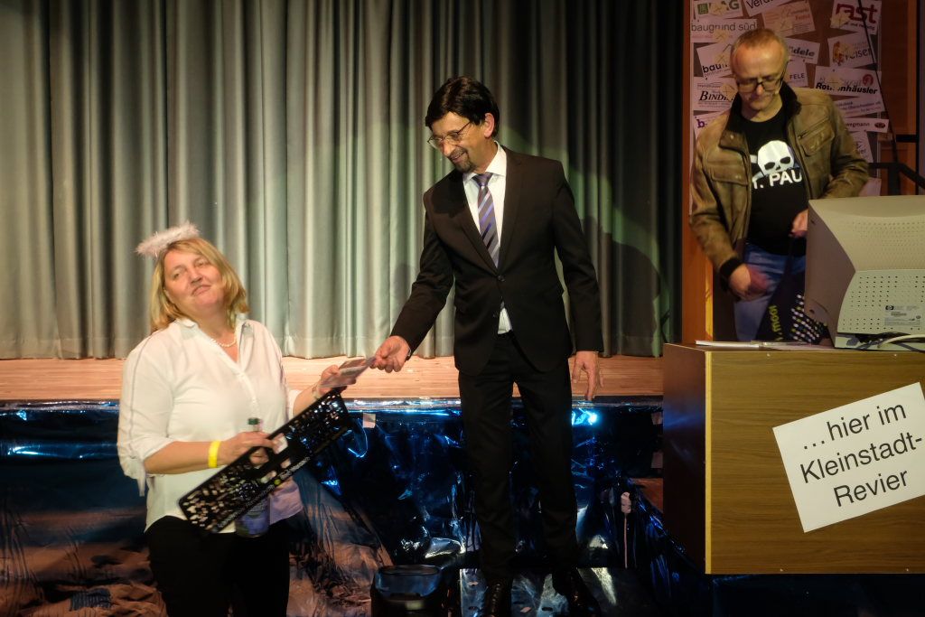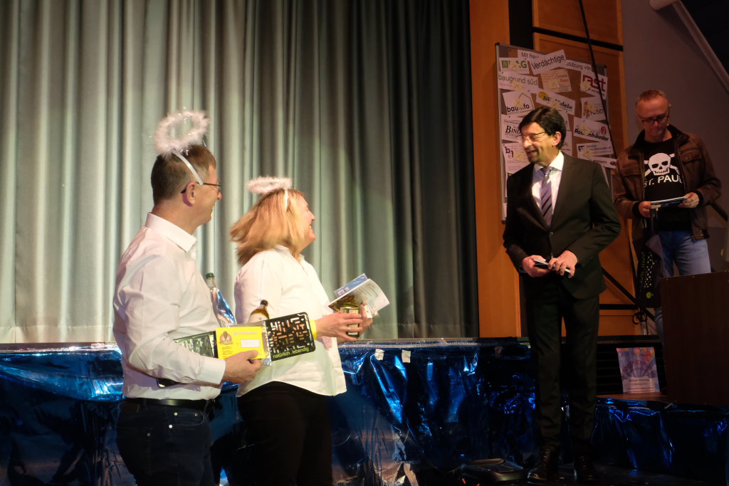 Nach dem Streichen weiterer Verdächtiger wie Constantin Wegmann, der am Freitagmittag ausnahmsweise offen hatte, oder der Firma Rast, deren gesamte Flotte Börne beim neuen Hallenbad sich beratschlagen sah, „vermutlich Wassereinbruch im Schwimmbecken, alle haben ein wasserdichtes Alibi“, blieb nur noch eine Hauptverdächtige: Bürgermeisterin Alexandra Scherer, wie Hardy Thiel von Anfang an vermutet hatte. Doch auch sie wurde rasch für unschuldig erklärt, weil vieles – wie etwa die Erbsensuppe – noch auf das Konto ihres Vorgängers ging. Und weil das Stadtoberhaupt – als Unschuldsengel verkleidet – inzwischen seinen Hauptwohnsitz nach Bad Wurzach verlegt hat, bekam es von den beiden Ermittlern ein Bad Wurzach Willkommenspaket überreicht: Riedtropfen, Moorkugeln, eine Fango-Packung, BAG-Bier, eine Sangesmann-CD und natürlich eine Dose Erbsensuppe.