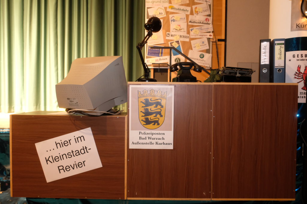 Doch war dies nicht die einzige große Neuerung: Moderator Reinhard „Hardy“ Vincon trat als Fernseh-Kommissar Thiel gemeinsam mit Walter Strobel alias Professor Börne seinen Dienst auf dem Polizeiposten Bad Wurzach, Außenstelle Kurhaus, an. Wo im Foyer denn auch beim Eintreffen der Ballbesucher der Tatort von Spurensicherern markiert war und Statisten als Schaulustige hinter rot-weißem Flatterband gehalten wurden. Wie in einem sonntäglichen „Tatort“ kam dann auch die Eröffnung daher: Neben den hochprofessionell gemachten Filmszenen zur Einführung des Krimiplots und den beiden „Chefermittlern“ hatten die Macher sogar das Tatort-Intro in einer Wurzach-Fasnets-Version nachgedreht.