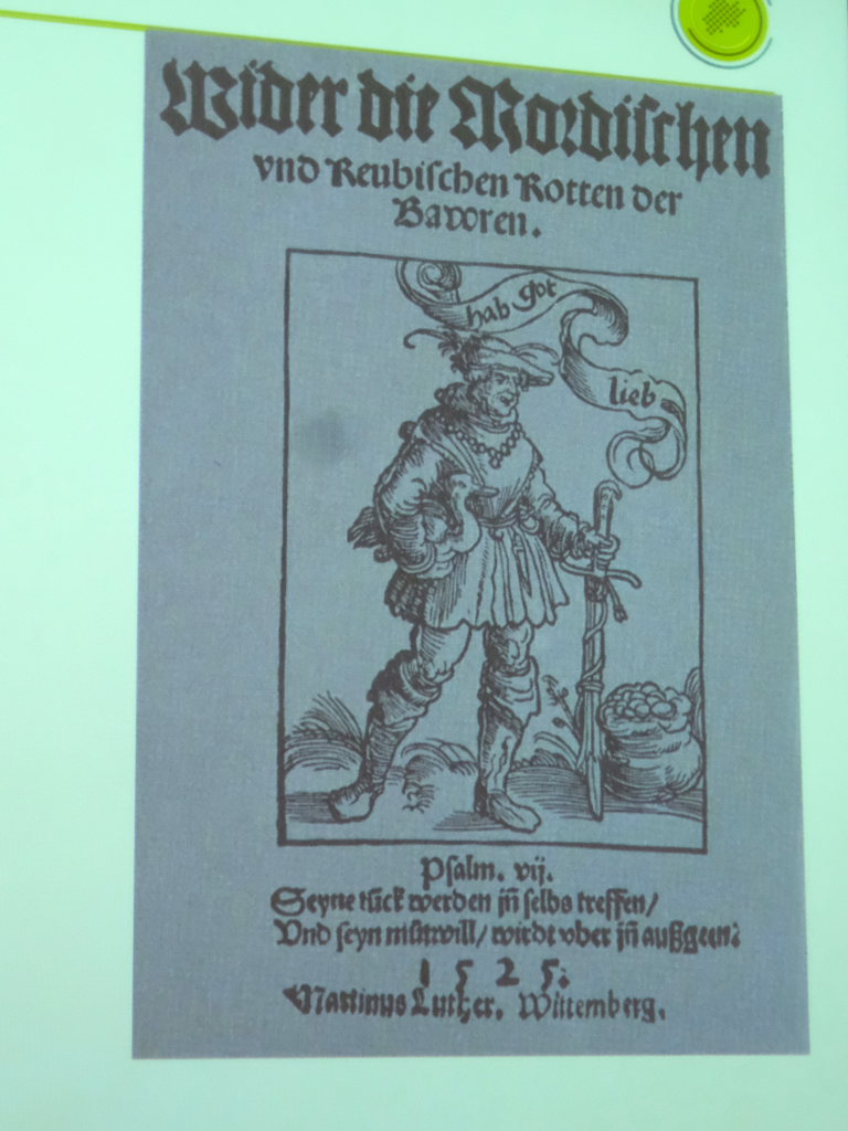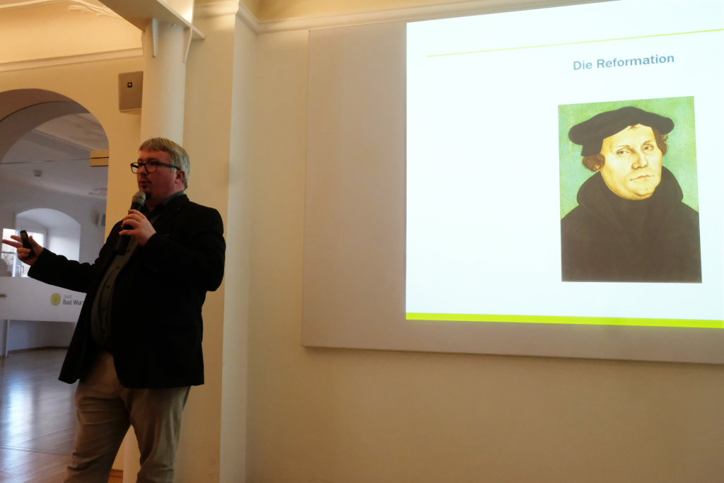 Wild eröffnete den Vortrag mit einer groben Definition des Mittelalters, das die Wissenschaft grob in die Zeit zwischen 500 und 1500 einordnet. „Exakter wird es nicht.“ Damit zählt die Zeit des Bauernkrieges 1525 bereits zur frühen Neuzeit. „Das 16. Jahrhundert war eine Zeit des Umbruchs, es gab viele Veränderungen“, erläuterte Wild und nannte als die wichtigsten die Erfindung des Buchdrucks und die Reformation.