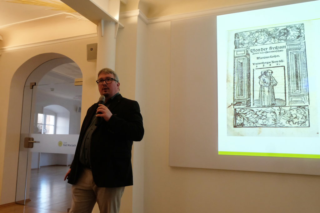 Bad Wurzach – Stadtarchivar Michael Tassilo Wild hielt zur Eröffnung des Gedenkjahres „500 Jahre Bauernkrieg“ im Sitzungssaal in Maria Rosengarten einen Vortrag zu regionalen Aspekten des Bauernkrieges, zumal mit dem Bauernjörg eine der prägendsten Figuren des Bauernkrieges von hier stammte.