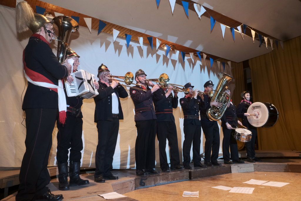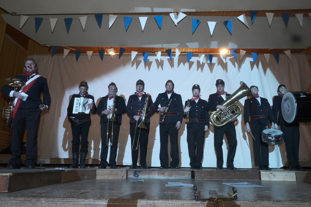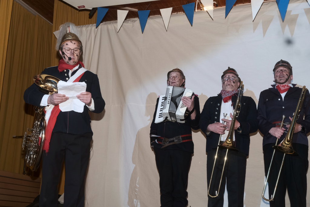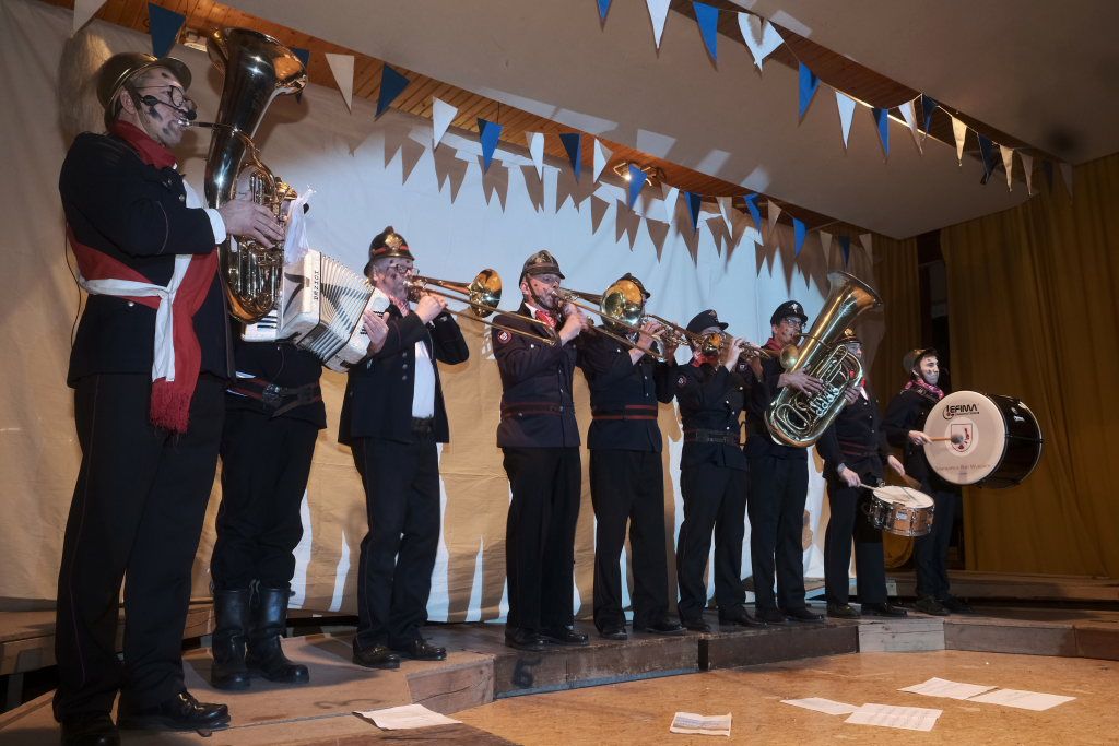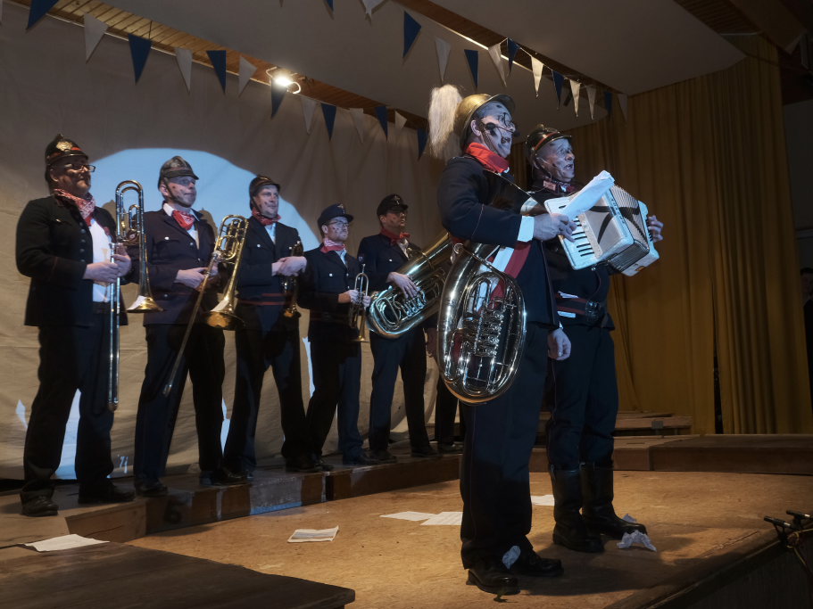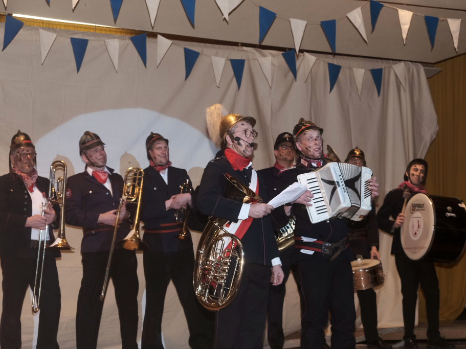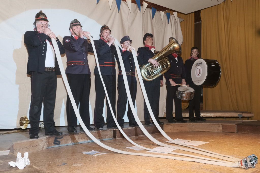 Der Auftritt der „Brandwachbegleitlöschzugsblaskapelle“ mit ihrem Commodore Wolfgang Grösser in historischen Feuerwehruniformen brachte mit ihren ortsbezogenen Texten und toll-schräger Musik die ehrwürdige Festhalle zum Kochen. Weil die hochmusikalische Truppe bei der Erstellung des Feuerwehrbedarfsplan schlicht vergessen worden war, freute sich Grösser natürlich sehr, dass Pfarrer Maier ihnen die sonntägliche Kollekte versprochen habe.