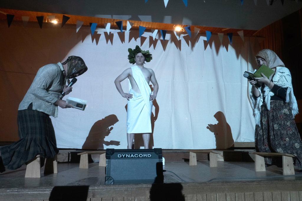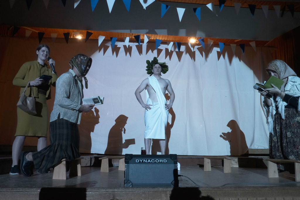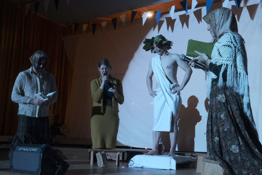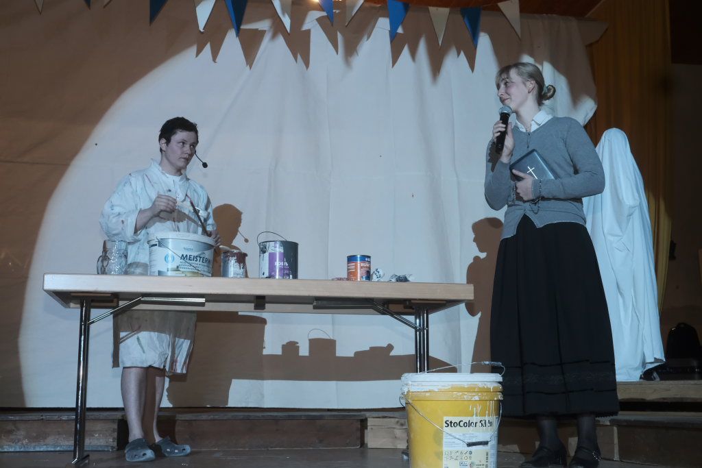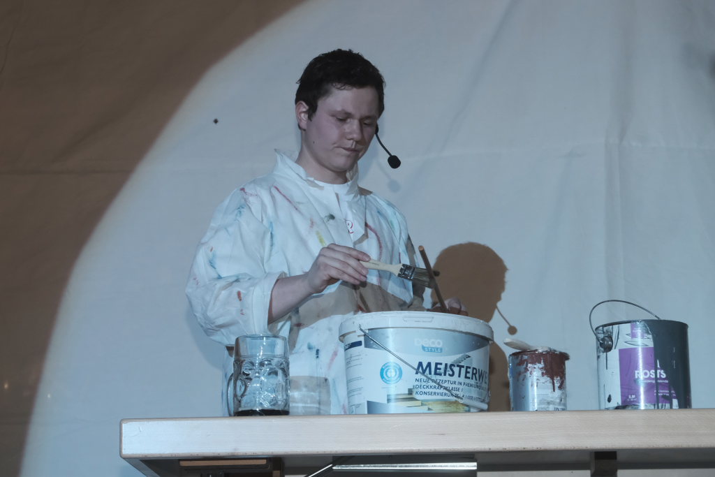 Es folgte der zweiaktige Sketch, in dem der bockbiertrinkende Malermeister André Loritz hingebungsvoll das Vorhangstängele eines Toilettenhäuschens bearbeitet, dabei den furchtbaren Stress beklagt, der ihm kaum Zeit für sein geliebtes Bier lässt. Und der darüber glatt seinen Hauptauftrag, die Neubemalung des heiligen Crispinius, vergisst. Bis die Pfarrersköchin (Ida Vincon) ihn in die Realität zurückholt, denn in zwei Tagen steht das Patrozinium des Heiligen an, der dafür sorgen soll, dass die nichtverehelichten älteren Damen „no oin abkriegat“. Nach einer in Wurzach – nicht mehr sehr ausgiebigen – Kneipentour kommt dem Maler, dem klar wurde, dass er das nicht mehr schaffen würde, im „Scharfen Eck“ die rettende Idee: Er stellt sich als adonisähnlicher Heiliger einfach selbst in die Kirche, um sich „augenrollend“ die Bitten und Gebete der alten Jungfern anzuhören. Was dann für ihn und seinen Darsteller buchstäblich zu einer „heißen“ Angelegenheit wurde …