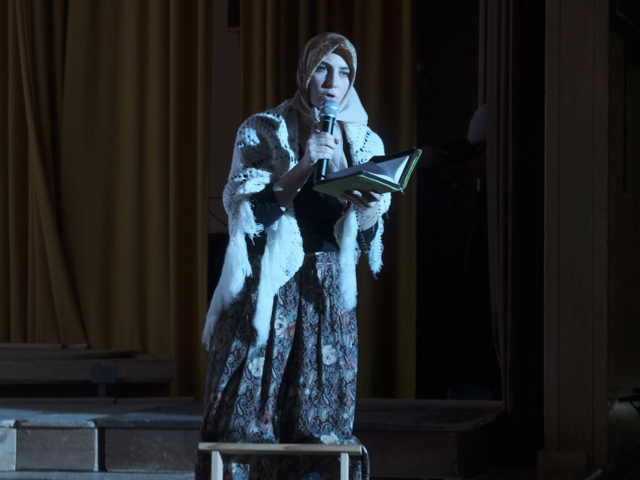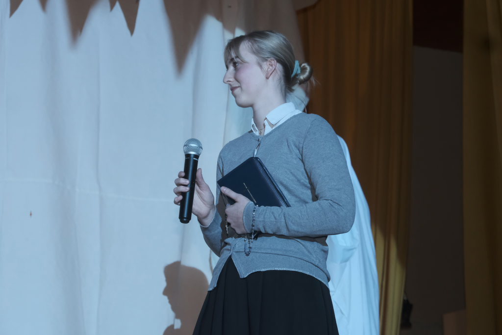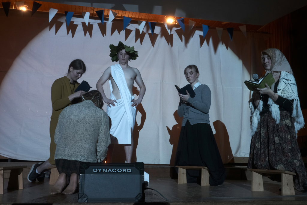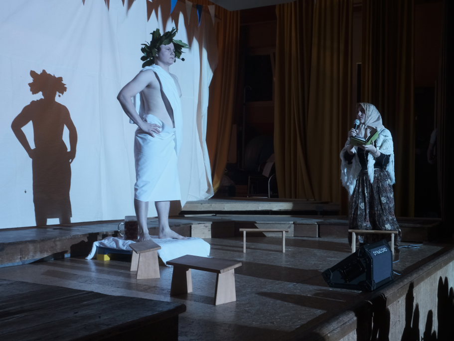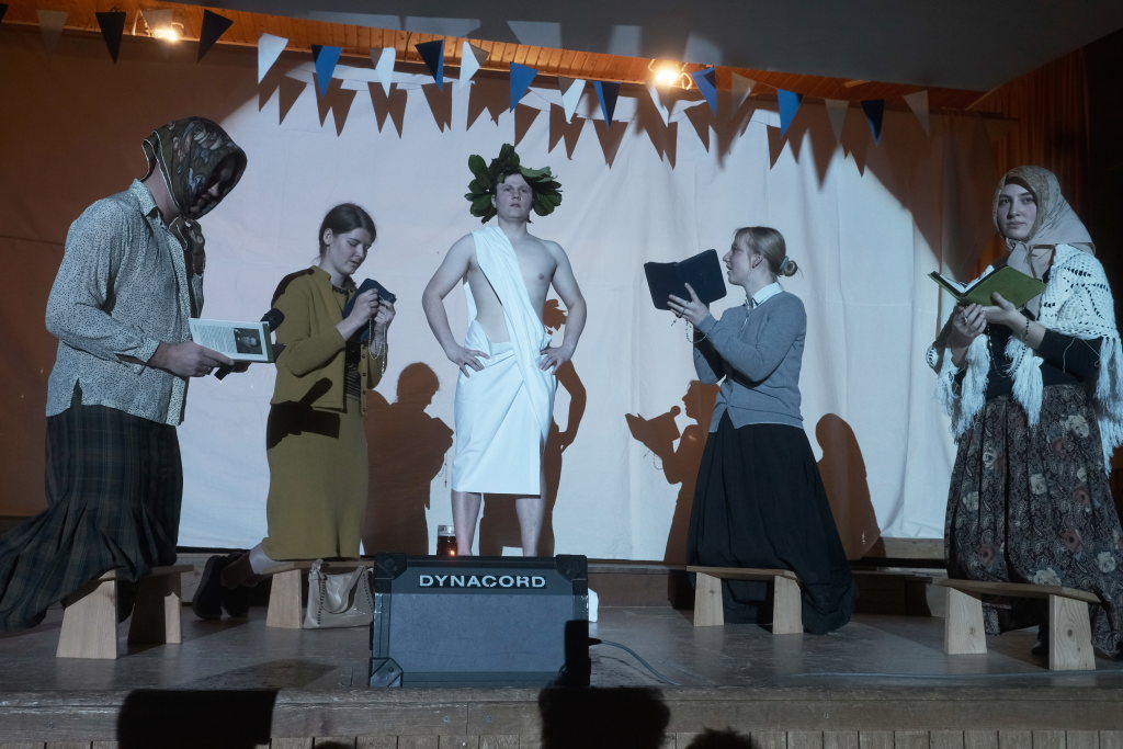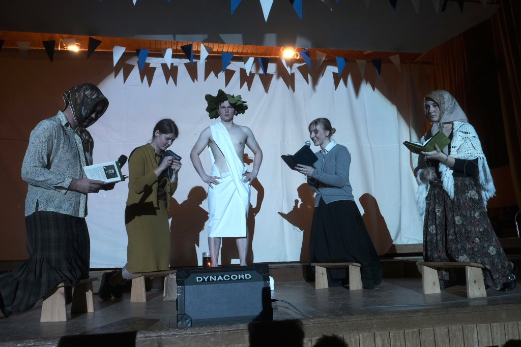 Es folgte der zweiaktige Sketch, in dem der bockbiertrinkende Malermeister André Loritz hingebungsvoll das Vorhangstängele eines Toilettenhäuschens bearbeitet, dabei den furchtbaren Stress beklagt, der ihm kaum Zeit für sein geliebtes Bier lässt. Und der darüber glatt seinen Hauptauftrag, die Neubemalung des heiligen Crispinius, vergisst. Bis die Pfarrersköchin (Ida Vincon) ihn in die Realität zurückholt, denn in zwei Tagen steht das Patrozinium des Heiligen an, der dafür sorgen soll, dass die nichtverehelichten älteren Damen „no oin abkriegat“. Nach einer in Wurzach – nicht mehr sehr ausgiebigen – Kneipentour kommt dem Maler, dem klar wurde, dass er das nicht mehr schaffen würde, im „Scharfen Eck“ die rettende Idee: Er stellt sich als adonisähnlicher Heiliger einfach selbst in die Kirche, um sich „augenrollend“ die Bitten und Gebete der alten Jungfern anzuhören. Was dann für ihn und seinen Darsteller buchstäblich zu einer „heißen“ Angelegenheit wurde …