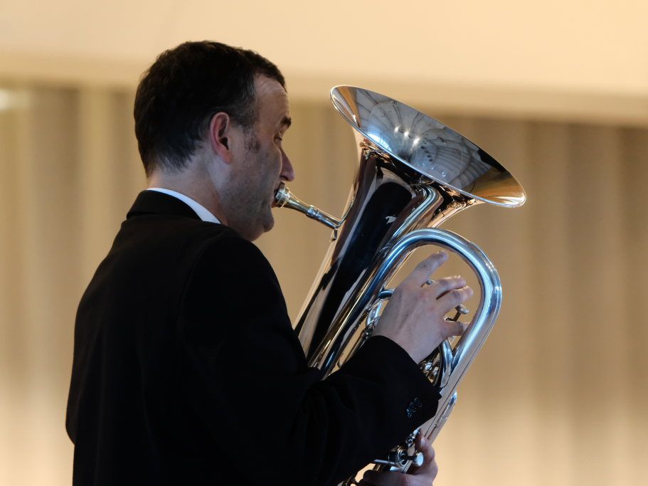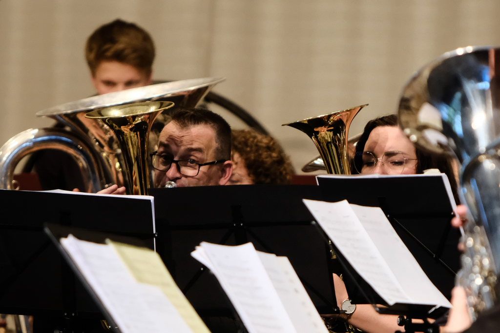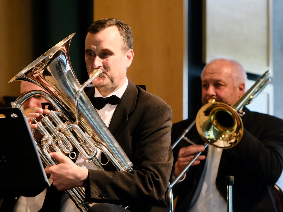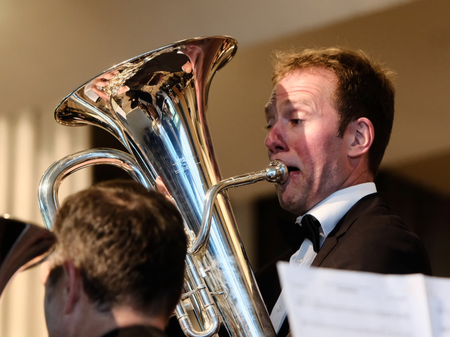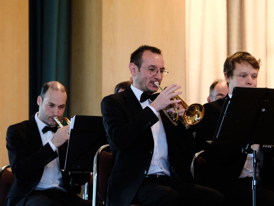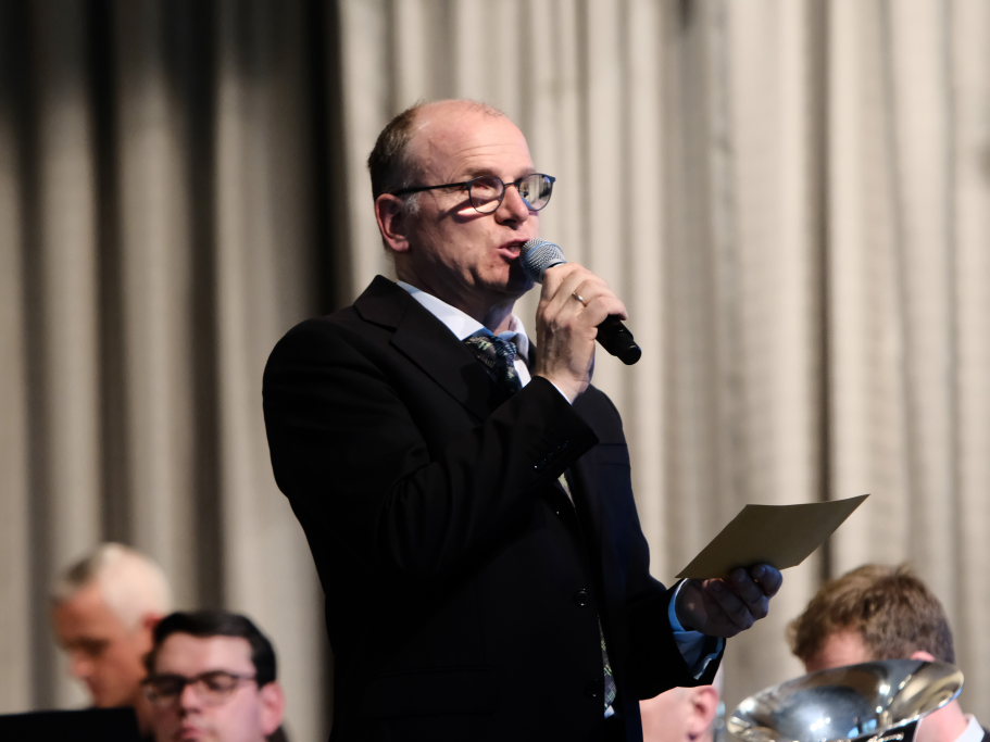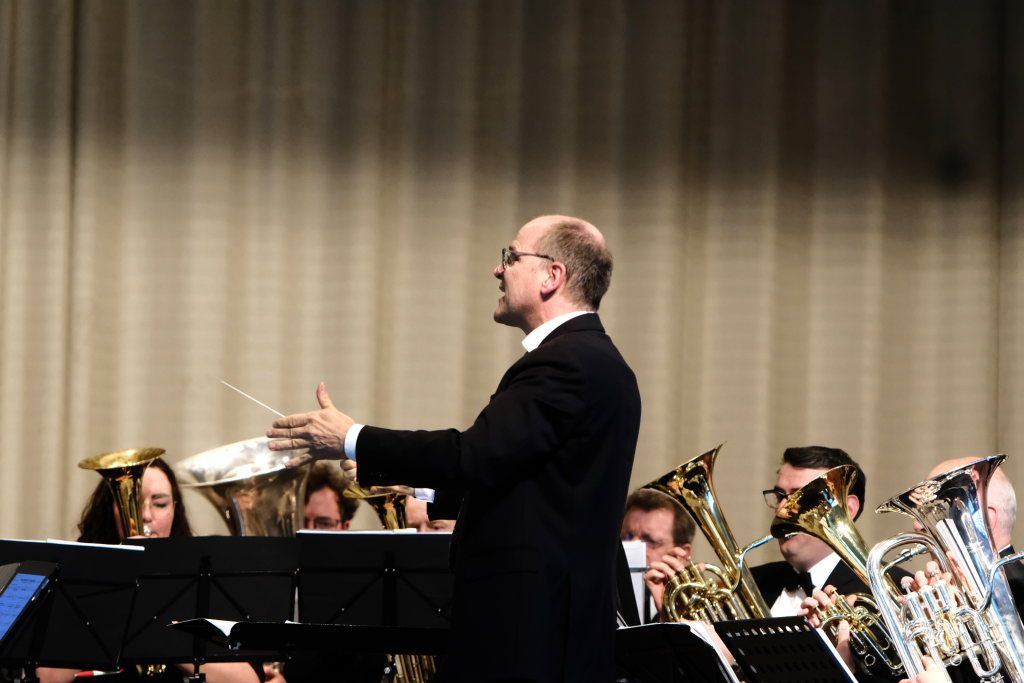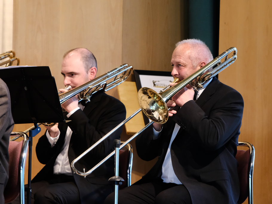 Mit dem Traditional „Carrick Fergus“ im Arrangement für Brass-Band von Stephen Roberts setzten die Musiker um Dirigent Bernhard Reifer, der auch die Ansage der einzelnen Stücke übernahm, das Konzert fort. Carrick Fergus ist eine Stadt in Nordirland – und der Name eines irischen Traditionals, bei dem sich Klaus Merk an einem der wichtigsten Instrumente für Brass-Bands, dem Euphonium, als Solist auszeichnen konnte.