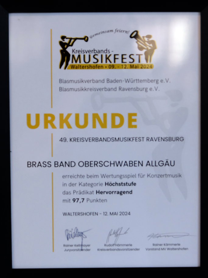 Eigentlich sollte bei der Brass-Gala neben der Brass-Band Oberschwaben Allgäu (BBOA) auch die Brass Band A7 auf der Bühne stehen und Dirigent und Vorstand saßen auch im Publikum. Doch waren diese zur Untätigkeit verurteilt, weil einige der Nachwuchsmusiker/innen so gut sind, dass sie beim Bundeswettbewerb „Jugend musiziert“ antreten durften, wobei Ort und Termin sehr kurzfristig bekannt gegeben wurden, so dass die A7 relativ kurzfristig ihre Teilnahme an der diesjährigen Brass-Gala im Kursaal Bad Wurzach absagen musste.