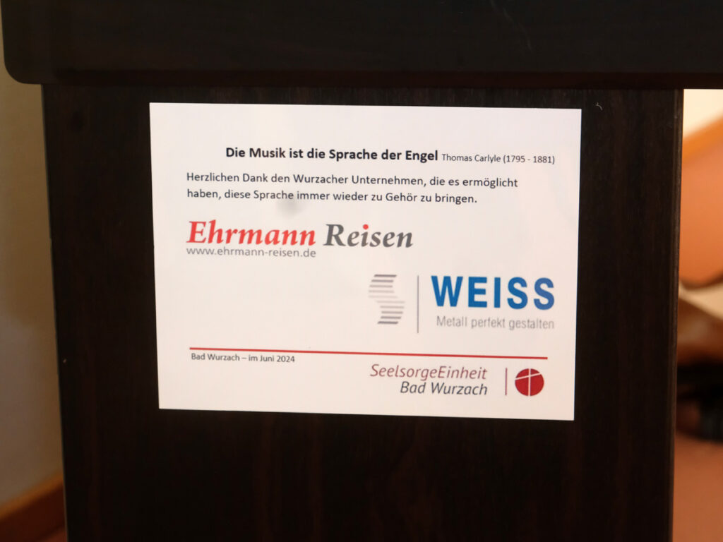 Und so prangt nun an der Seite des Instruments ein Schild mit den Namen der beiden Spenderfirmen. Aber nicht nur das: „Musik ist die Sprache der Engel“ ist ein Zitat von Thomas Carlyle, einem sehr einflussreichen schottischen Essayisten und Historiker im viktorianischen Großbritannien. „Herzlichen Dank den Wurzacher Unternehmen, die es ermöglicht haben, diese Sprache immer wieder zu Gehör zu bringen,“ schrieb Matthias Winstel im Namen der Seelsorgeeinheit Bad Wurzach darunter. „Mit Musik können wir die Leute abholen, Musik berührt sie, “ sagte Matthias Winstel bei der Feier. „Und sie bringt den Menschen ein Stück Lebensqualität ergänzte die Heimleiterin.