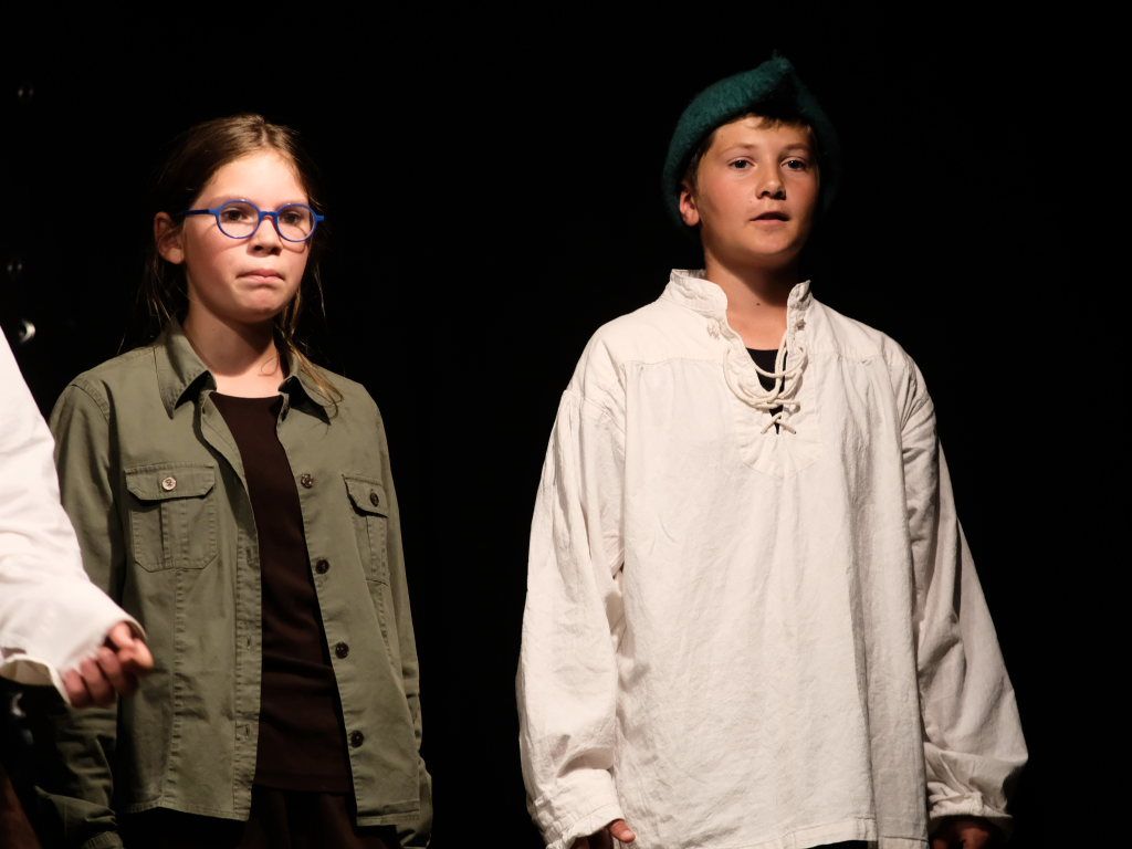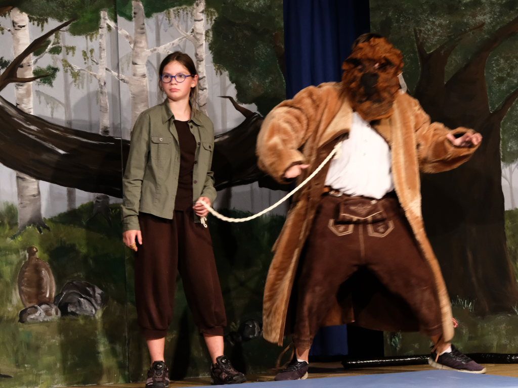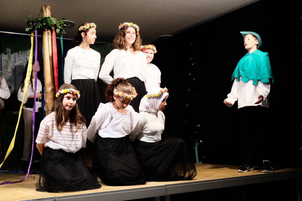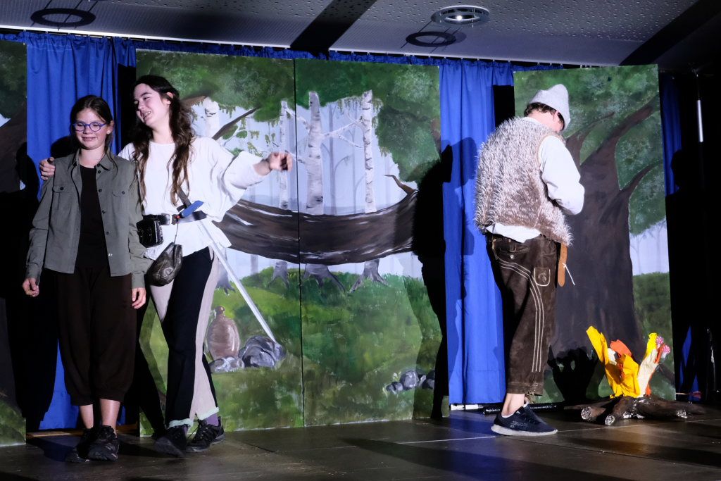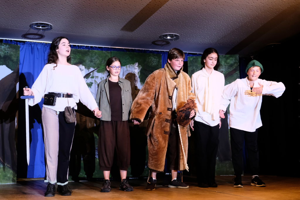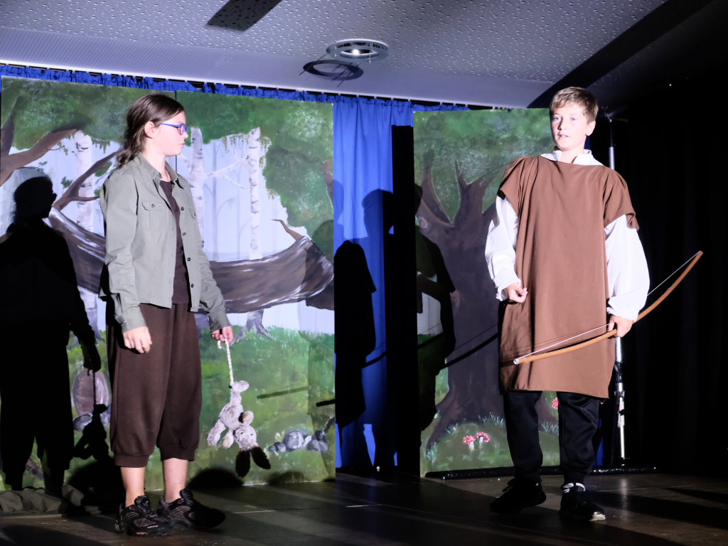 Ganz zu schweigen vom Ensemble auf der Bühne: Bei Luca Friedl als Robin Hood und Luan Blini als intrigantem Sheriff von Nottingham brannte jedesmal – im übertragenen Sinne – die Luft, wenn die beiden aufeinandertrafen. Gemeinsam mit Maren Distel als wehrhafte Marian und Nic Binder als knuddeligem Little Jon bildeten die Siebtklässler das Darstellergerippe, um das sich die jüngeren Darsteller aus der fünften und sechsten Klasse scharten. Sogar einen richtigen Stunt haben die Macher für den Robin Hood Darsteller mit eingebaut: beim Stockkampf mit Little Jon landet dieser im Bach, bzw. vor der Bühne.