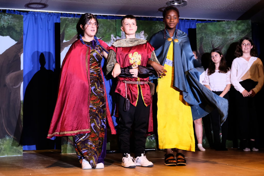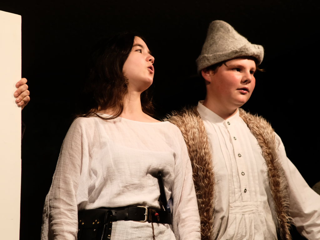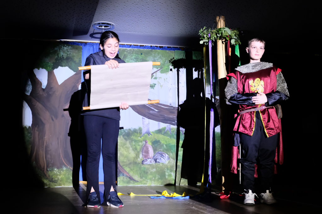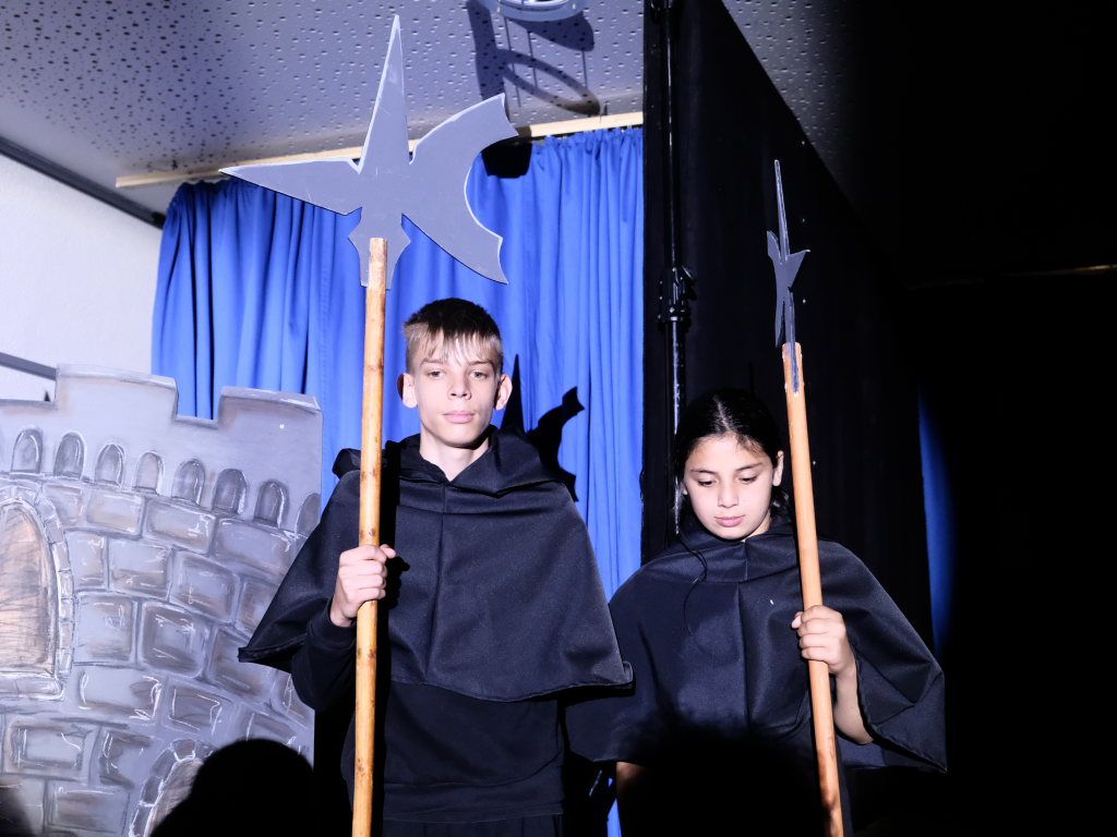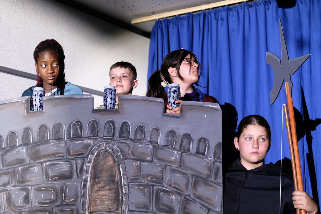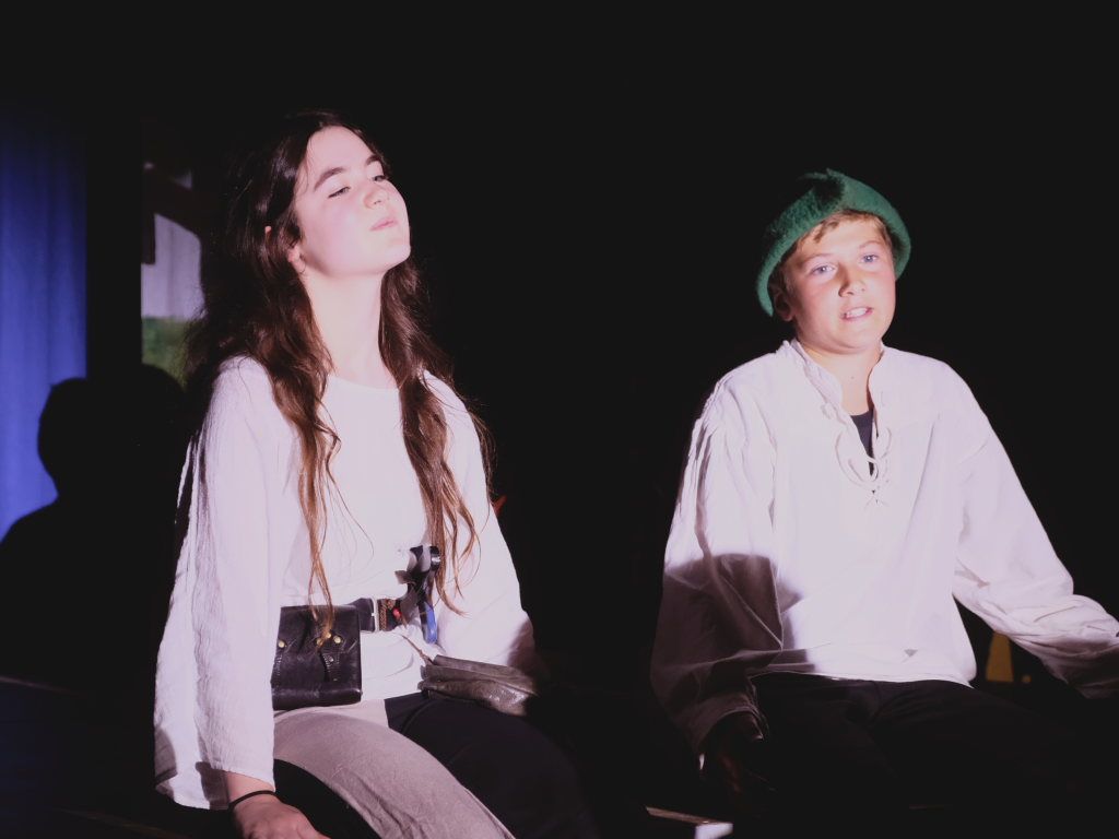 Ganz zu schweigen vom Ensemble auf der Bühne: Bei Luca Friedl als Robin Hood und Luan Blini als intrigantem Sheriff von Nottingham brannte jedesmal – im übertragenen Sinne – die Luft, wenn die beiden aufeinandertrafen. Gemeinsam mit Maren Distel als wehrhafte Marian und Nic Binder als knuddeligem Little Jon bildeten die Siebtklässler das Darstellergerippe, um das sich die jüngeren Darsteller aus der fünften und sechsten Klasse scharten. Sogar einen richtigen Stunt haben die Macher für den Robin Hood Darsteller mit eingebaut: beim Stockkampf mit Little Jon landet dieser im Bach, bzw. vor der Bühne.
