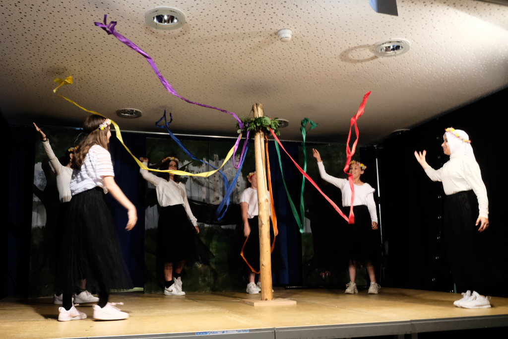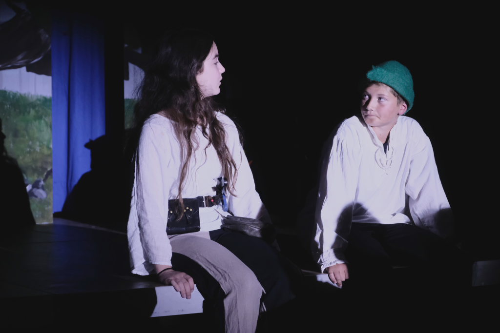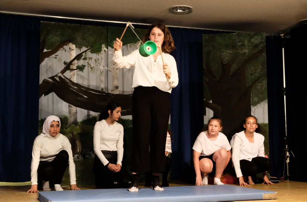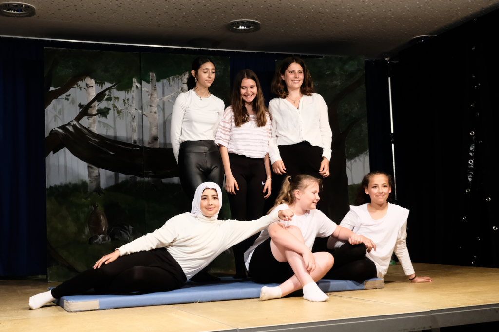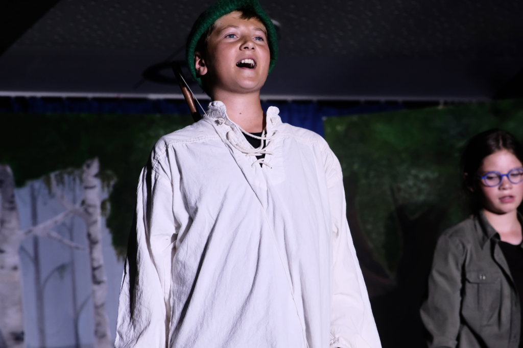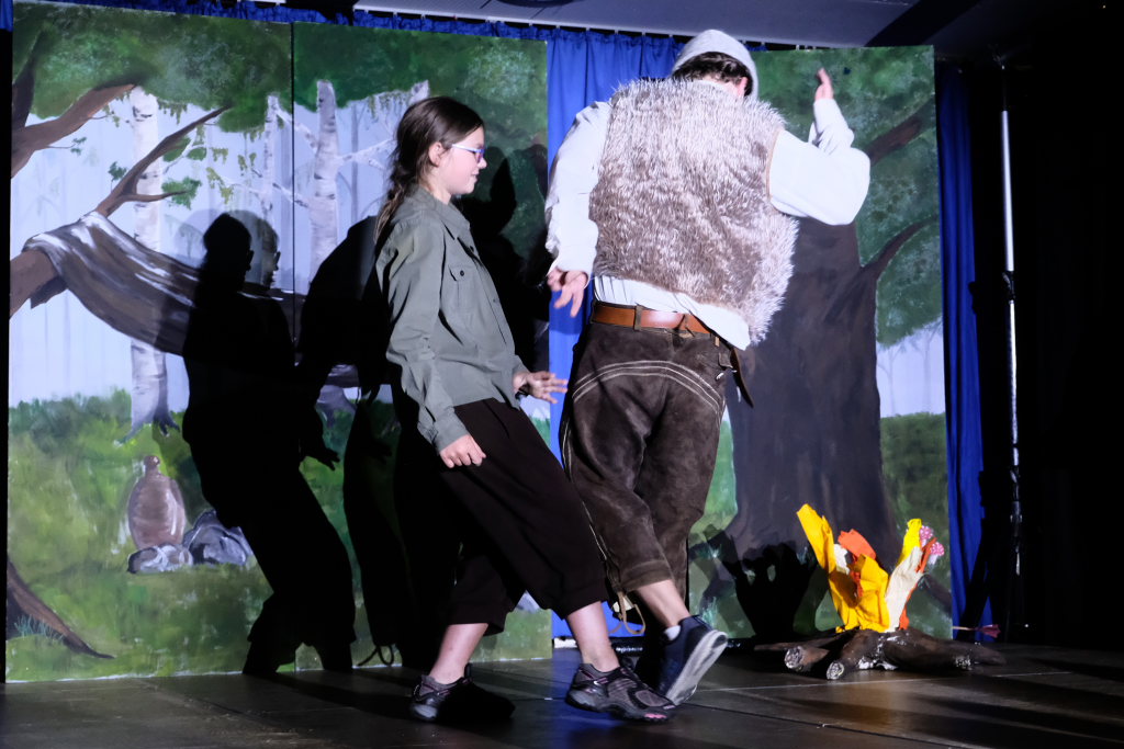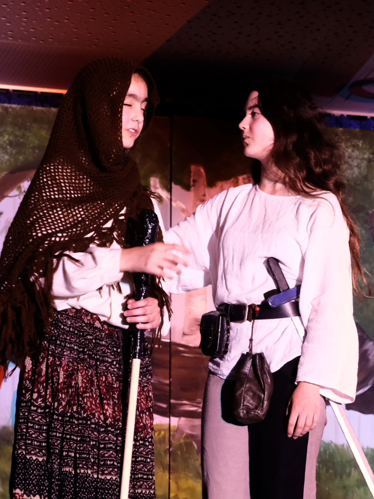 Ganz zu schweigen vom Ensemble auf der Bühne: Bei Luca Friedl als Robin Hood und Luan Blini als intrigantem Sheriff von Nottingham brannte jedesmal – im übertragenen Sinne – die Luft, wenn die beiden aufeinandertrafen. Gemeinsam mit Maren Distel als wehrhafte Marian und Nic Binder als knuddeligem Little Jon bildeten die Siebtklässler das Darstellergerippe, um das sich die jüngeren Darsteller aus der fünften und sechsten Klasse scharten. Sogar einen richtigen Stunt haben die Macher für den Robin Hood Darsteller mit eingebaut: beim Stockkampf mit Little Jon landet dieser im Bach, bzw. vor der Bühne.