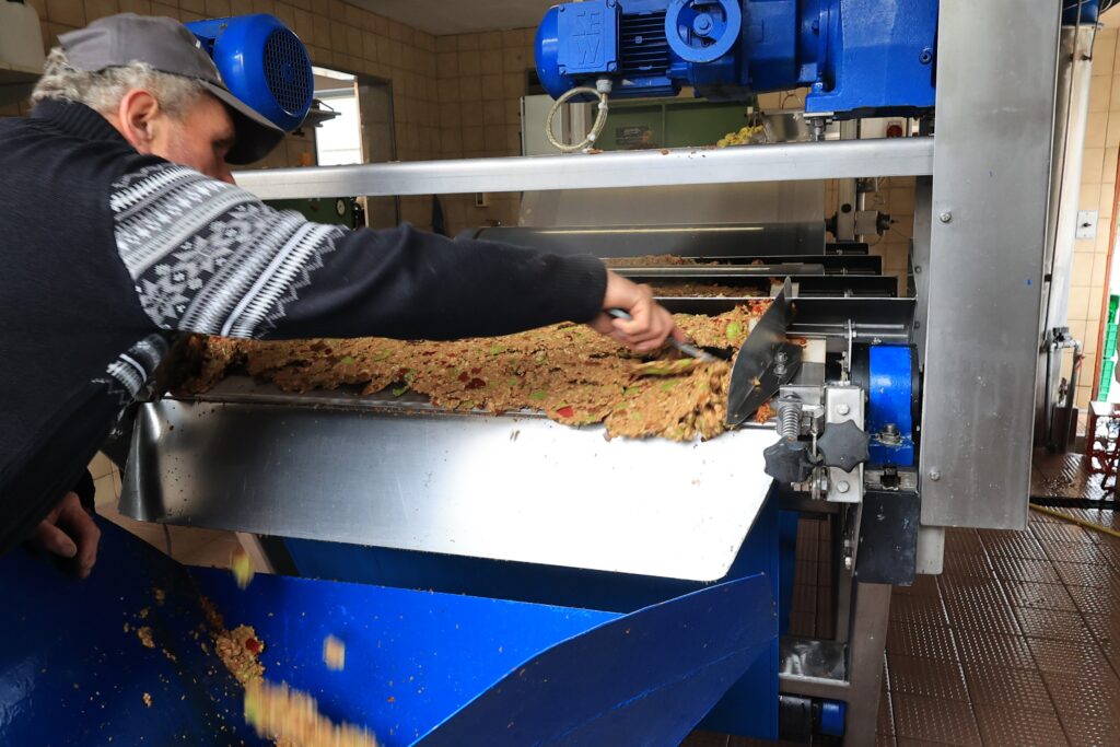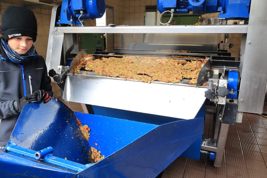 Am Ende der Press-Straße kommt der Treber heraus – Futter für das Wild.