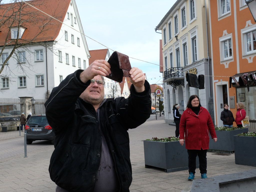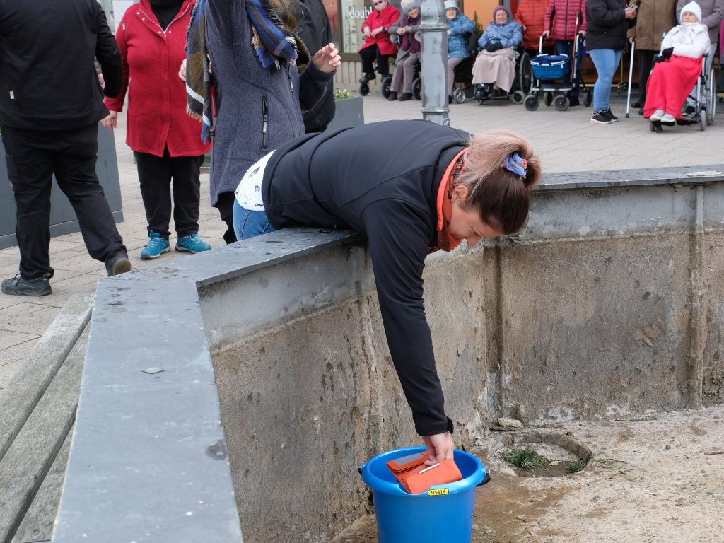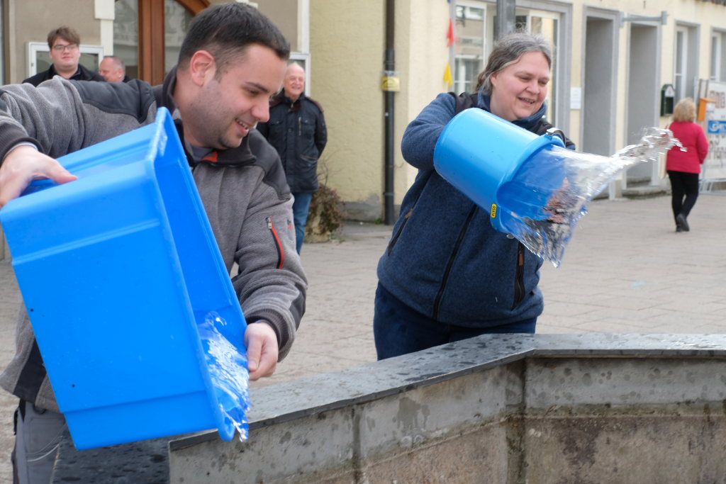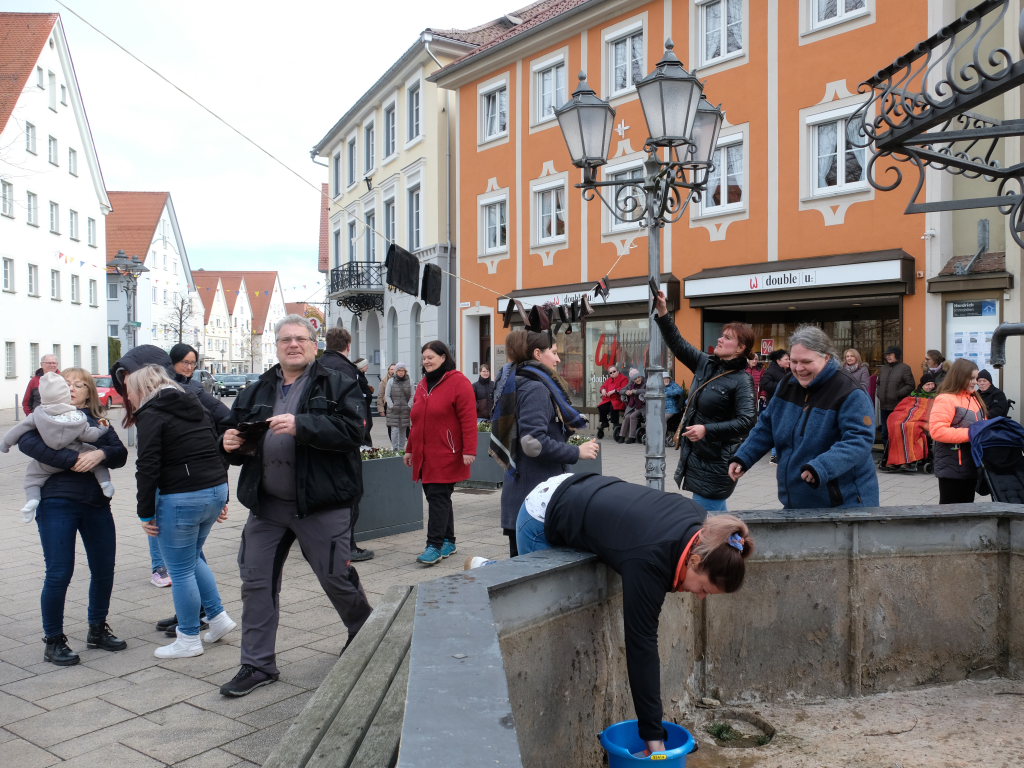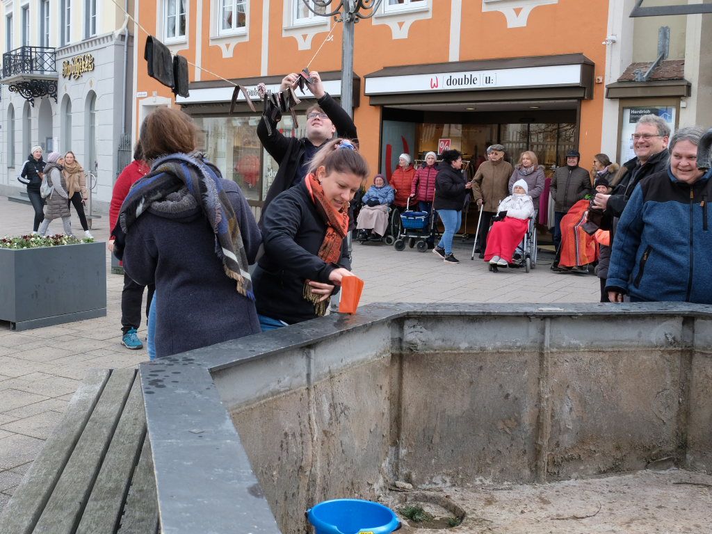 Bad Wurzach – Wie immer am Aschermittwoch um 11.11 Uhr trafen sich auch dieses Jahr wieder Mitglieder Riedmeckelerzunft Bad Wurzach am Stadtbrunnen zur traditionellen „Geldbeutelwäsche“. Um dort mit warmen Wasser aus Plastikeimern – der Stadtbrunnen war noch trockengelegt – ihre vom vielen Feiern leeren Geldbeutel zu reinigen. Damit soll – einer alten Mär zufolge – frisches Geld für die am 11.11. beginnende Saison 2024/25 in den Beutel zurückgespült werden.
