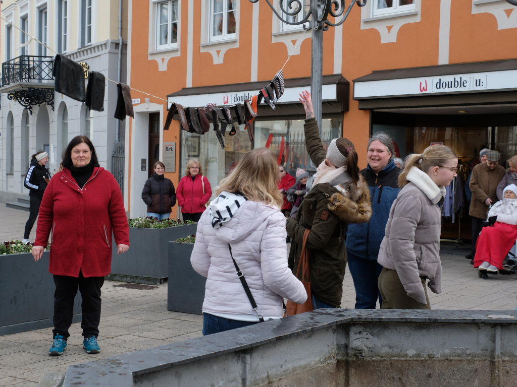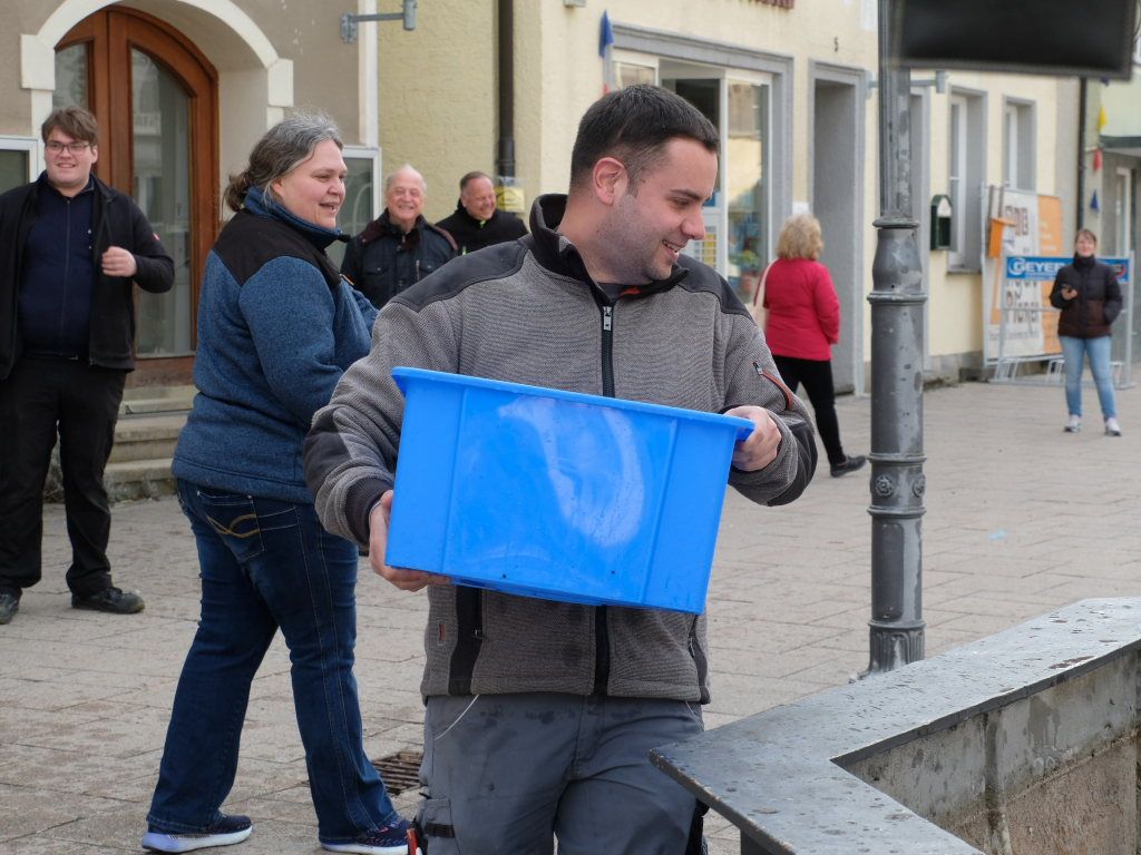 Nach der Geldbeutelwäsche folgte nun der letzte Arbeitseinsatz der diesjährigen Fasnetssaison. Die Geldbeutelwäsche ist nämlich nur die spaßmachende und motivierende Kür: Der Hauptgrund, warum man sich am Stadtbrunnen traf, waren die in den Stadtfarben Rot, Gelb und Blau gehaltenen Fasnetswimpel und -bändel, die den auswärtigen Hästrägern und Zuschauern beim Narrensprung den Umzugsweg markierten, einzuholen. Diese mussten wieder abgehängt werden und für die nächste Saison eingelagert werden, um den Straßen der Stadt wieder ein der Fastenzeit angemessenes Aussehen zu verleihen.