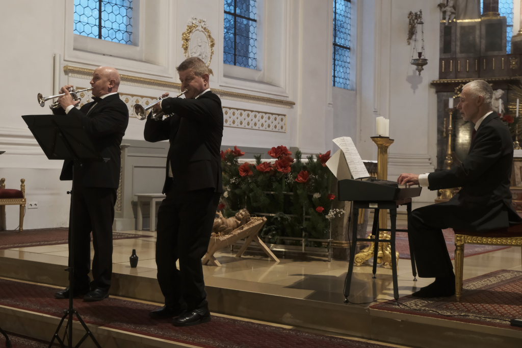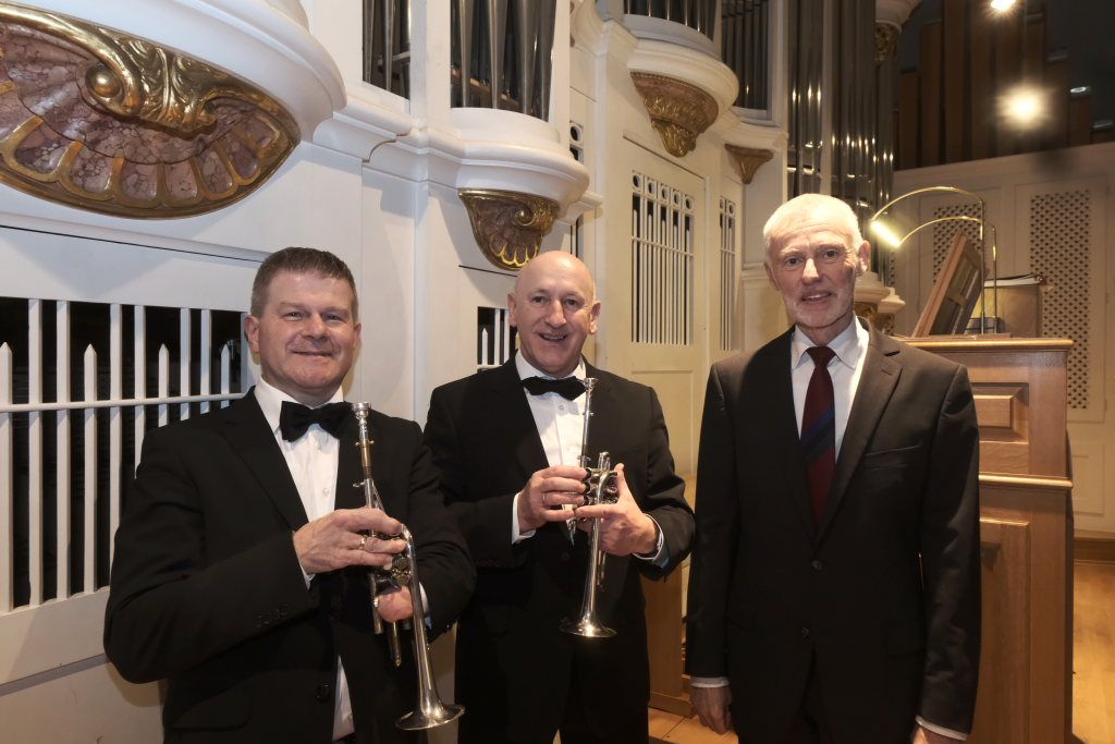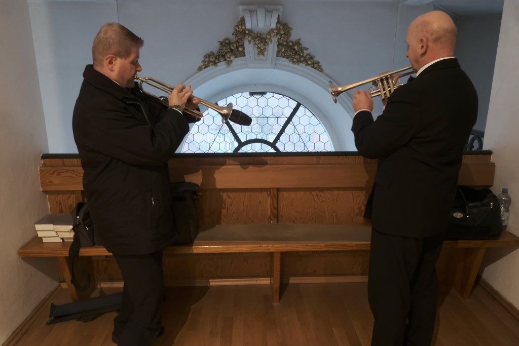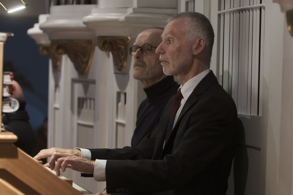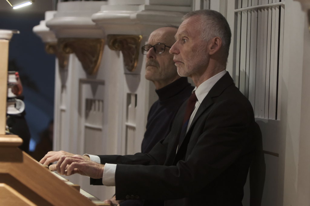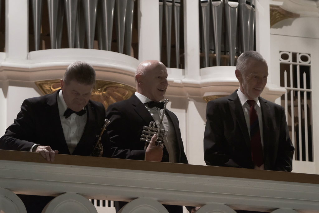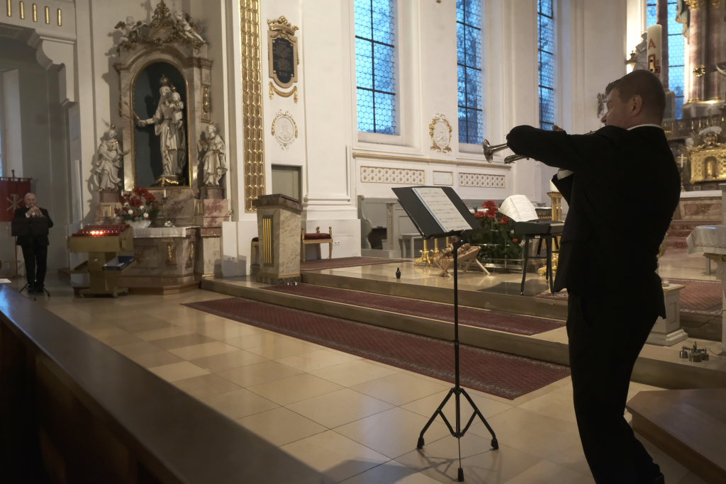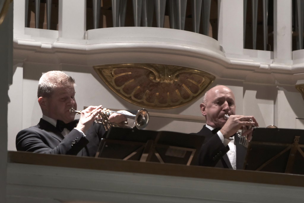 Spielten die drei die meiste Zeit auf der Orgelempore, also im Rücken der Zuhörer, war dies beim Concerto Nr. 3 (Allegro – Grave – Allegro) des italienischen Barockkomponisten Giuseppe Aldrovandini (1665 – 1707) anders. Hier konzertierten die drei Musiker vom Chorraum aus – sozusagen im Angesicht des Publikums. Während sich Robert Häusle nach dieser Komposition bereits wieder auf den Weg hinauf zur großen Kirchenorgel machte, boten die beiden Trompeter bei der Eigenkomposition von Hermann Ulmschneider „Signale für zwei Trompeten“ mit ihrem musikalischen Frage- und Antwort-Spiel von den Seitenaltären noch einen kleinen Showeffekt.