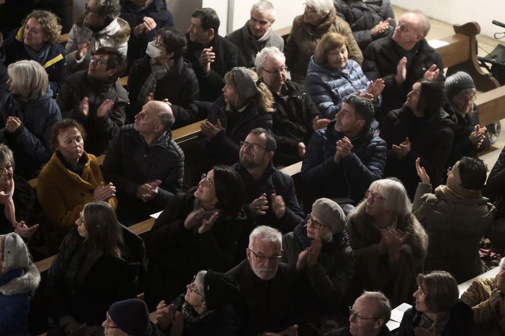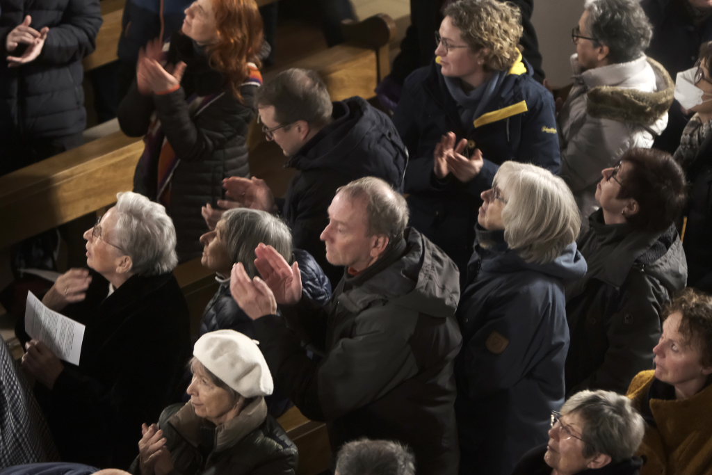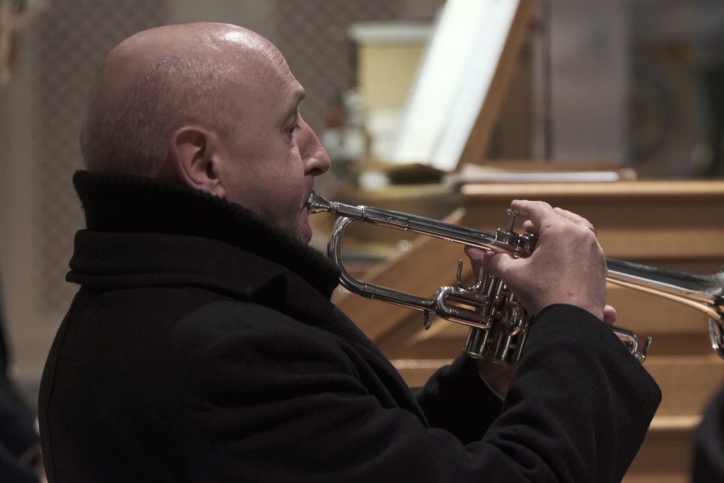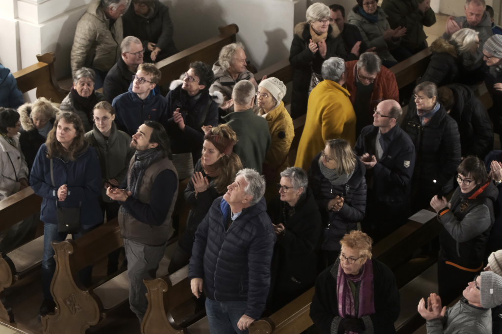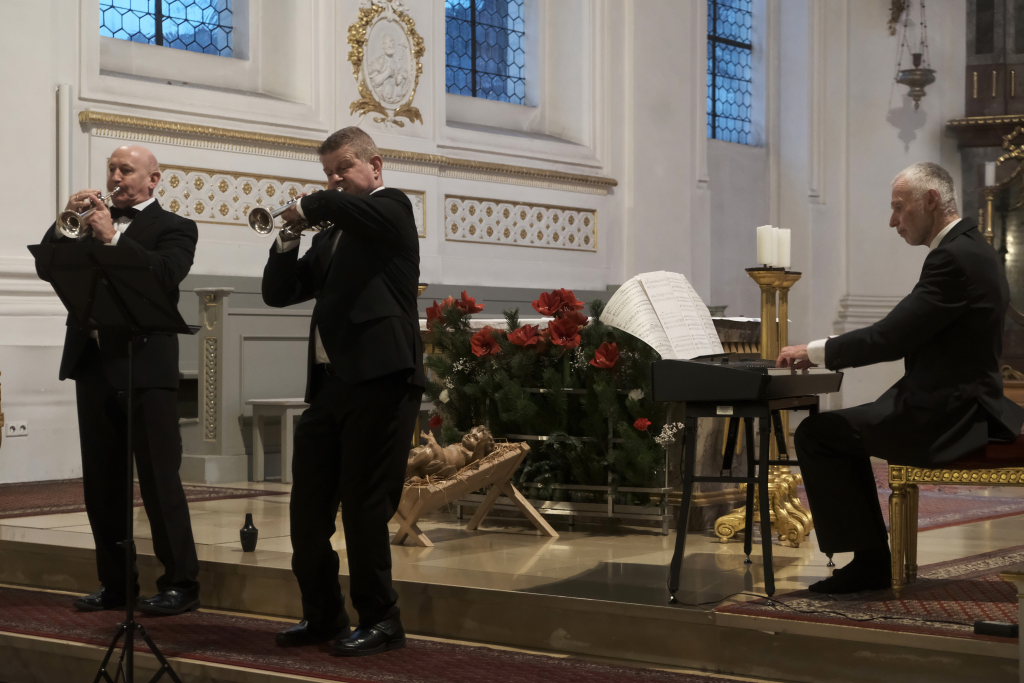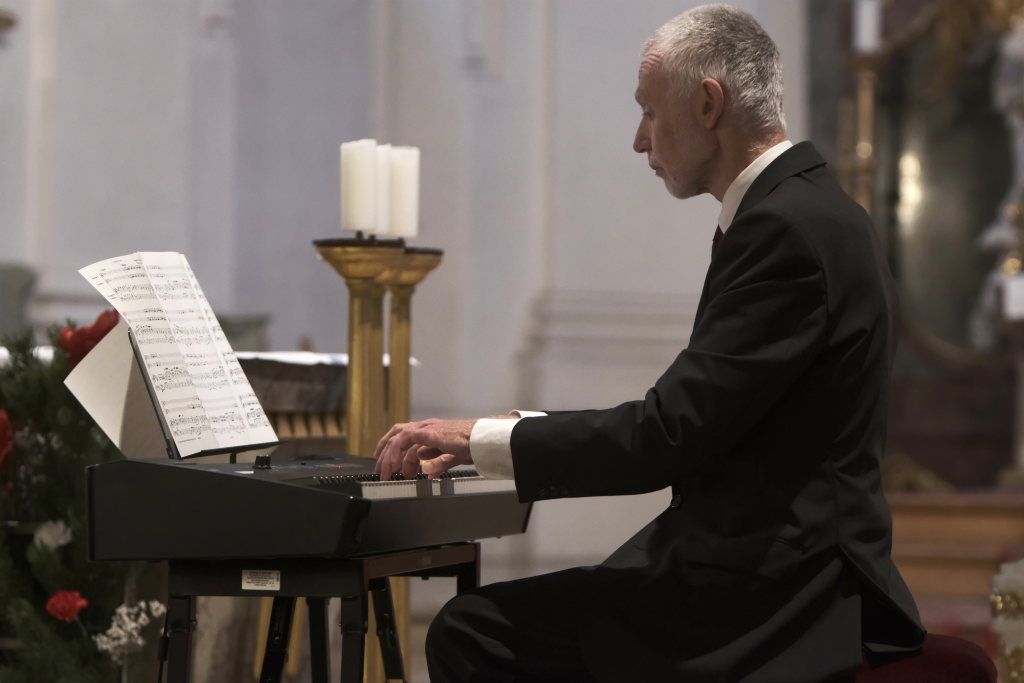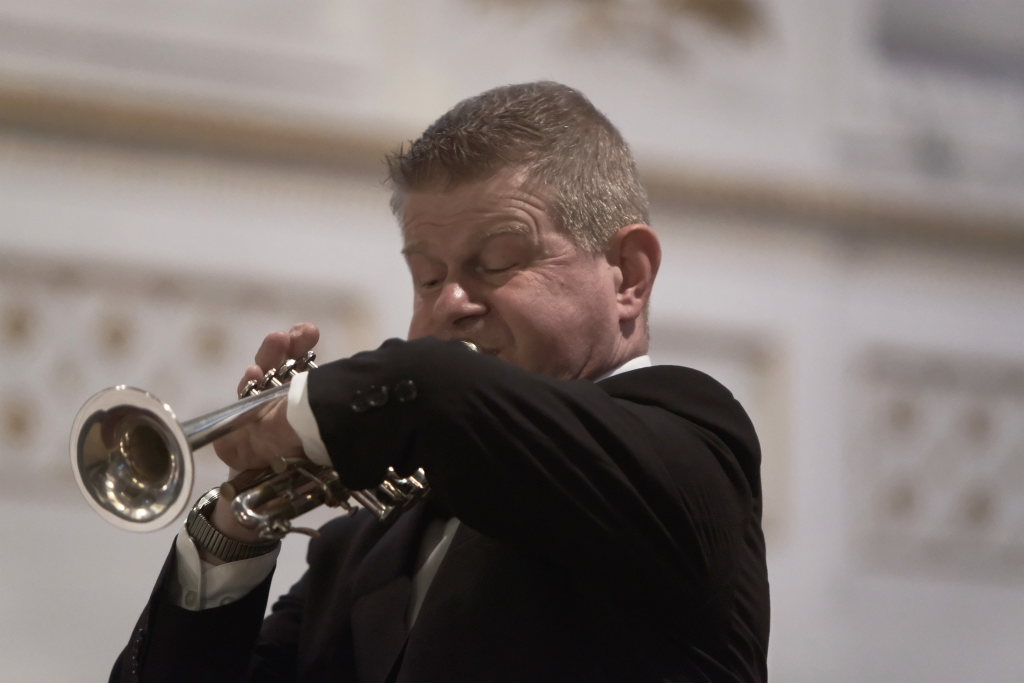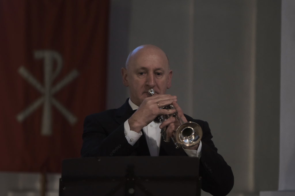 Spielten die drei die meiste Zeit auf der Orgelempore, also im Rücken der Zuhörer, war dies beim Concerto Nr. 3 (Allegro – Grave – Allegro) des italienischen Barockkomponisten Giuseppe Aldrovandini (1665 – 1707) anders. Hier konzertierten die drei Musiker vom Chorraum aus – sozusagen im Angesicht des Publikums. Während sich Robert Häusle nach dieser Komposition bereits wieder auf den Weg hinauf zur großen Kirchenorgel machte, boten die beiden Trompeter bei der Eigenkomposition von Hermann Ulmschneider „Signale für zwei Trompeten“ mit ihrem musikalischen Frage- und Antwort-Spiel von den Seitenaltären noch einen kleinen Showeffekt.