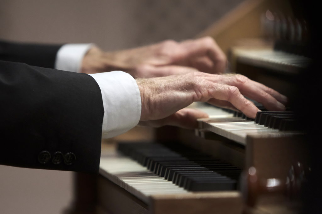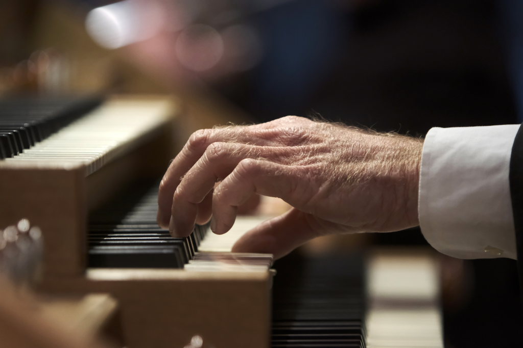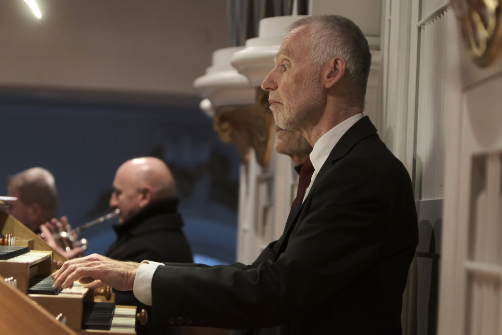 Robert Häusle spielte bei diesem Silvesterkonzert als Solist die Sonate Nr. 4 B-Dur op. 65, von Felix Mendelssohn Bartholdy – zunächst die Sätze Allegro con brio und während die Trompeter sich auf den Weg in den Chorraum machten, den Satz Andante religioso. Danach bei deren Aufstieg zur Empore den 3. Satz Allegretto des trotz seines nur 39 Jahren währenden Lebens sehr produktiven Komponisten der Romantik aus Hamburg. Und schließlich als vorletztes Stück des Programmes den Satz „Allegro maestoso e vivace“.