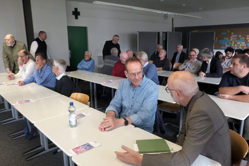 Pater Michael Overmann, der Archivar der Deutschen Provinz, der auch bei der Erstellung der Chronik zum Jubiläum des Salvatorkollegs seinen Teil beigetragen hatte, stellte sein aktuelles Projekt vor: Es ging um die künstlerischen Nachlässe einiger verstorbenen Patres, die er aktuell in das Archiv des Ordens einpflege. Sein Anliegen: Er möchte für die Künstler -Patres Pater Markwart Probst und insbesondere Pater Egino Manall, der viele Jahre am Salvatorkolleg Bad Wurzach als Lehrer gewirkt hatte, eigene Homepages erstellen lassen. Um einen möglichst guten Überblick über dessen Werk zu bekommen, bat er die Anwesenden, möglichst viele Werke im Privatbesitz zu melden, so dass er sie für das Archiv und die Homepage erfassen könne. Da das Erstellen einer Homepage viel Geld koste, ließ er im Foyer auf einem Smartboard eine kleine Werkschau Manall´s laufen, mit dem Ziel, durch die Abgabe der gezeigten Werke gegen Spenden das dafür erforderliche „Kleingeld“ zu erhalten.