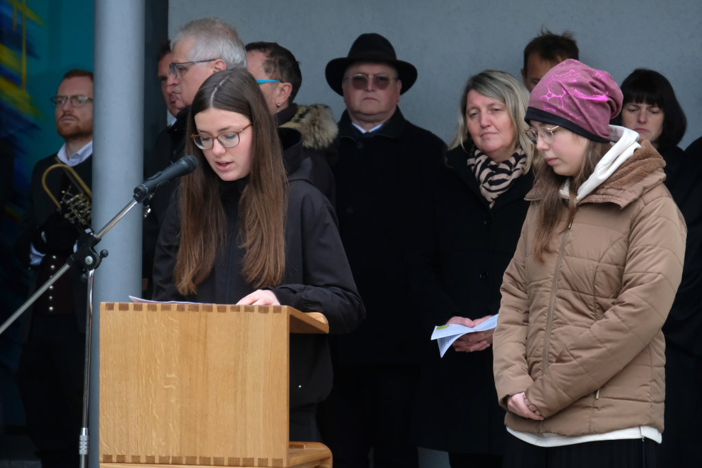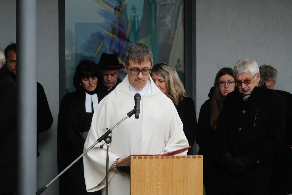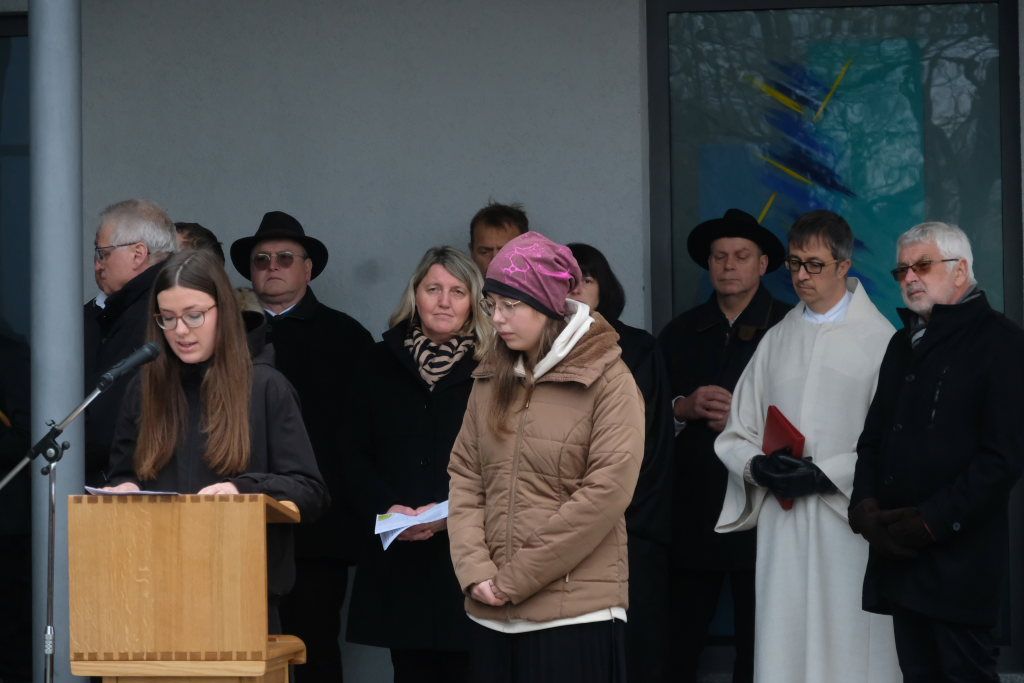 Pfarrerin Cora Boettiger und Pastoralreferent Raimund Miller waren mit ihren Gebeten für Frieden und Freiheit für den kirchlichen Teil der Feier zuständig. Boettiger bat in ihrem Gebet darum, dankbar zu sein für alle Gesten der Versöhnung nach den beiden Weltkriegen. Und auch das Gedenken an die Opfer der Konzentrationslager ebenso wie das der Widerstandskämpfer weiterhin hochzuhalten. „Gib uns die Kraft, öffentlich und mit Zivilcourage gegen Unrecht und Lüge aufzutreten.“ „Wir bitten Dich für einen gerechten Frieden für alle Menschen im Nahen Osten, in der Ukraine und in den vielen weniger beachteten Kriegsgebieten der Welt.“ Raimund Miller betete für die Menschen von Verfolgung und Terror, dass sie diese überstehen und ihr Leben neu aufzubauen vermögen. Er betete für alle, die für die Menschlichkeit arbeiteten, die Gewalt abbauen und Frieden aufbauen helfen.