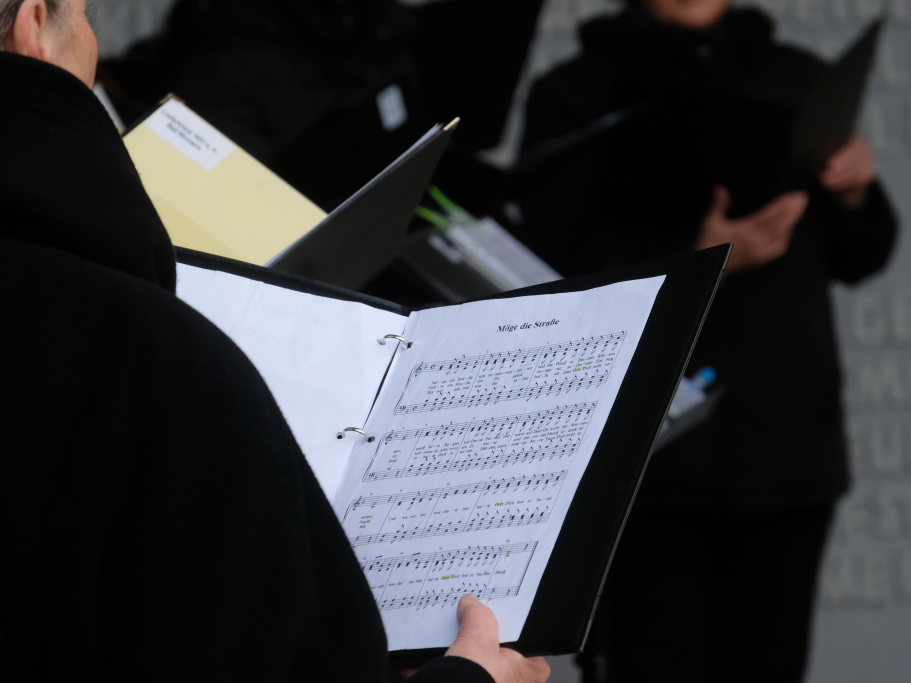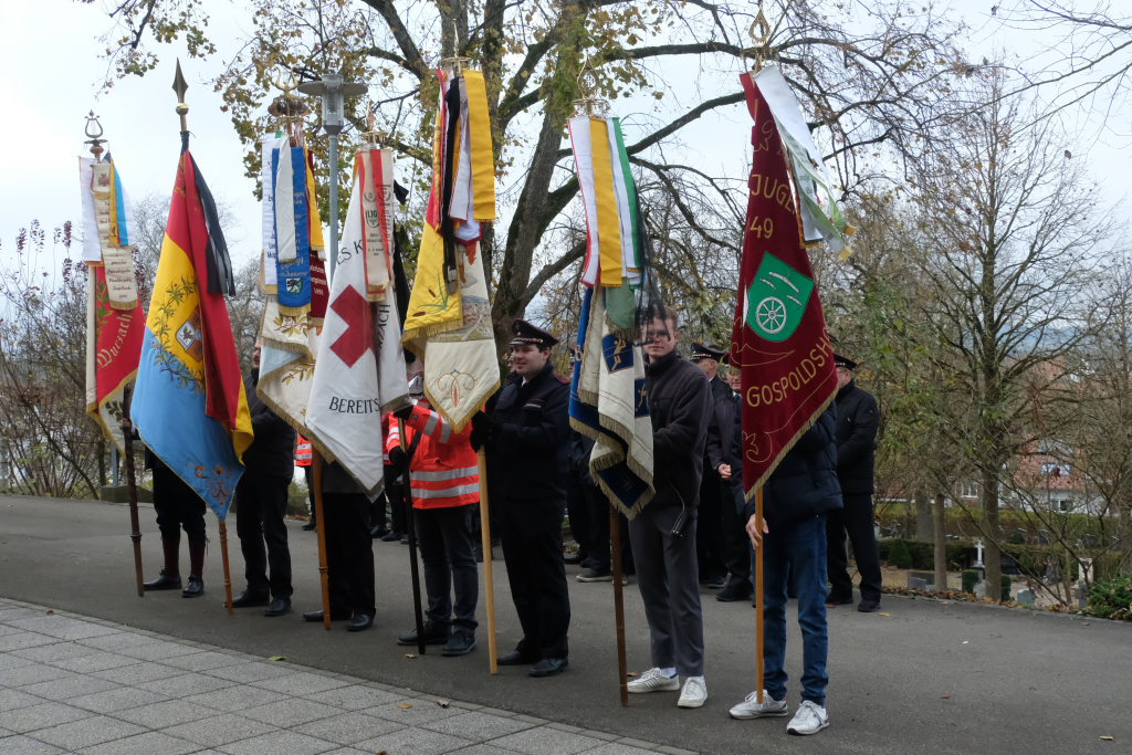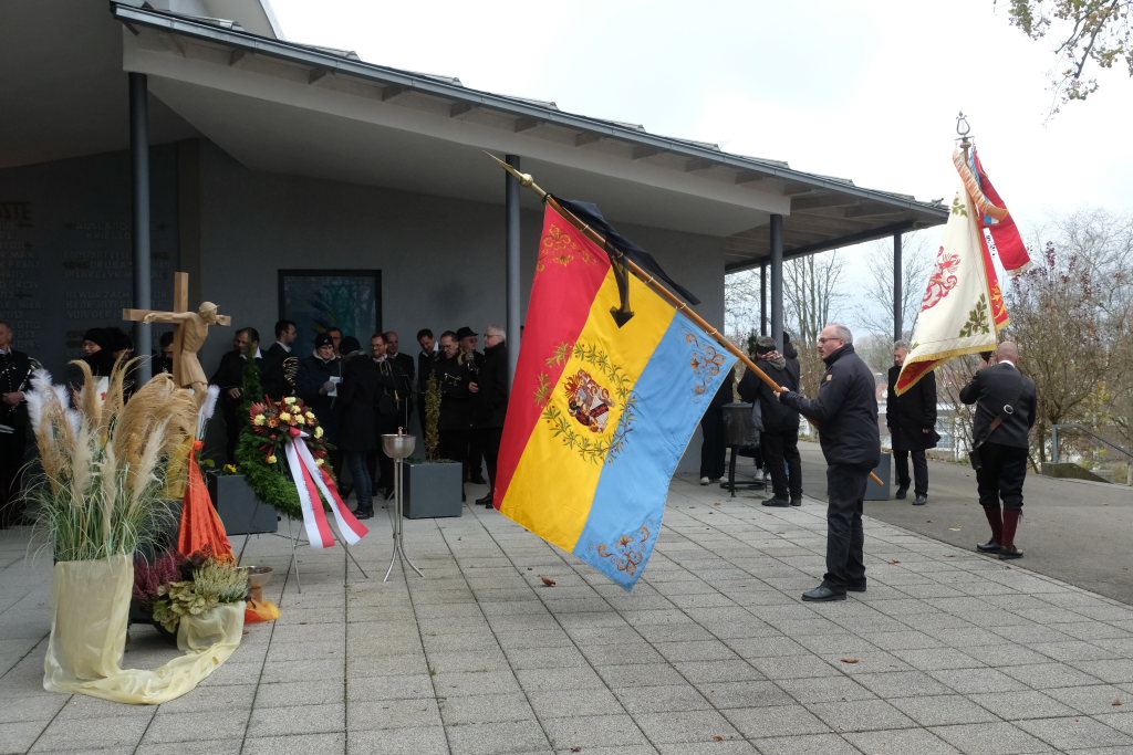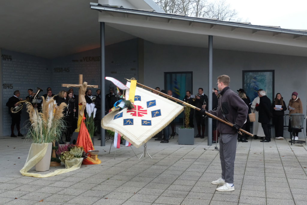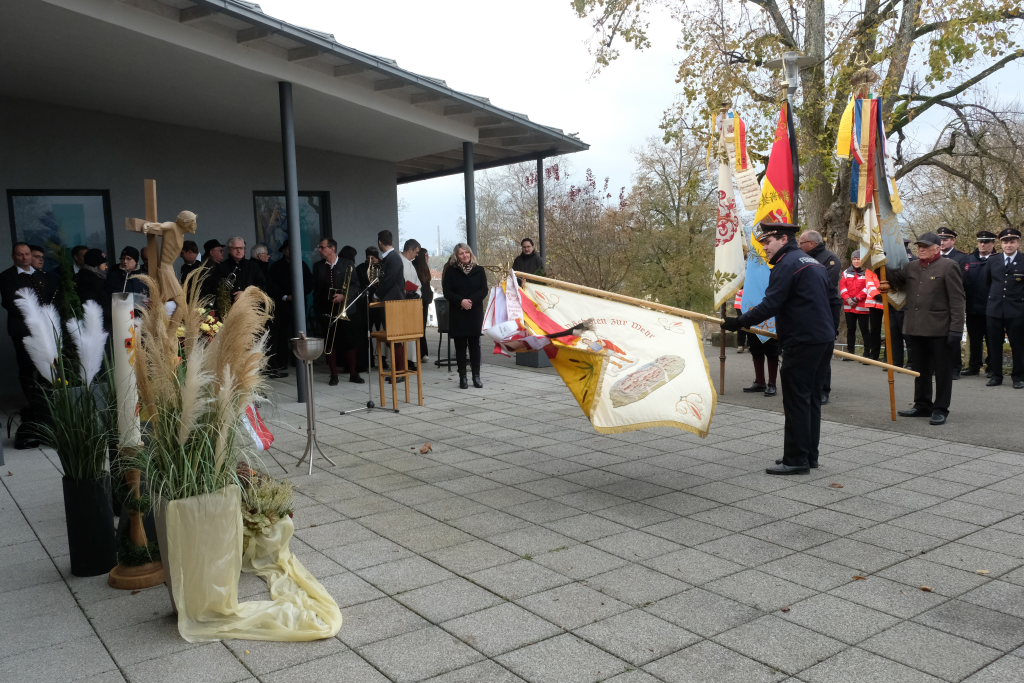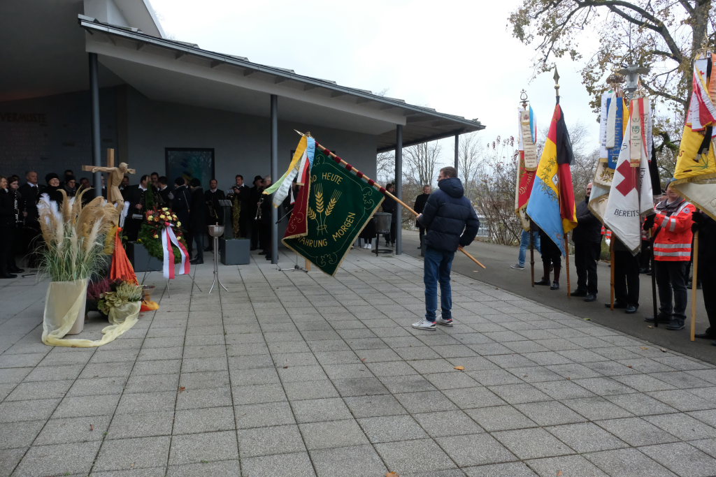 Die Stadtkapelle, die gemeinsam mit dem Liederkranz Chorioso den musikalischen Part der Gedenkveranstaltung bestritt, eröffnete die Feier musikalisch mit einem Choral, während die Fähnriche der teilnehmenden Vereine ihre Fahnen zum Gedenken an die Toten senkten.