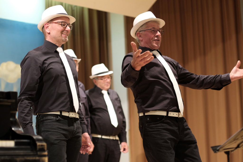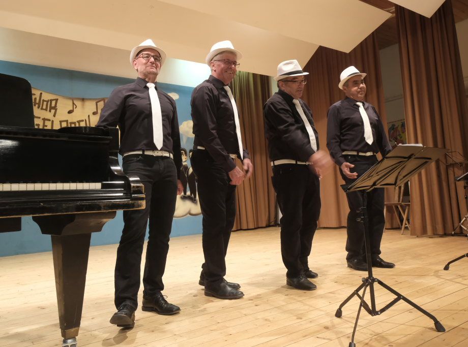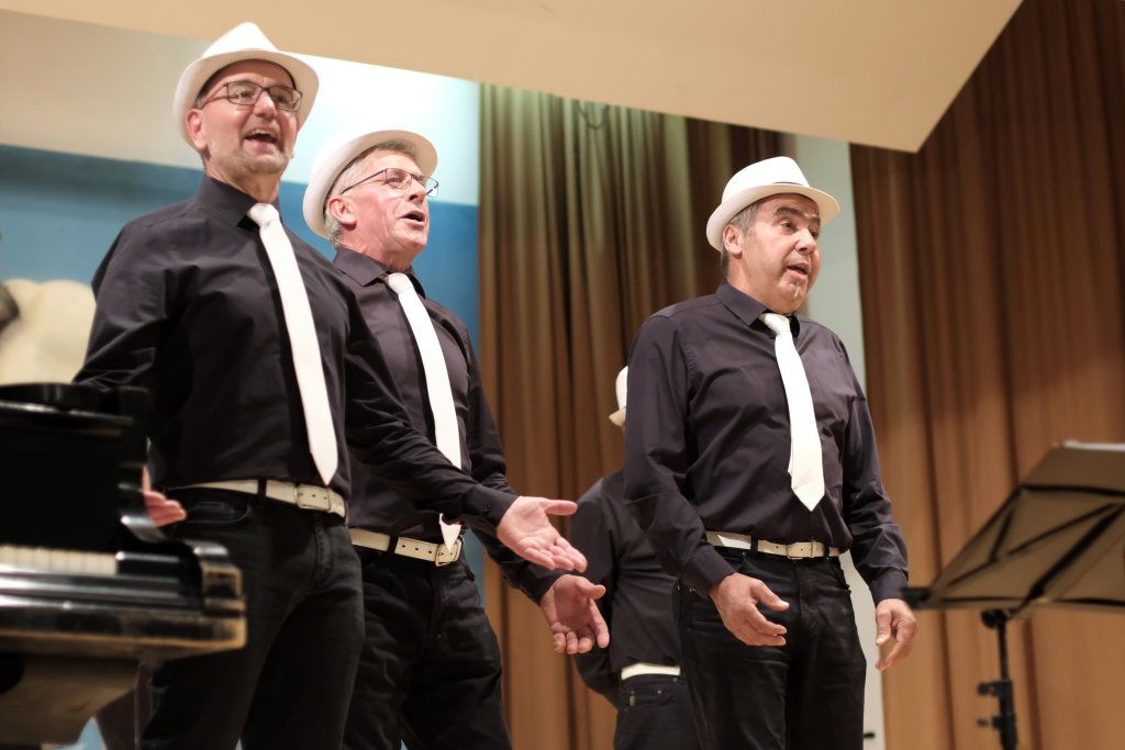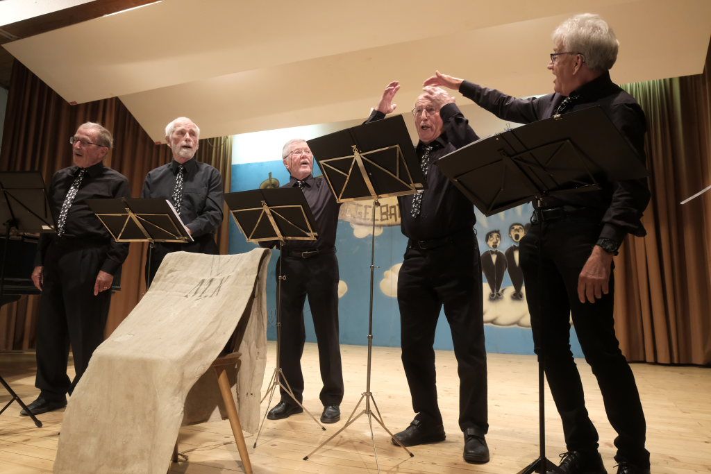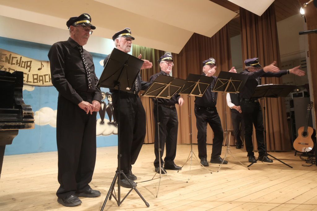 Die Schmalegger Hofsänger stellten sich mit dem Stück „Hallo Mitanand“ nochmals persönlich vor. Danach ließen die Sänger den beliebten Schlager „Veronika, der Lenz ist da“ folgen, der erstmals 1930 von den Comedian Harmonists auf die Bühne gebracht worden war.