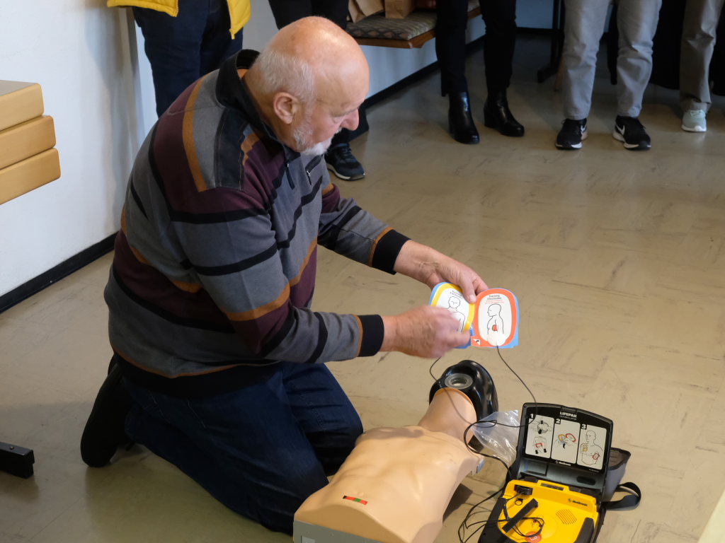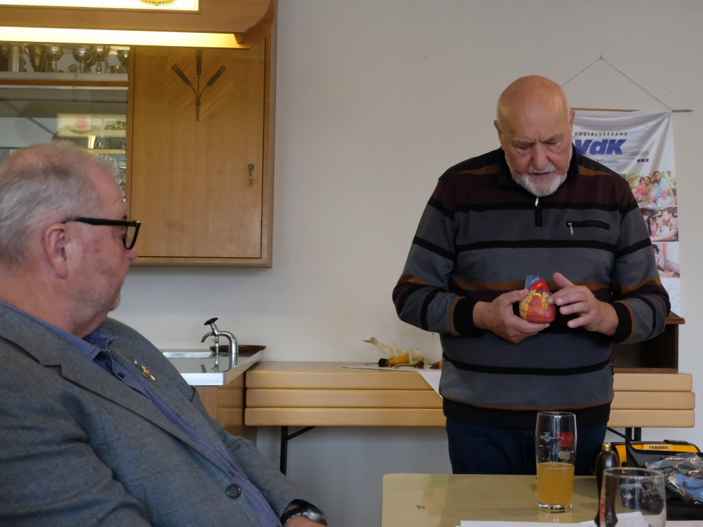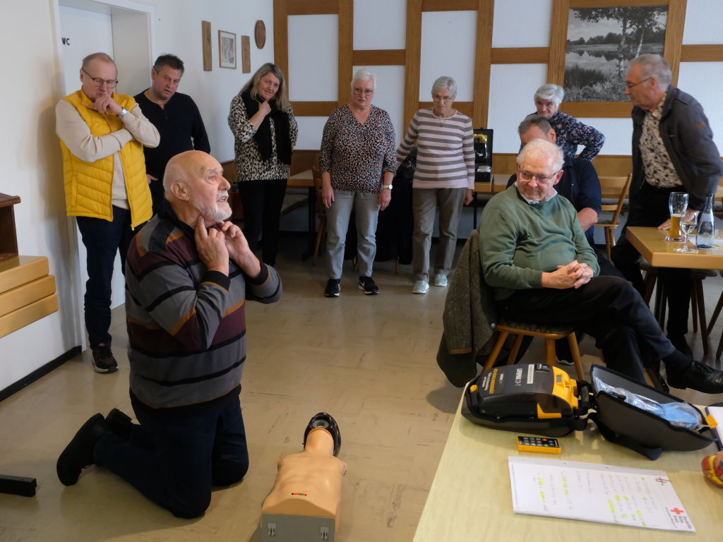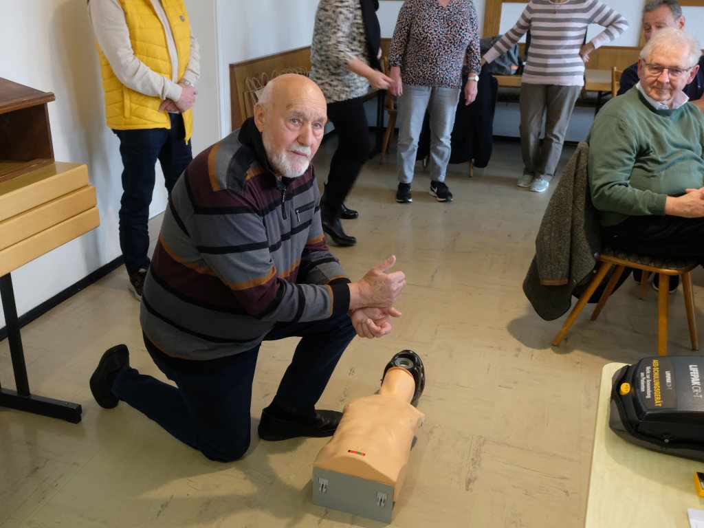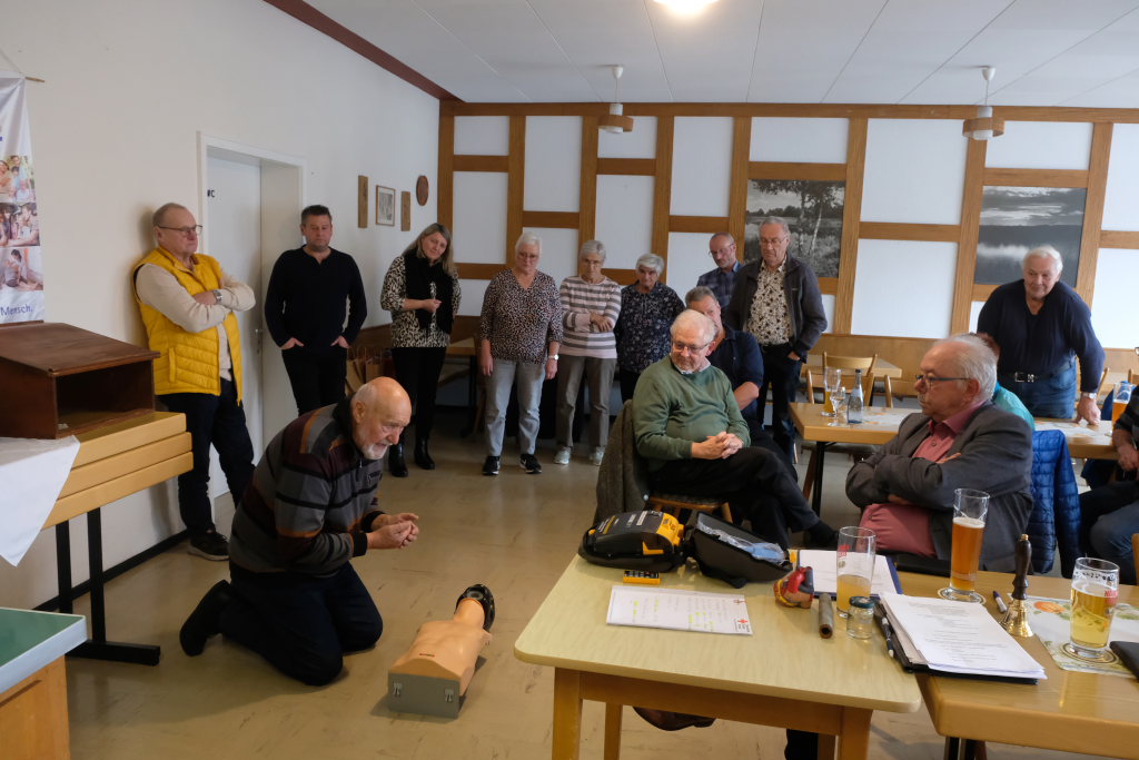 Franz Häckler arbeitet seit vielen Jahren als Rettungssanitäter und konnte vom Vorstand auch für dieses Jahr für einen Vortrag gewonnen werden. Sein Thema, das alle angeht: Was tun, wenn jemand mit einem Herzinfarkt zusammenbricht? Der einzige Fehler, den man dabei machen kann sei – nichts zu tun! Anhand eines Übungstorsos zeigte er, wie man, nachdem der Notruf abgesetzt worden ist, Wiederbelebungsversuche durch Herz-Druckmassage machen soll. Sollte ein Defibrillator greifbar sein, sollte auch dieser zum Einsatz kommen. Auch hier gelte: das Gerät sei selbsterklärend und nur durch sofort eingeleitete Maßnahmen hätten die Betroffenen reelle Chancen, zu überleben. Denn die wahren Lebensretter seien die Ersthelfer, der Rettungsdienst könne nur auf dem aufbauen, was diese vorher schon eingeleitet haben.