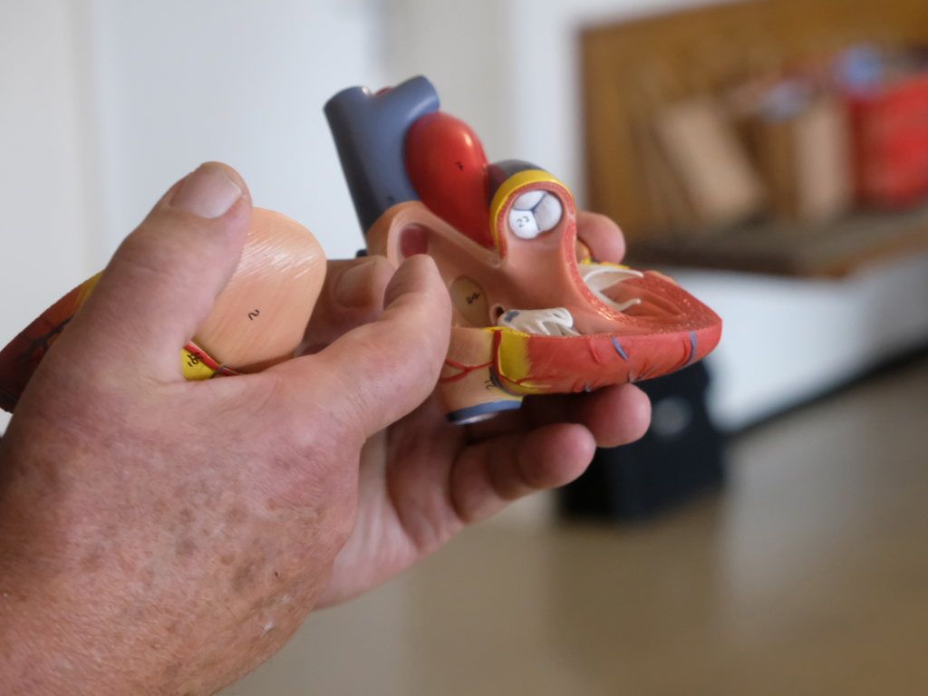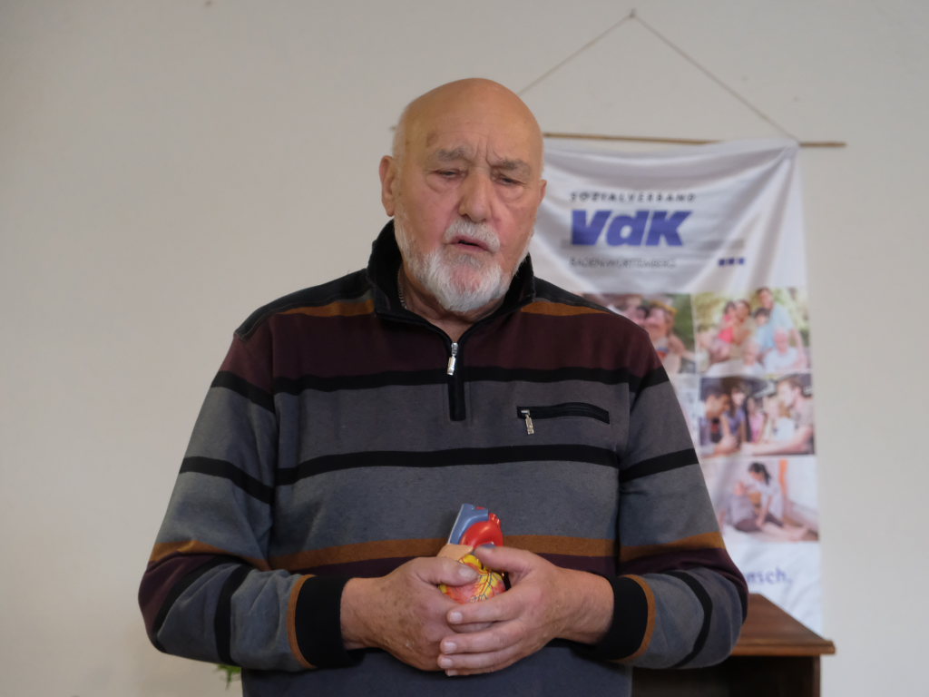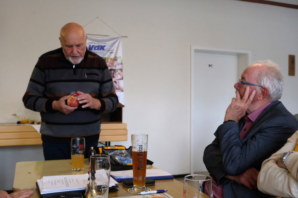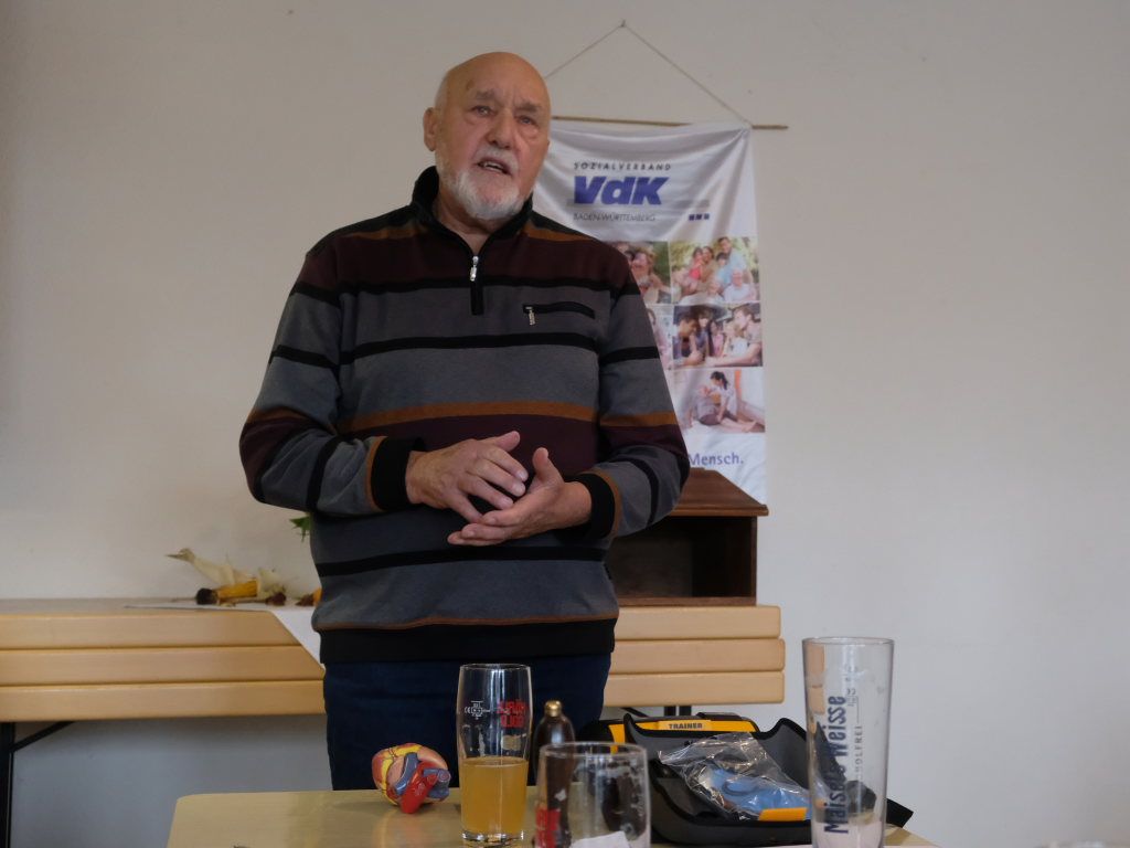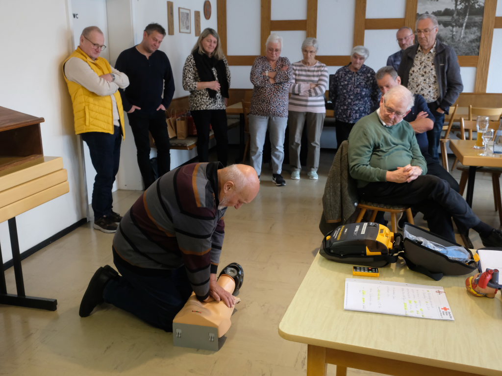 Franz Häckler arbeitet seit vielen Jahren als Rettungssanitäter und konnte vom Vorstand auch für dieses Jahr für einen Vortrag gewonnen werden. Sein Thema, das alle angeht: Was tun, wenn jemand mit einem Herzinfarkt zusammenbricht? Der einzige Fehler, den man dabei machen kann sei – nichts zu tun! Anhand eines Übungstorsos zeigte er, wie man, nachdem der Notruf abgesetzt worden ist, Wiederbelebungsversuche durch Herz-Druckmassage machen soll. Sollte ein Defibrillator greifbar sein, sollte auch dieser zum Einsatz kommen. Auch hier gelte: das Gerät sei selbsterklärend und nur durch sofort eingeleitete Maßnahmen hätten die Betroffenen reelle Chancen, zu überleben. Denn die wahren Lebensretter seien die Ersthelfer, der Rettungsdienst könne nur auf dem aufbauen, was diese vorher schon eingeleitet haben.