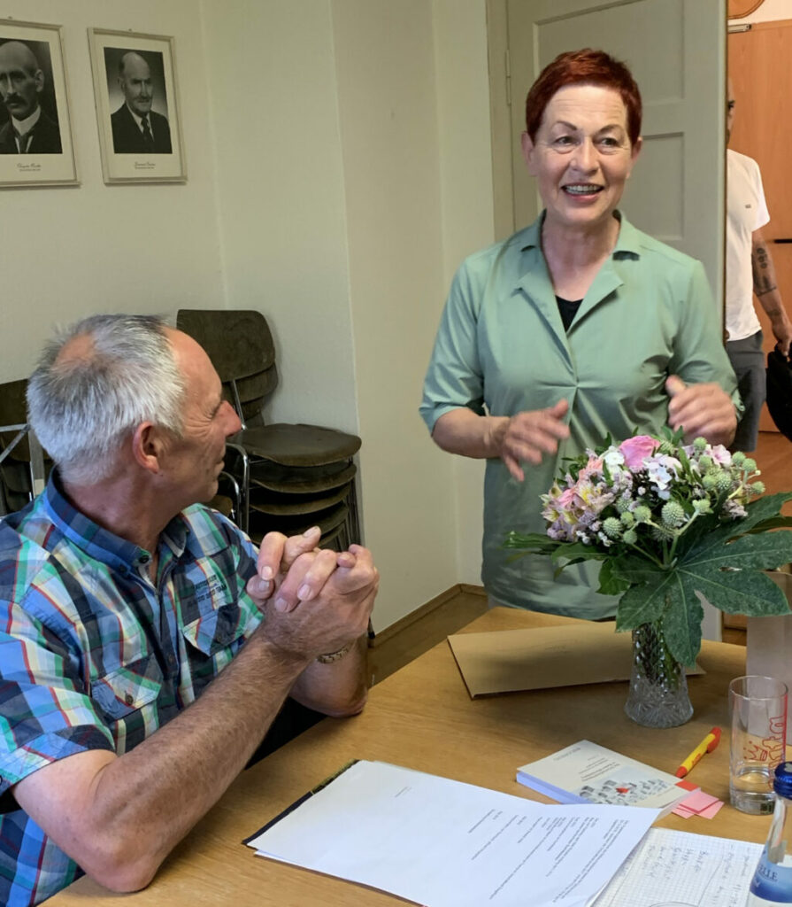 Die seitherige Ortschaftsrätin Sybille Schleweck schilderte die großen Verdienste des scheidenden Ortsvorstehers für die Menschen in Ziegelbach, seinen Fleiß, seine Kompetenz, die Menschlichkeit und Bürgernähe, die er in 25 Jahre in seiner Funktion als Ortsvorsteher gelebt habe. Bereits zehn Jahre zuvor war Alfons Reichle schon Ortschaftsrat gewesen, macht 35 Jahre Einsatz für die Allgemeinheit – neben Betreiben einer Landwirtschaft und natürlich Pflichten für die Familie. Lange applaudierten alle Anwesenden aus Respekt für diese vorbildliche Leistungsbereitschaft. Die Räte bedankten sich bei Alfons Reichle mit Gutscheinen für Besuche in der lokalen Gastronomie, mit einem von allen unterschriebenen Dankesbrief und mit einem großen Blumengebinde. Letzteres aber nicht für ihn selbst, sondern für seine Inge, die so oft auf ihn verzichten musste. Er habe ja nun viel mehr Zeit für persönliche Dinge, für den Hof und natürlich für seine Frau. Verschmitzt warf ein Rat ein, ob sich Inge denn nun freuen würde, wenn er so oft zu Hause sein wird. Reichle war sichtlich gerührt über so viel Wertschätzung und meinte, es habe auch schwierige oder ärgerliche Dinge gegeben, aber die Freude habe überwogen. Sein kurzes Schlusswort schließlich: „Bleibt alle gesund!“