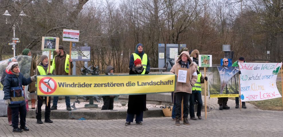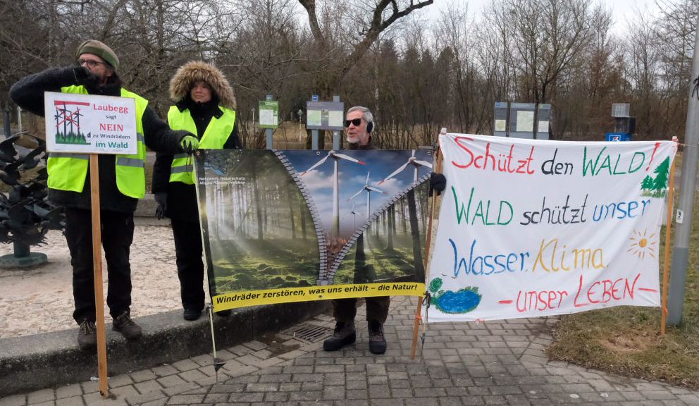 Einer der Hotspots der Windkraftplaner ist der Altdorfer Wald. Auch die Vertreter der dortigen Bürgerinitiativen machten ihrem Ärger über die dort geplante Landschafts- und Lebensraumzerstörung Luft. „Wer rettet den Altdorfer Wald?“ Nicht fehlen durften auch die Vertreter der Landschaftsschützer rund um Bad Wurzach: „Windräder gefährden das Europadiplom.“
